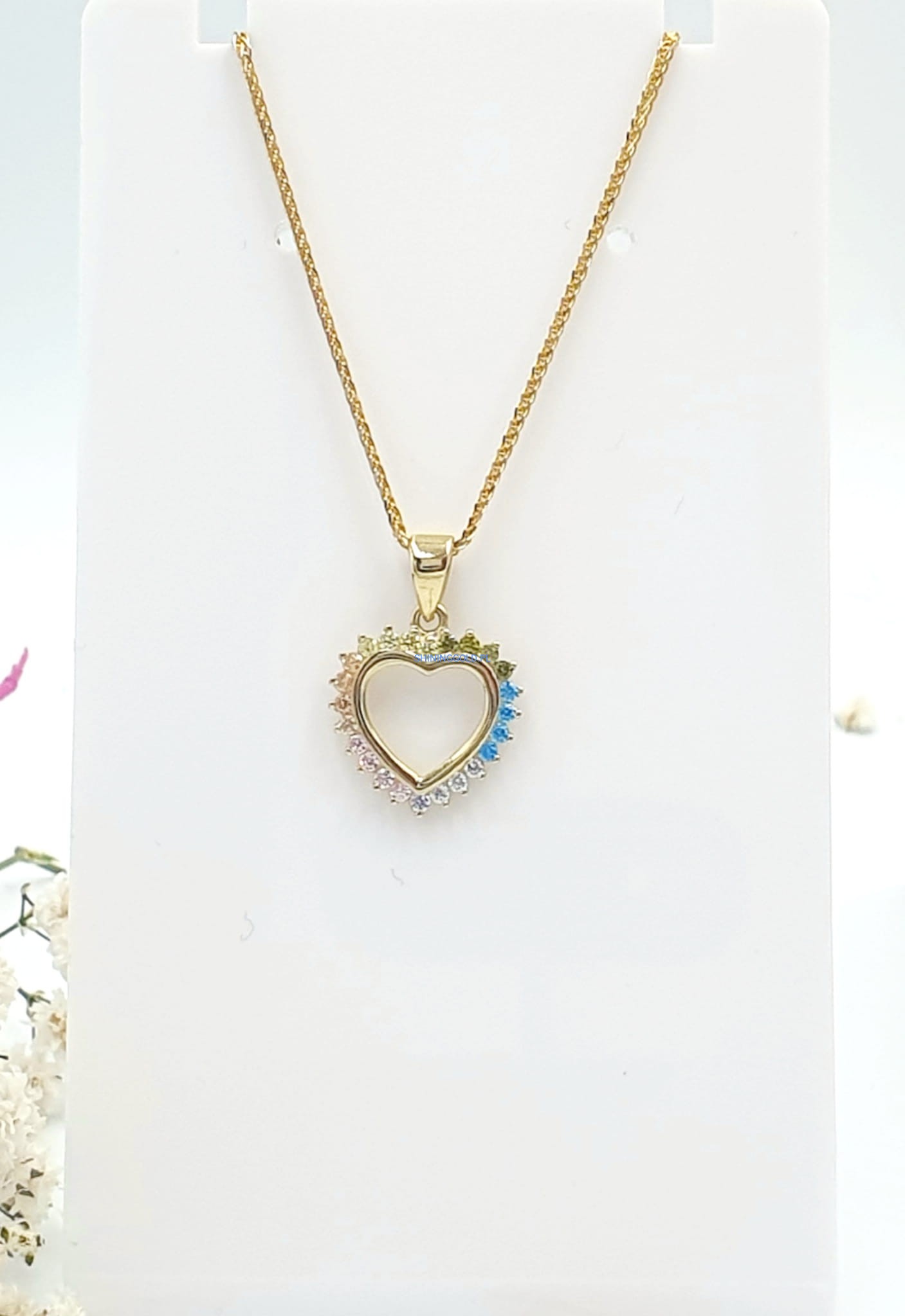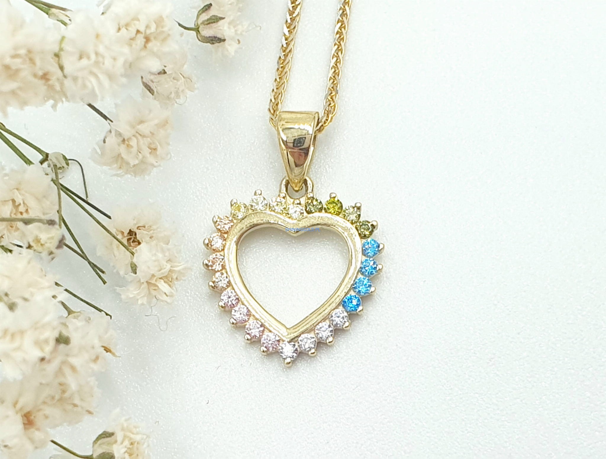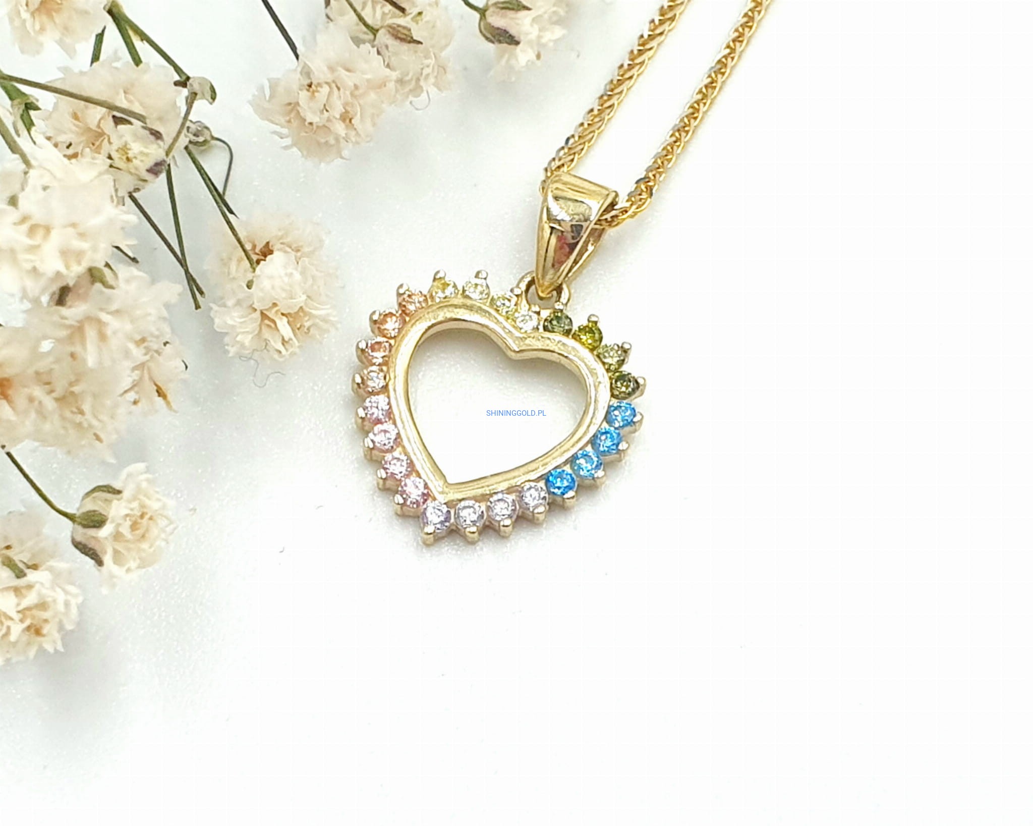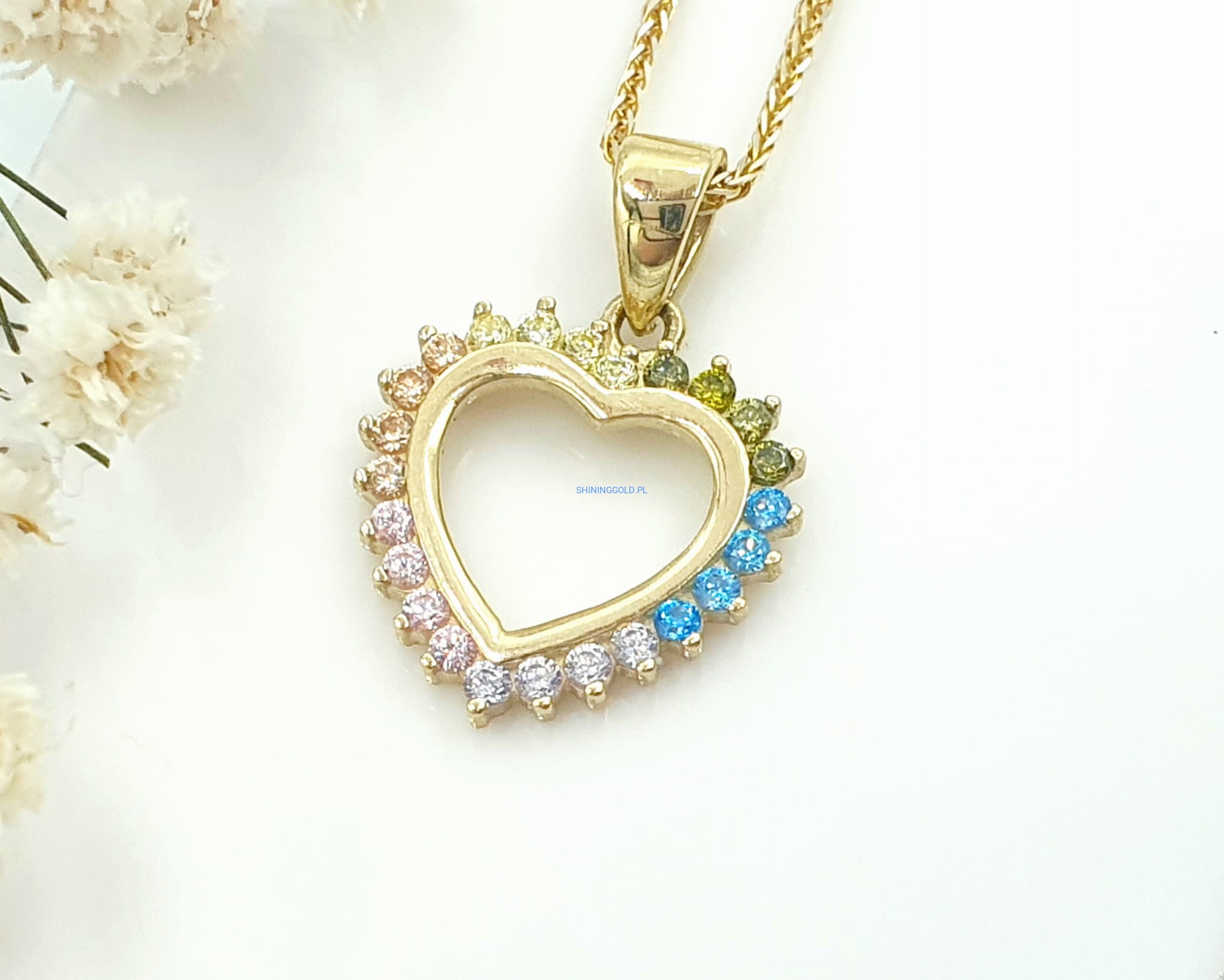 Złota, nowa zawieszka. Serce z kolorowymi cyrkoniami