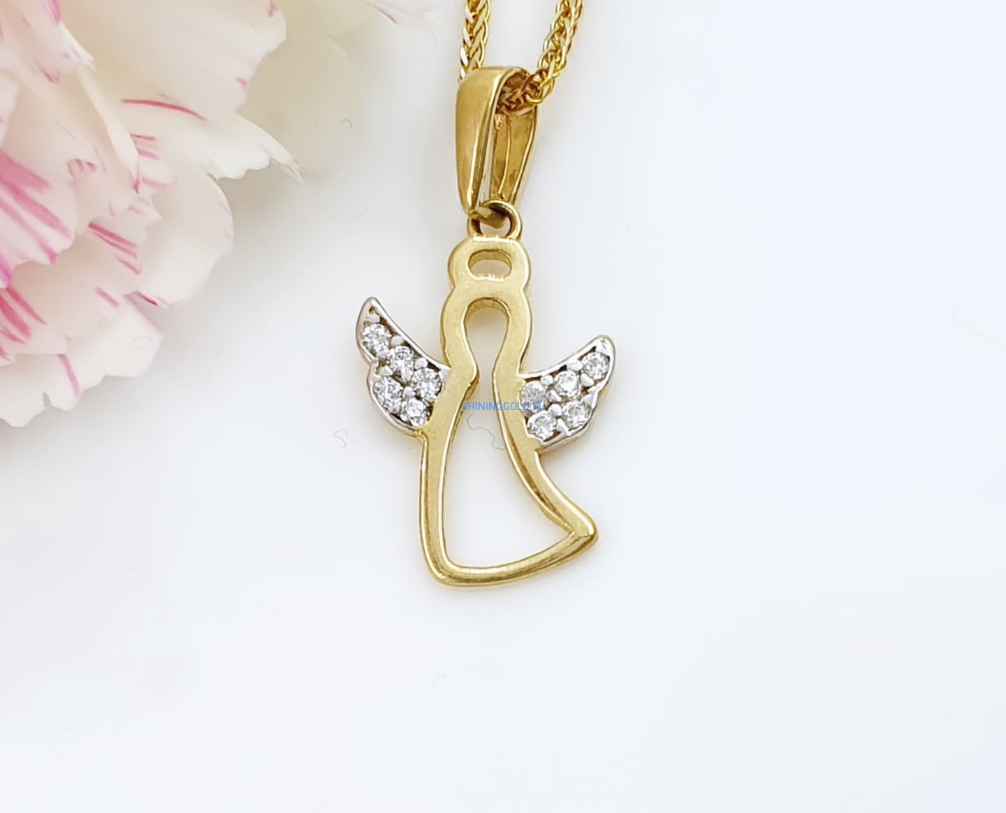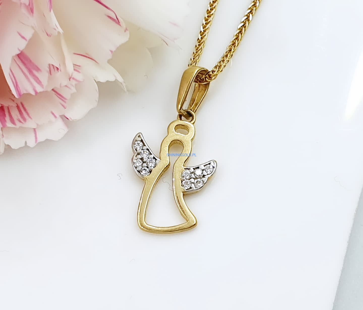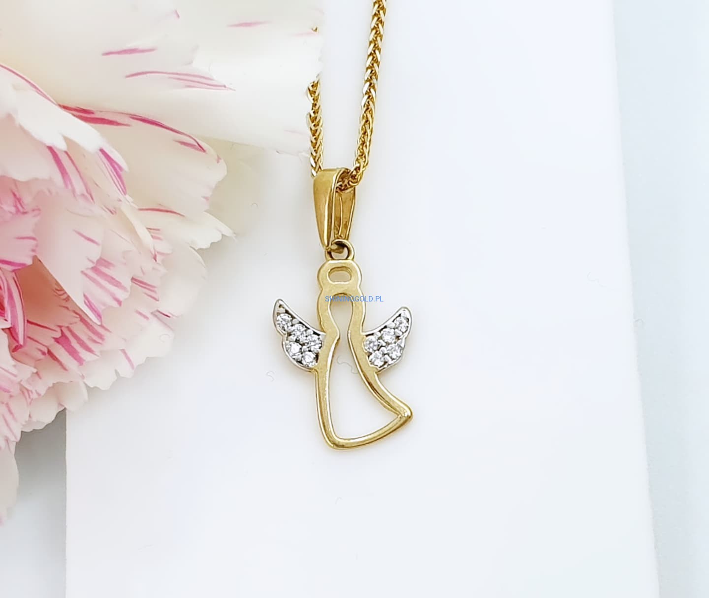Subtelna i elegancka zawieszka w kształcie aniołka, ozdobiona lśniącymi cyrkoniami. Wykonana z wysokiej jakości złota, symbolizuje ochronę i opiekę. Doskonały wybór na prezent o głębokim znaczeniu, który sprawdzi się na co dzień i na wyjątkowe okazje.
