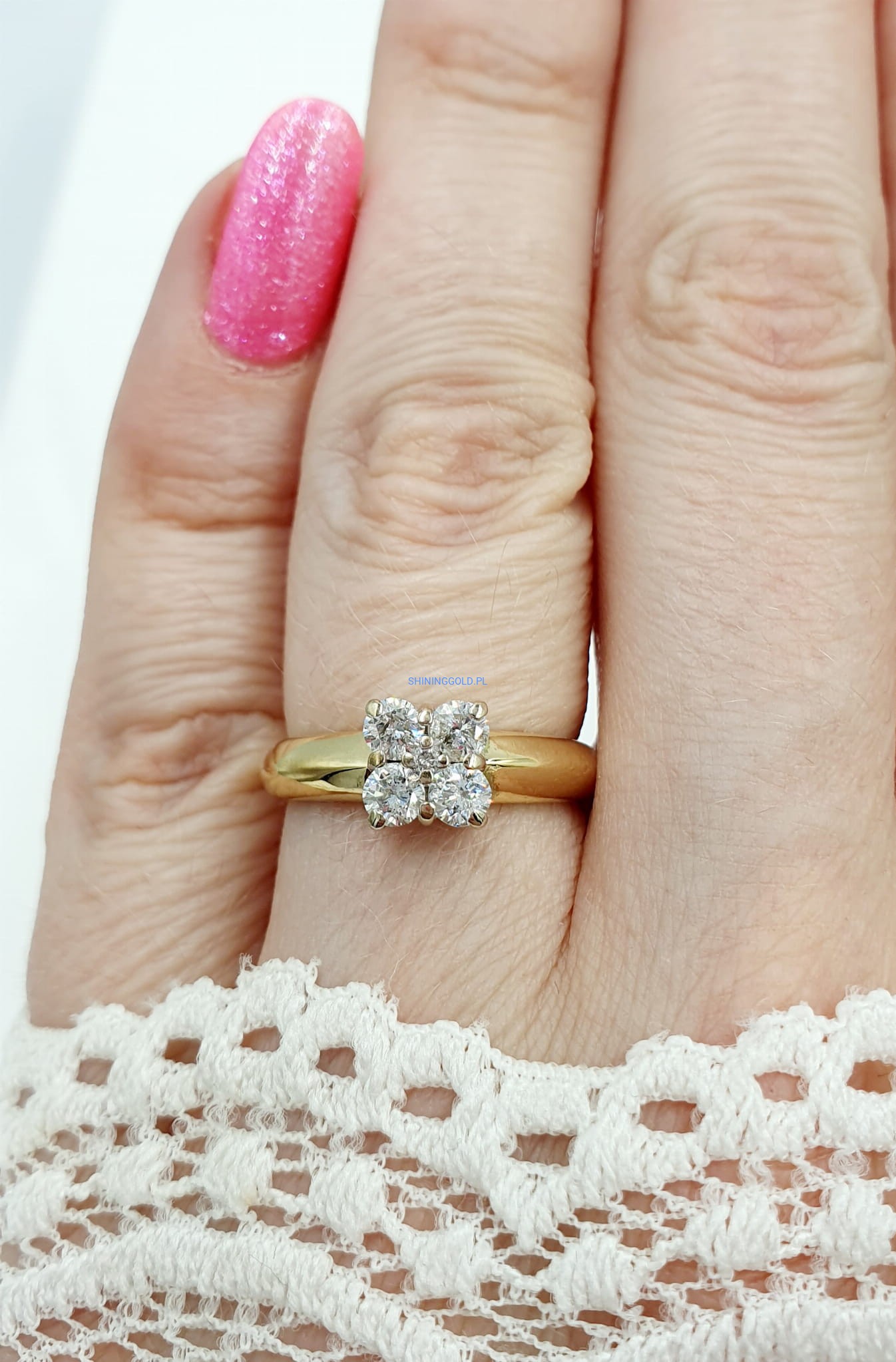 - Luksusowy design: Pięć diamentów w szlifie brylantowym tworzy wyjątkowy blask, nadając pierścionkowi elegancji i prestiżu.