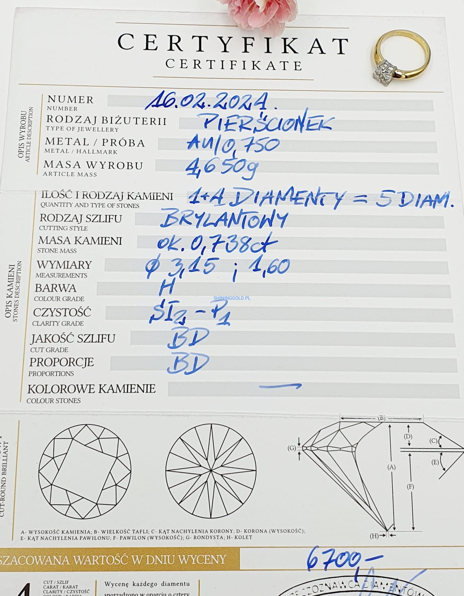 - 5 diamentów w szlifie brylantowym, masa ok. 0,738ct, czystość SI2-P1, barwa H