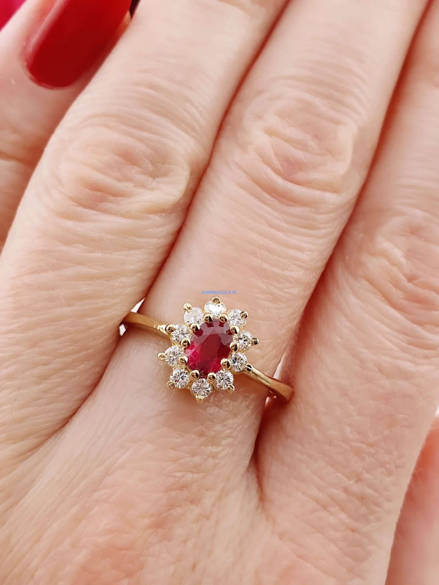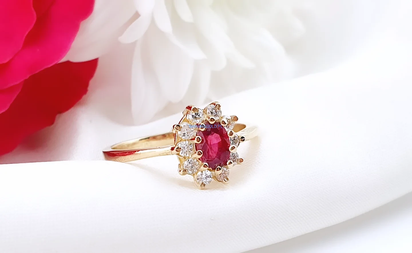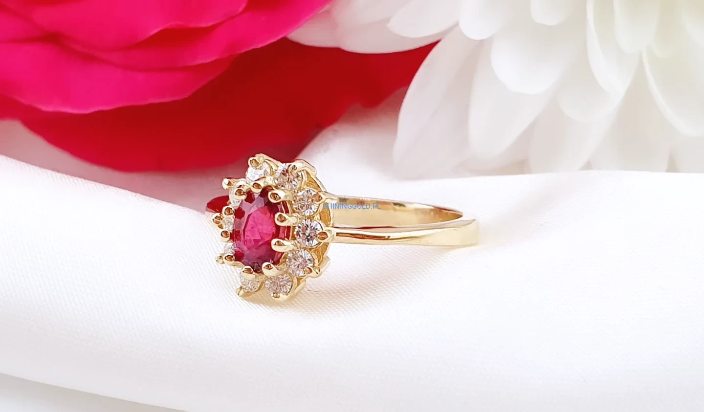 Elegancki i pełen szlachetności pierścionek wykonany ze złota próby 585. Jego centrum zdobi naturalny rubin o masie ok. 0,45 ct – kamień miłości, pasji i siły. Otacza go aureola 10 diamentów o łącznej masie ok. 0,35 ct, w szlifie brylantowym, barwie H–I oraz czystości VS1–2. Subtelny, a jednocześnie niezwykle efektowny – ponadczasowy model, który nigdy nie wychodzi z mody.