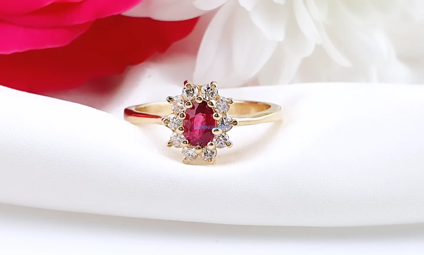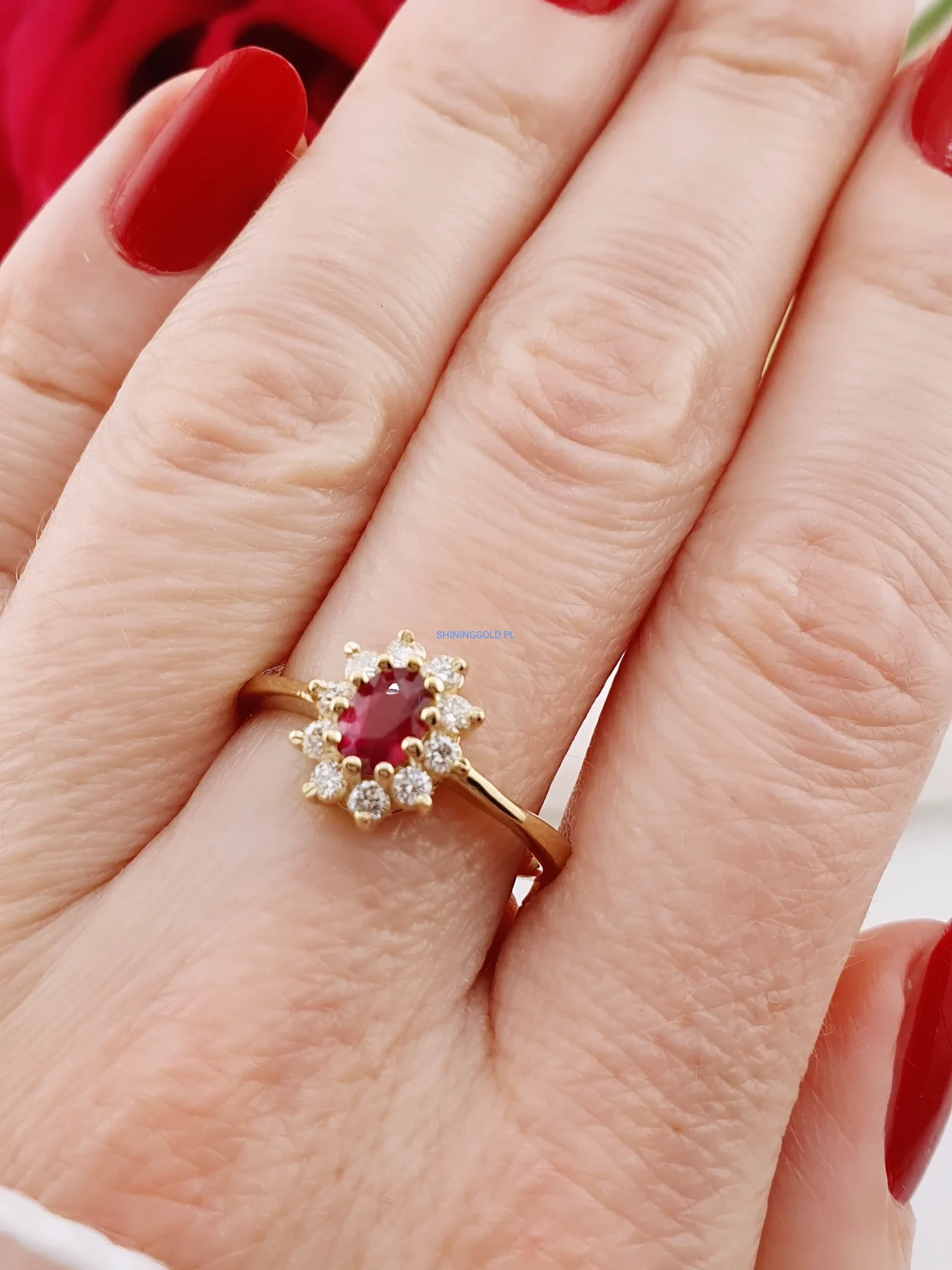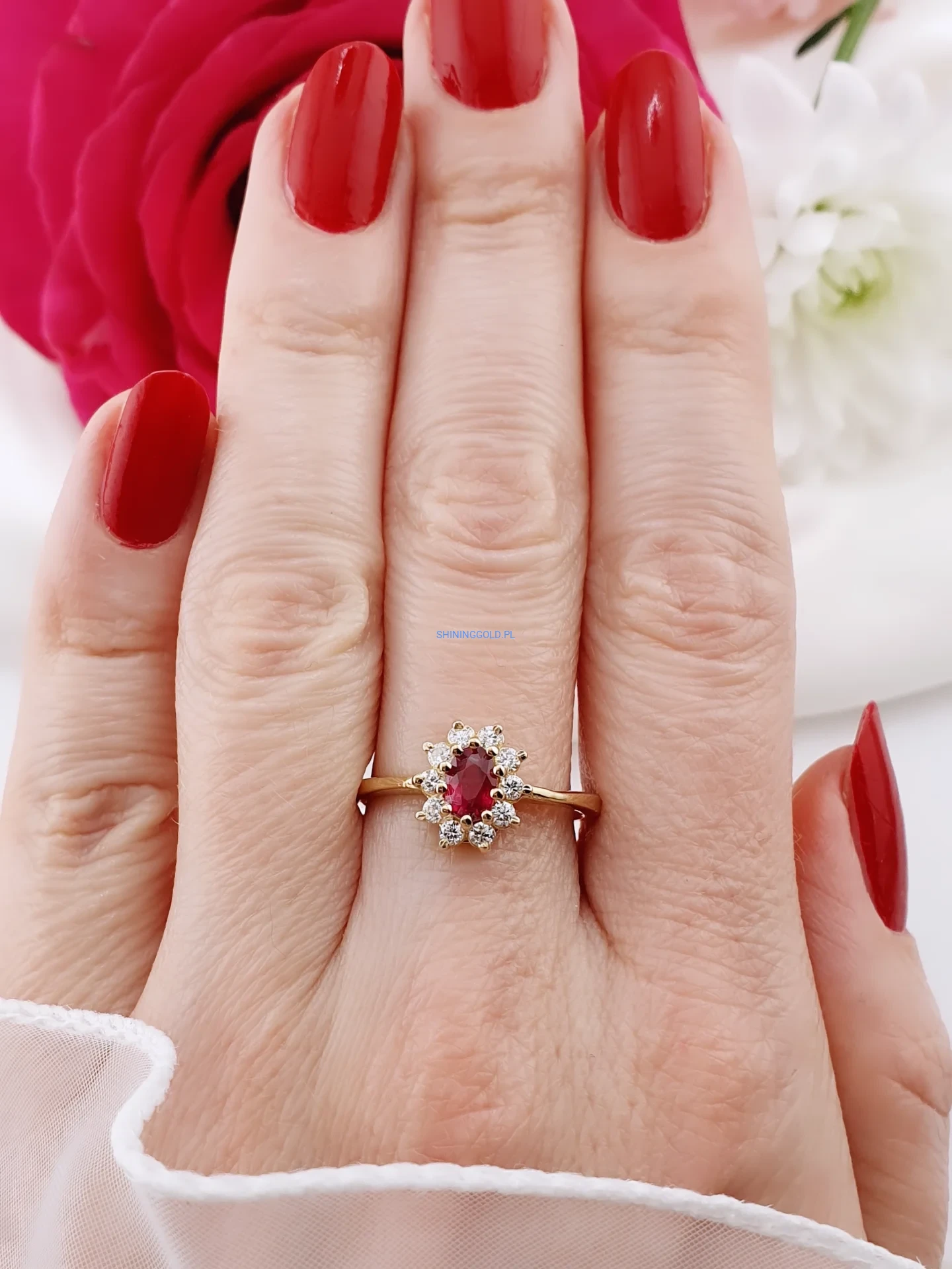 Elegancki i pełen szlachetności pierścionek wykonany ze złota próby 585. Jego centrum zdobi naturalny rubin o masie ok. 0,45 ct – kamień miłości, pasji i siły. Otacza go aureola 10 diamentów o łącznej masie ok. 0,35 ct, w szlifie brylantowym, barwie H–I oraz czystości VS1–2. Subtelny, a jednocześnie niezwykle efektowny – ponadczasowy model, który nigdy nie wychodzi z mody.