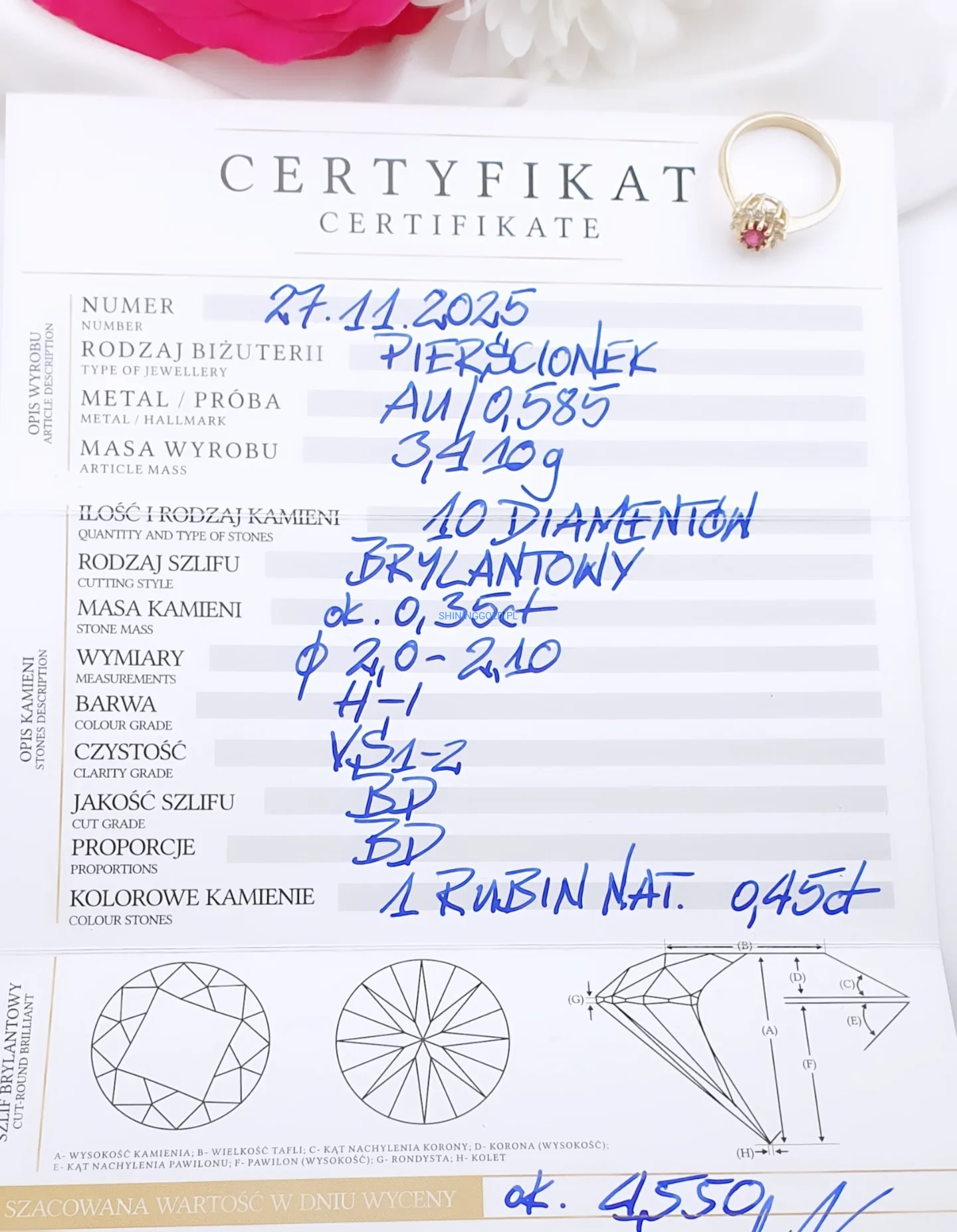 – 1 naturalny rubin ok. 0,45 ct
