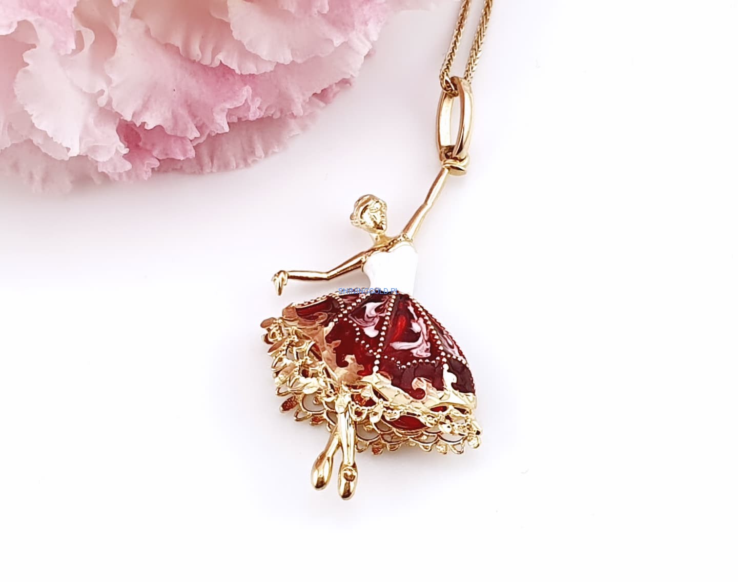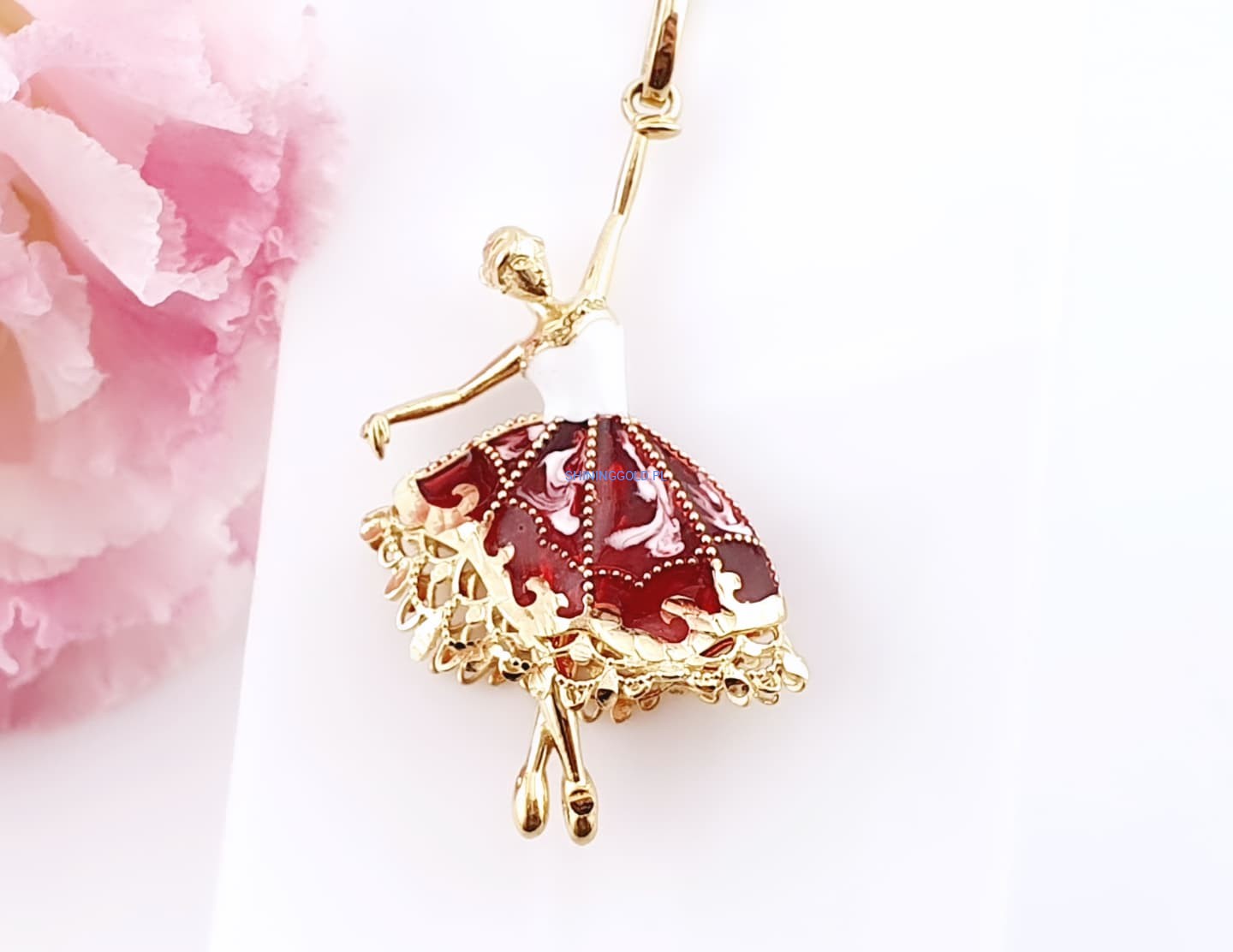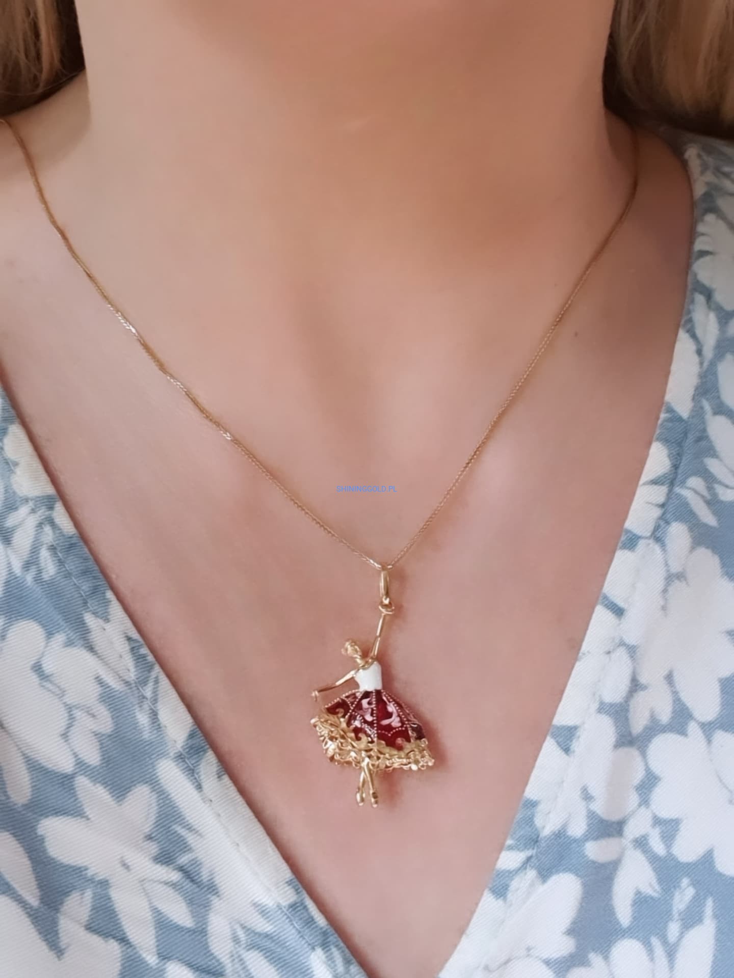 Elegancka zawieszka w kształcie baletnicy, wykonana z żółtego złota próby 585. To wyrazisty i artystyczny element biżuterii, który zachwyca dopracowanymi detalami oraz symboliką lekkości, gracji i pasji.
