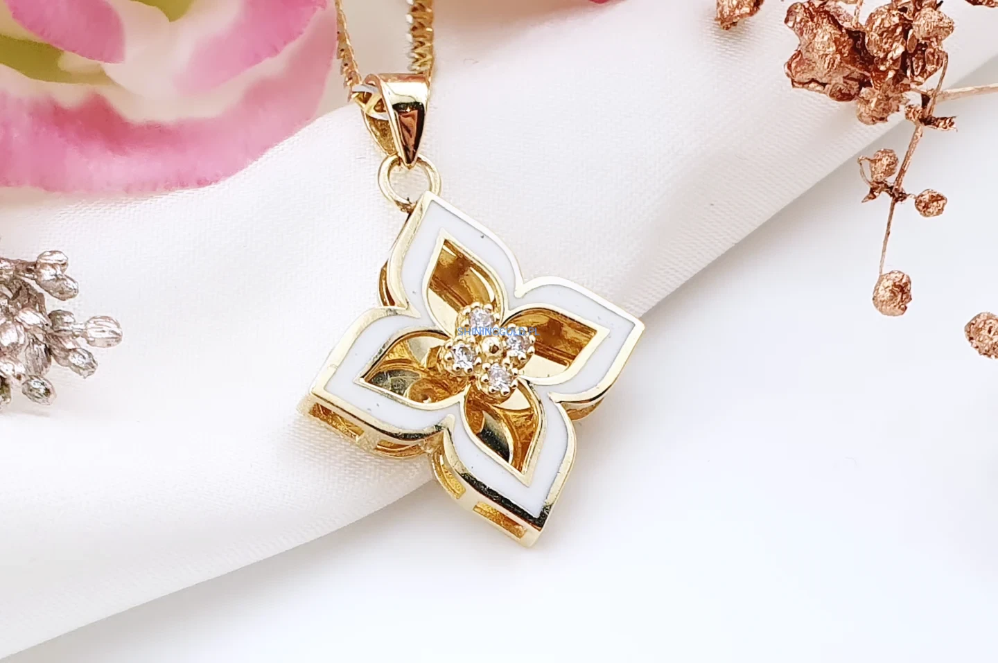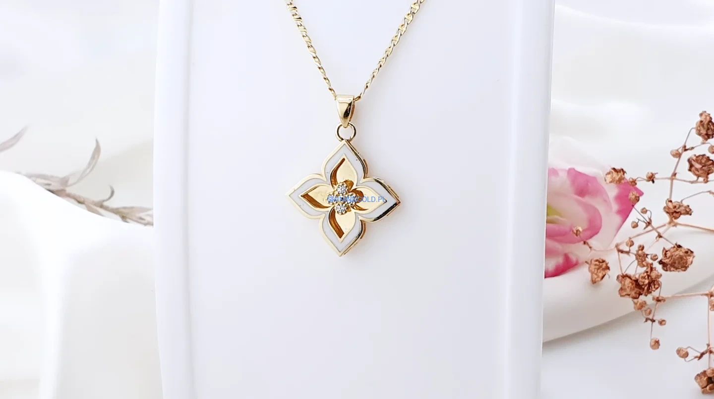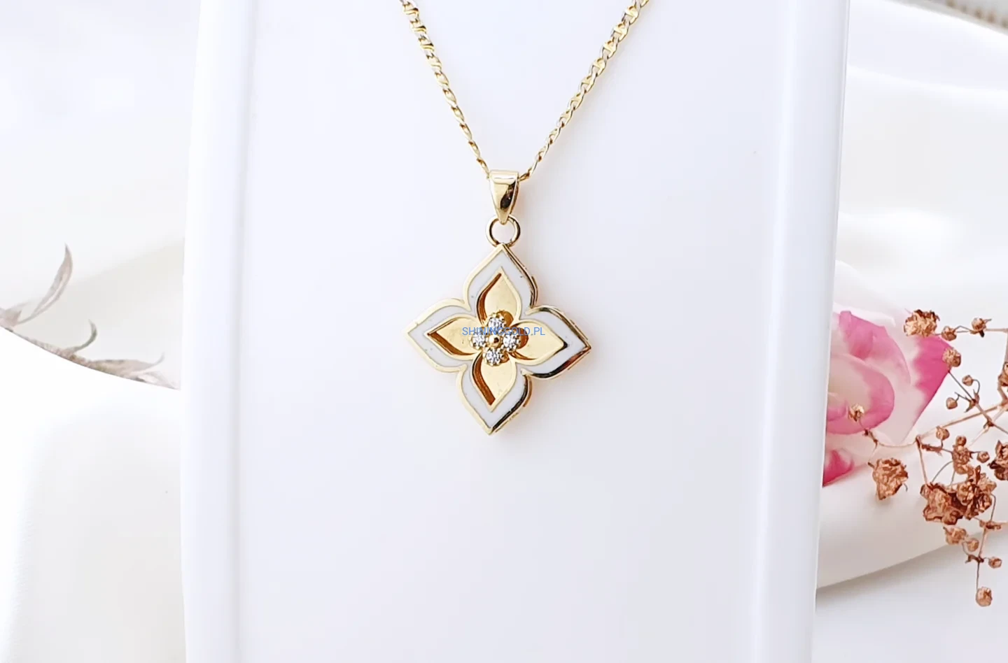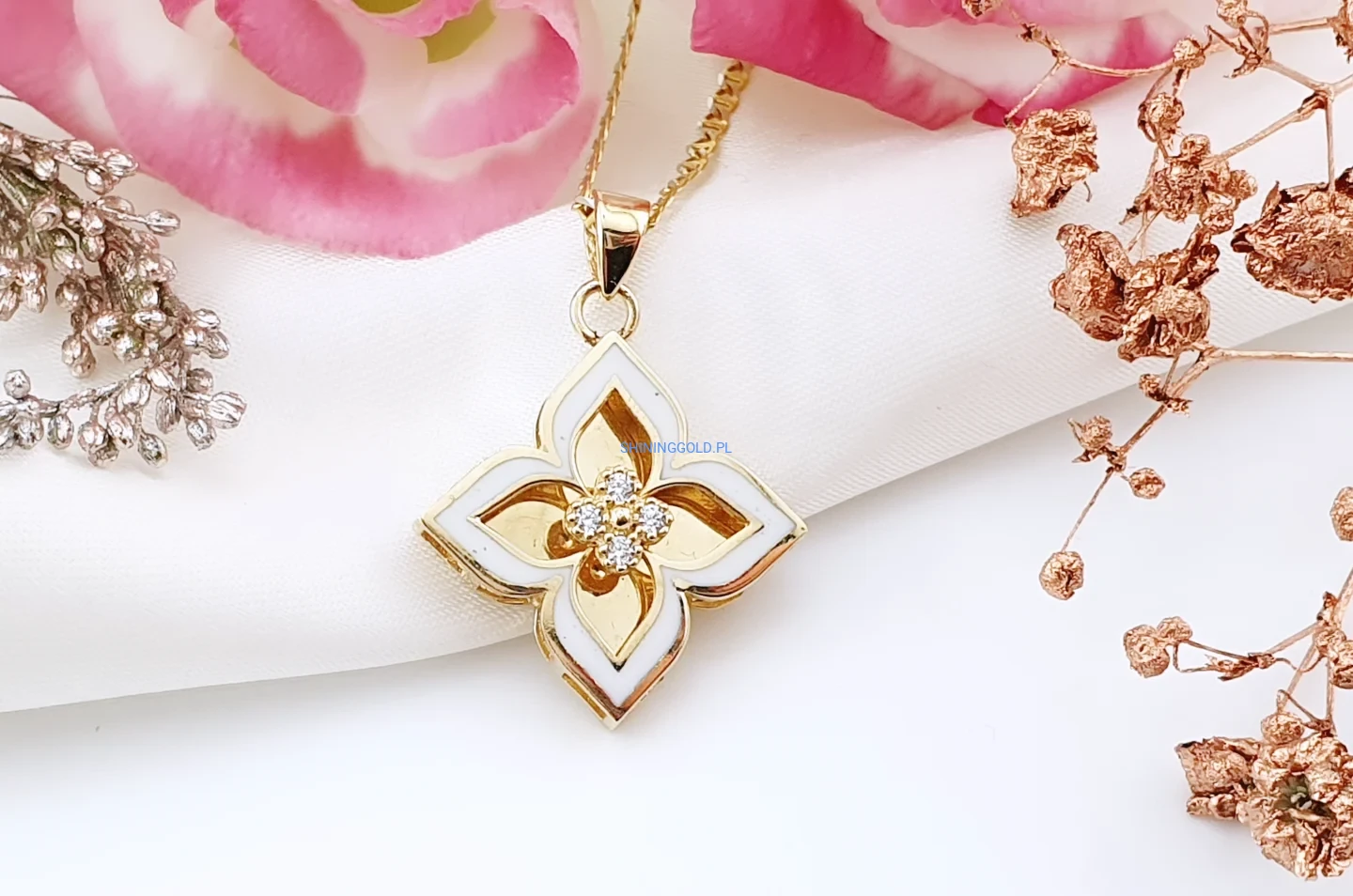 Piękna, misternie wykonana zawieszka w kształcie kwiatowego motywu. Połączenie żółtego złota próby 585 z białą emalią nadaje jej wyjątkowego charakteru, a centralnie osadzone cyrkonie dodają subtelnego blasku. Model prezentuje się lekko, kobieco i niezwykle efektownie – idealny zarówno do codziennych stylizacji, jak i eleganckich zestawów.