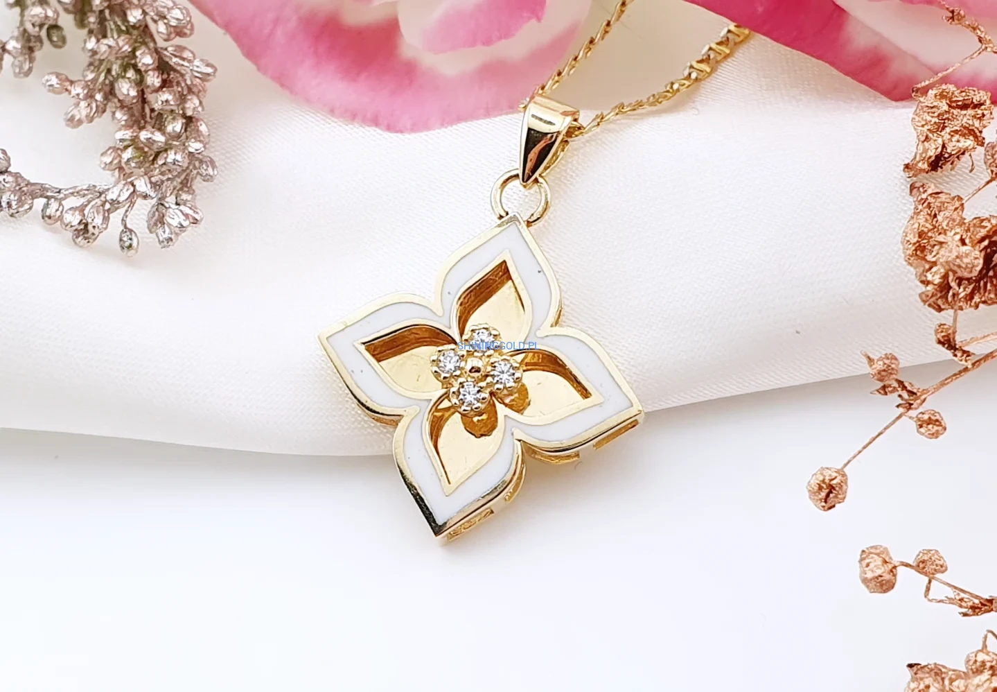 Złota zawieszka 585 – elegancki kwiat z emalią i cyrkoniami