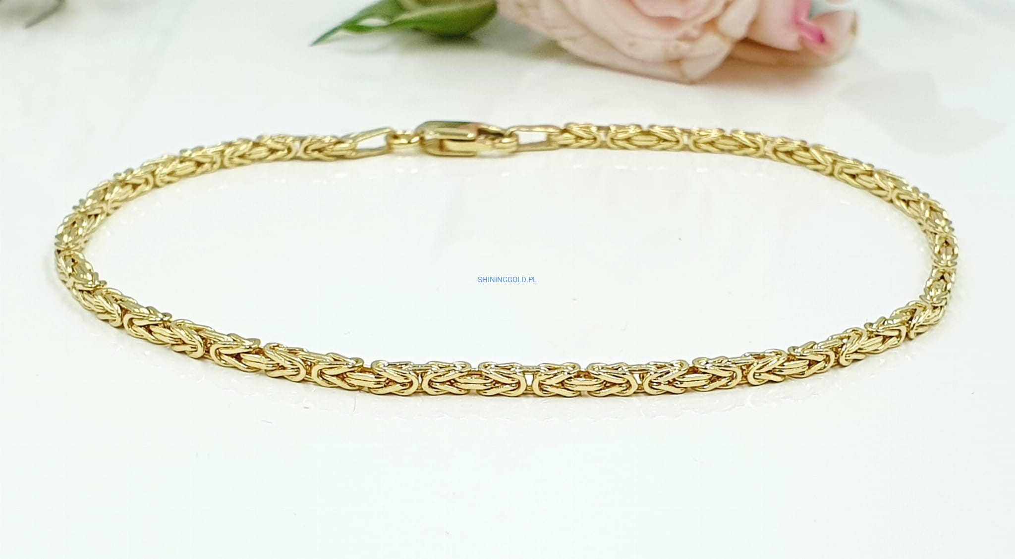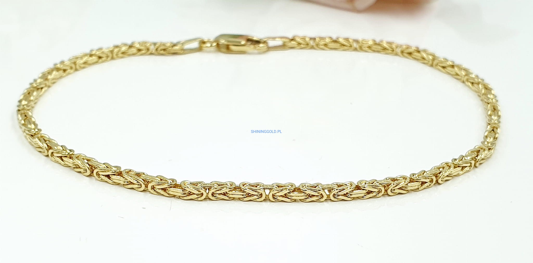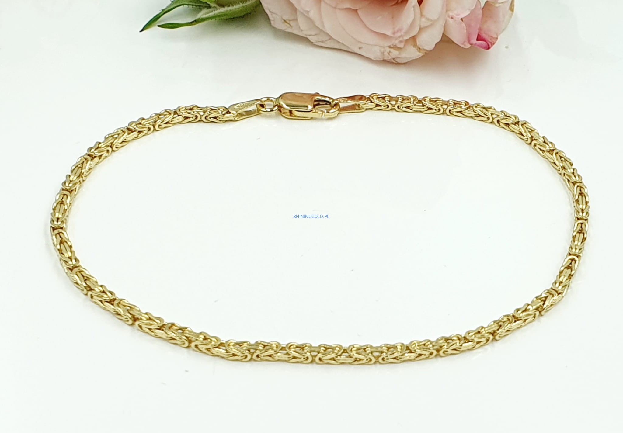 Elegancka złota bransoletka wykonana z wysokiej jakości złota próby 585 w wyjątkowym, klasycznym splocie królewskim. Jej subtelna szerokość i precyzyjny wzór nadają jej ponadczasowy wygląd, idealnie komponujący się zarówno z codziennymi, jak i bardziej formalnymi stylizacjami.