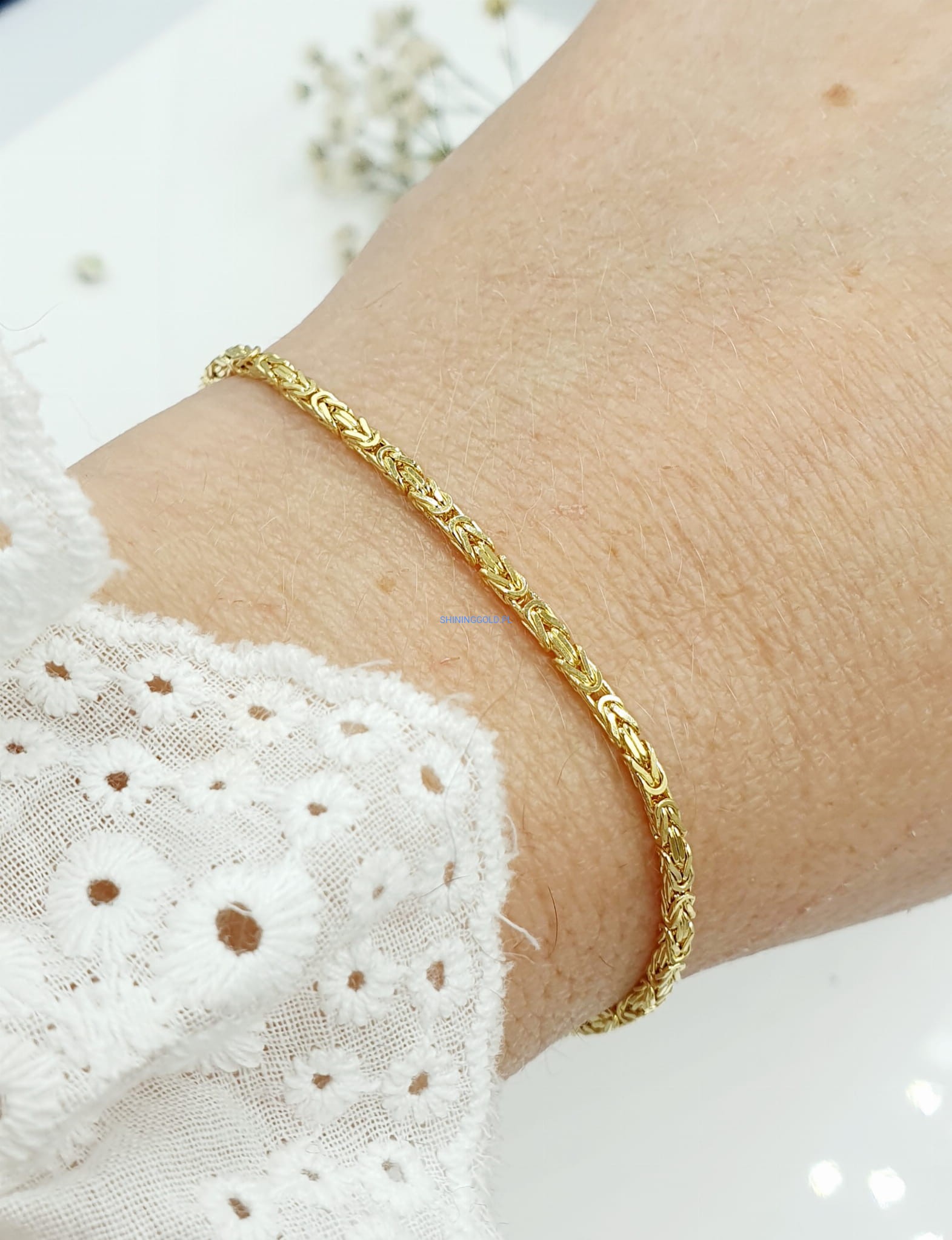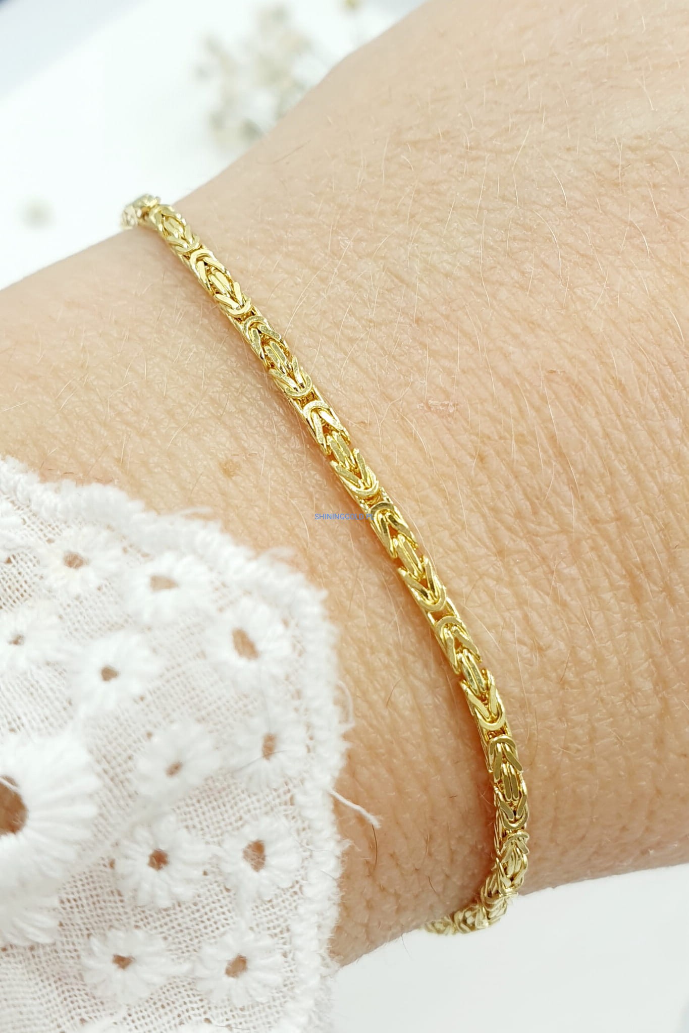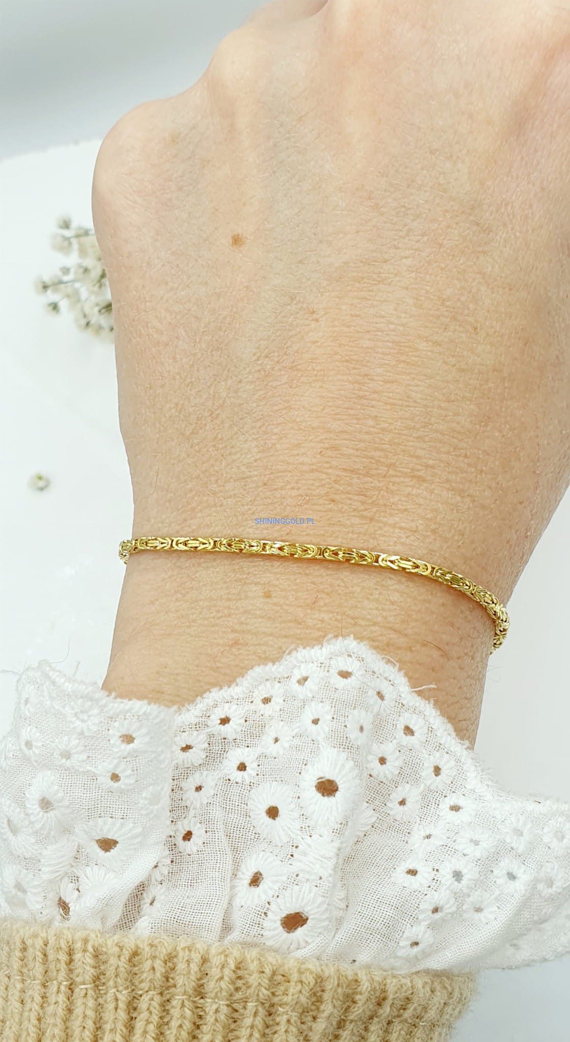Elegancka złota bransoletka wykonana z wysokiej jakości złota próby 585 w wyjątkowym, klasycznym splocie królewskim. Jej subtelna szerokość i precyzyjny wzór nadają jej ponadczasowy wygląd, idealnie komponujący się zarówno z codziennymi, jak i bardziej formalnymi stylizacjami.