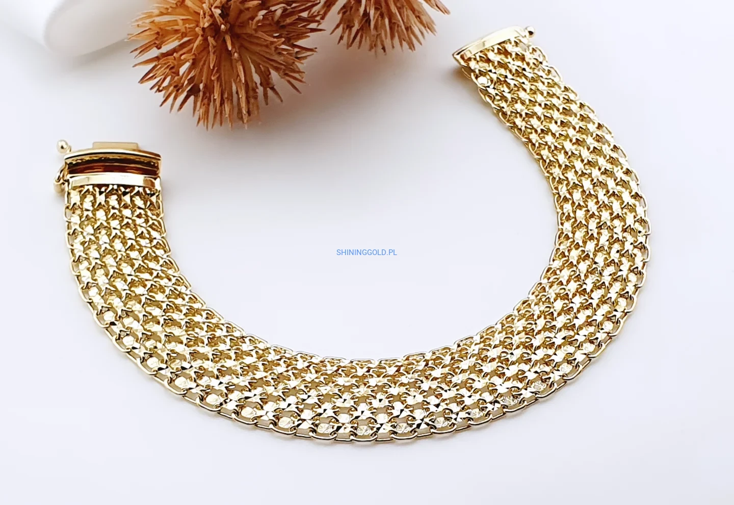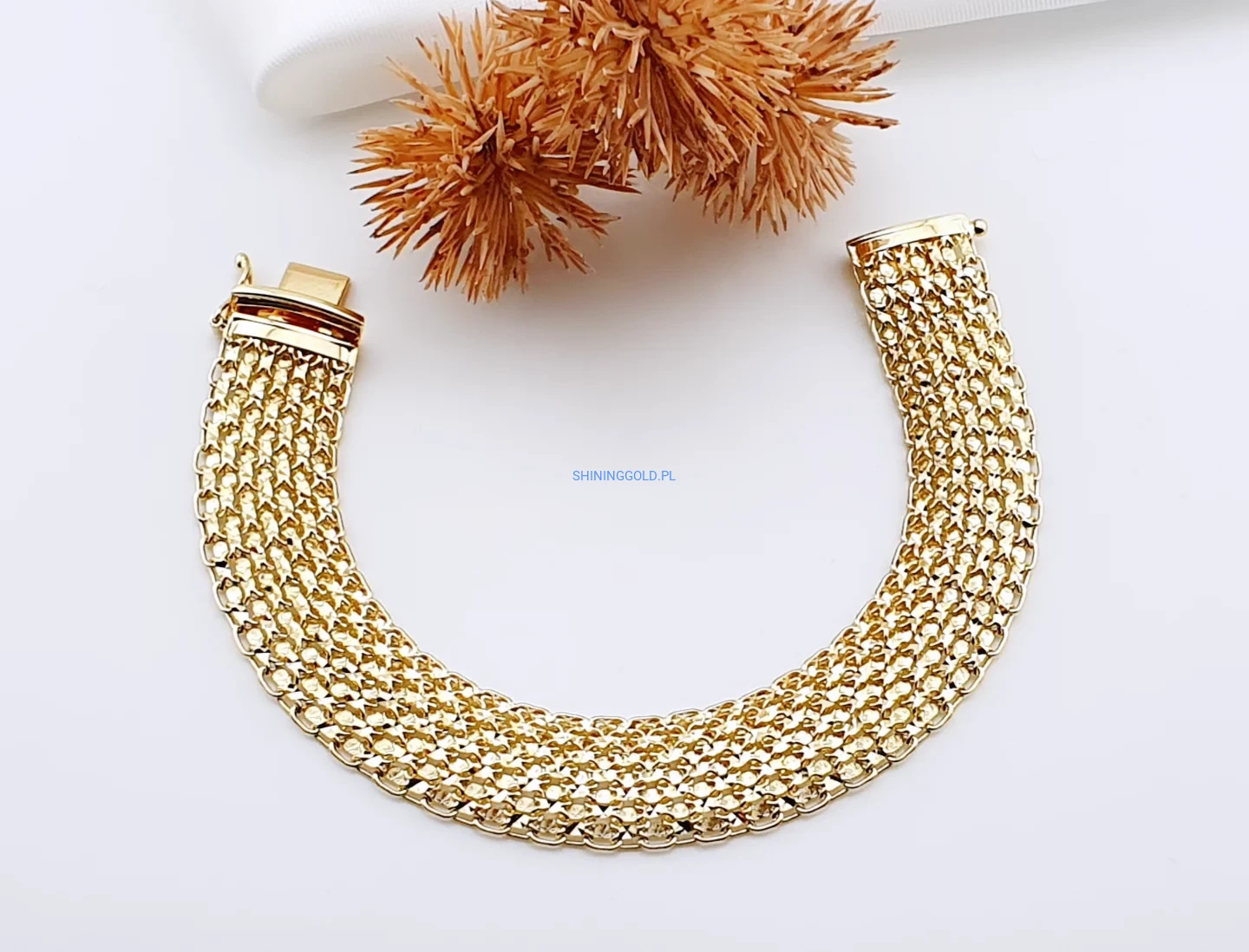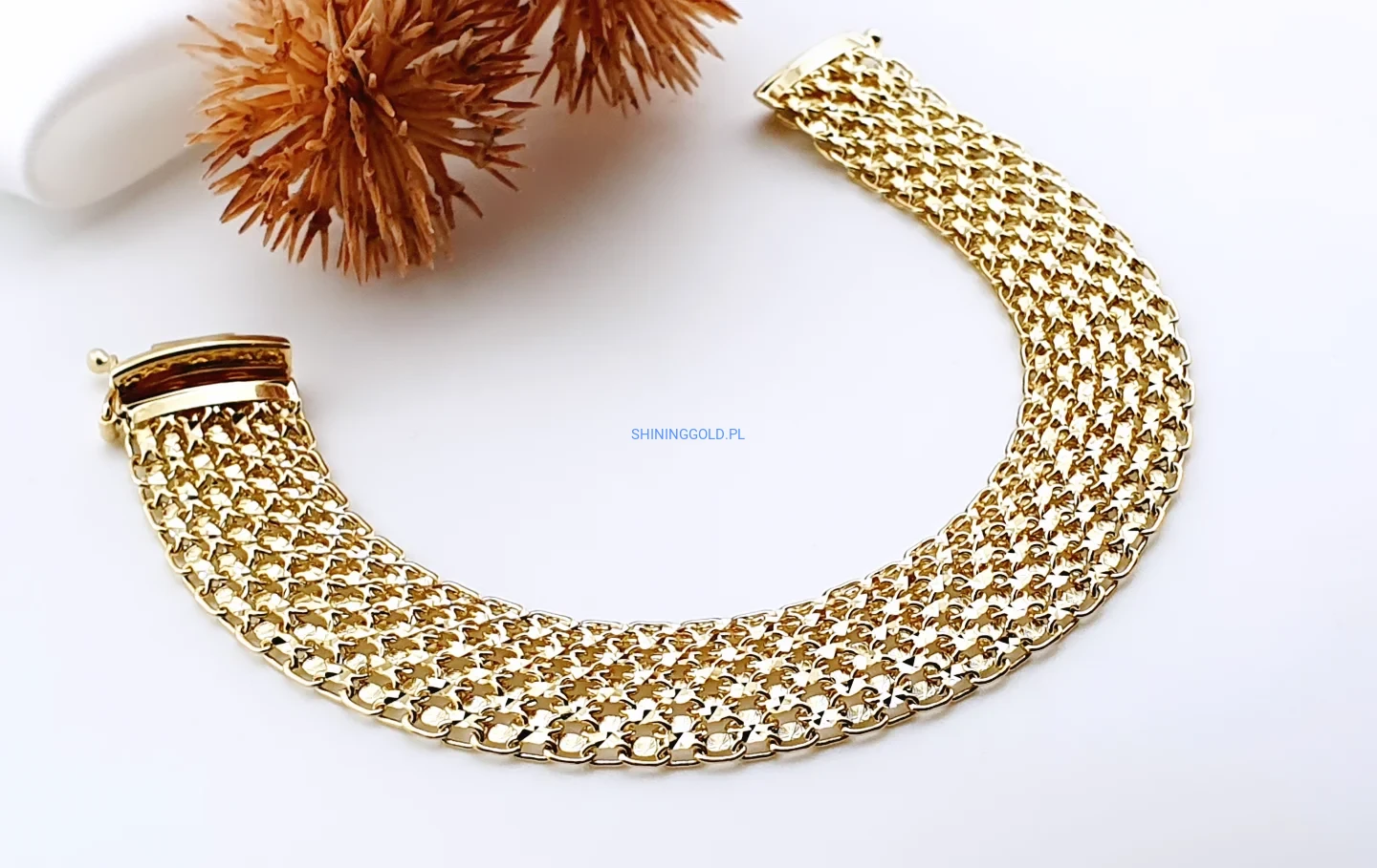 Złota bransoletka Bismarck 403p to klasyczna i ponadczasowa biżuteria o solidnym splocie i eleganckim charakterze. Wykonana ze złota próby 585, zachwyca precyzją wykonania oraz pięknym połyskiem, który podkreśla jej luksusowy wygląd. Szeroki splot typu Bismarck sprawia, że bransoletka prezentuje się efektownie i jest idealnym wyborem zarówno na co dzień, jak i na wyjątkowe okazje.