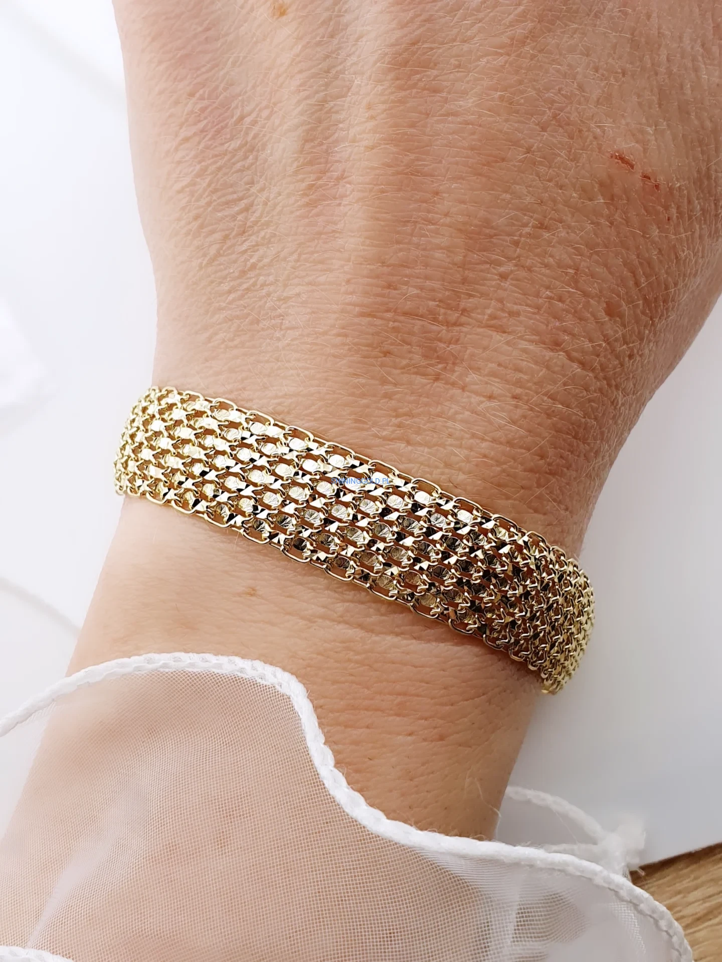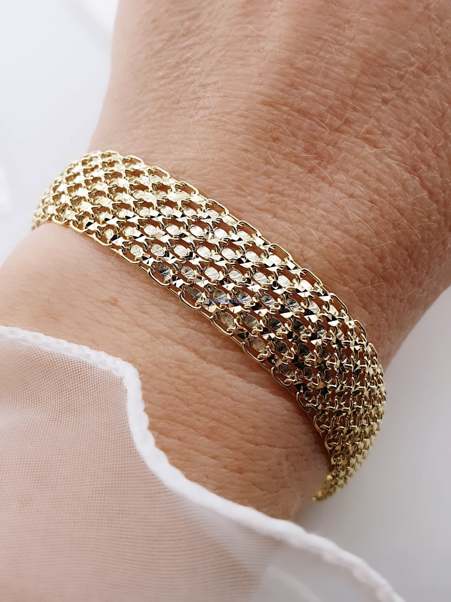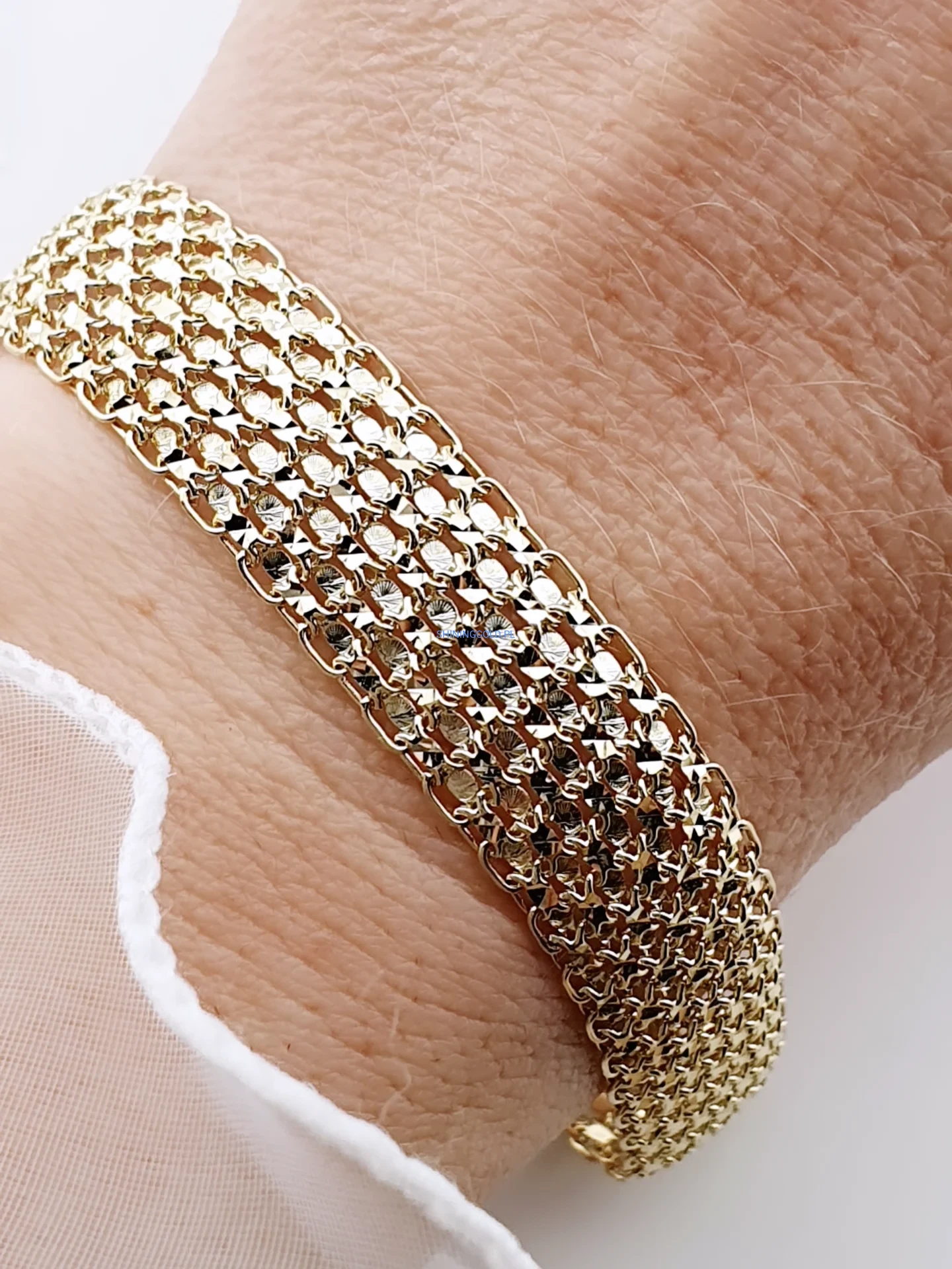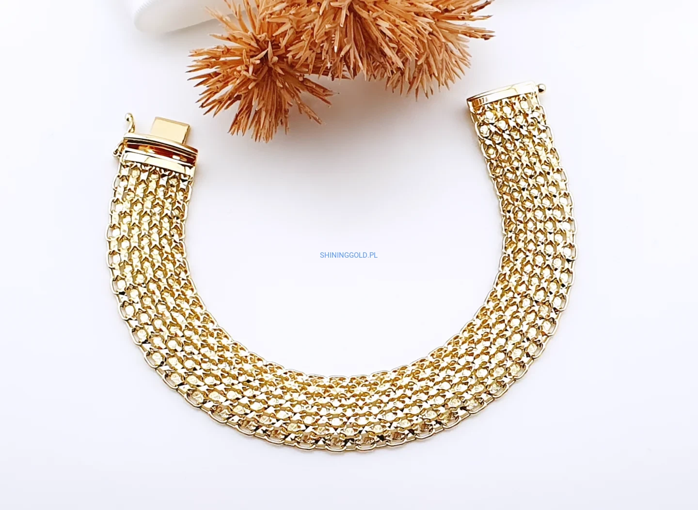 Złota bransoletka Bismarck 403p to klasyczna i ponadczasowa biżuteria o solidnym splocie i eleganckim charakterze. Wykonana ze złota próby 585, zachwyca precyzją wykonania oraz pięknym połyskiem, który podkreśla jej luksusowy wygląd. Szeroki splot typu Bismarck sprawia, że bransoletka prezentuje się efektownie i jest idealnym wyborem zarówno na co dzień, jak i na wyjątkowe okazje.