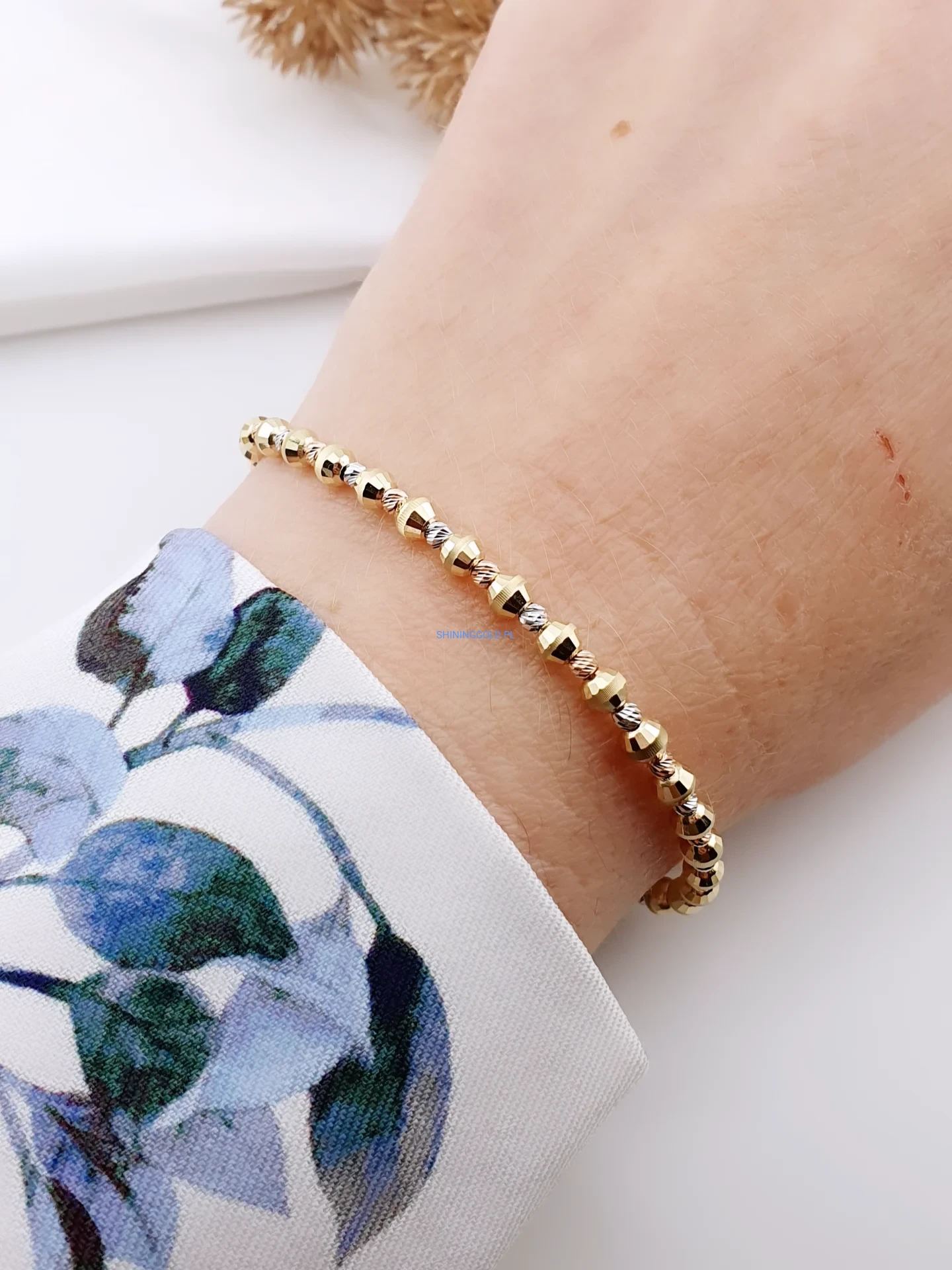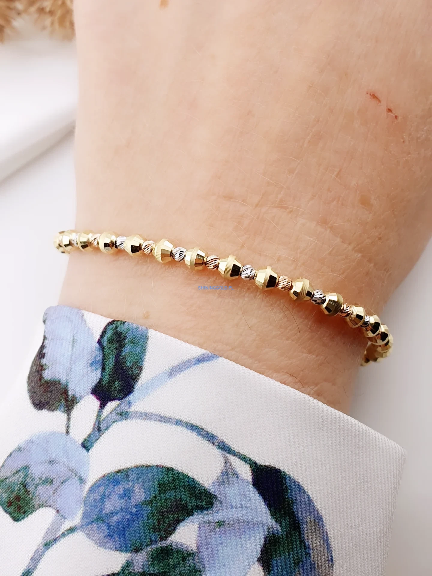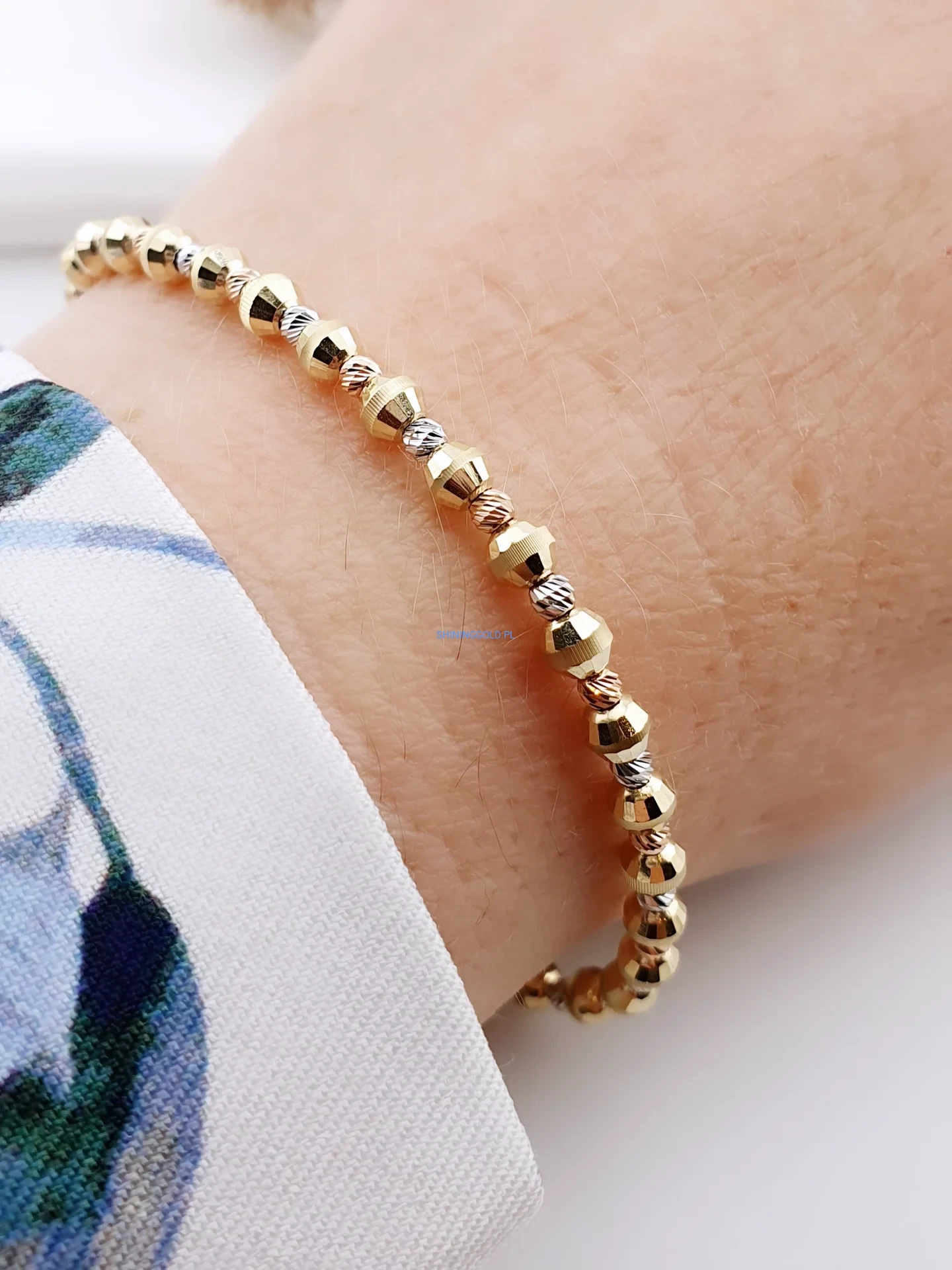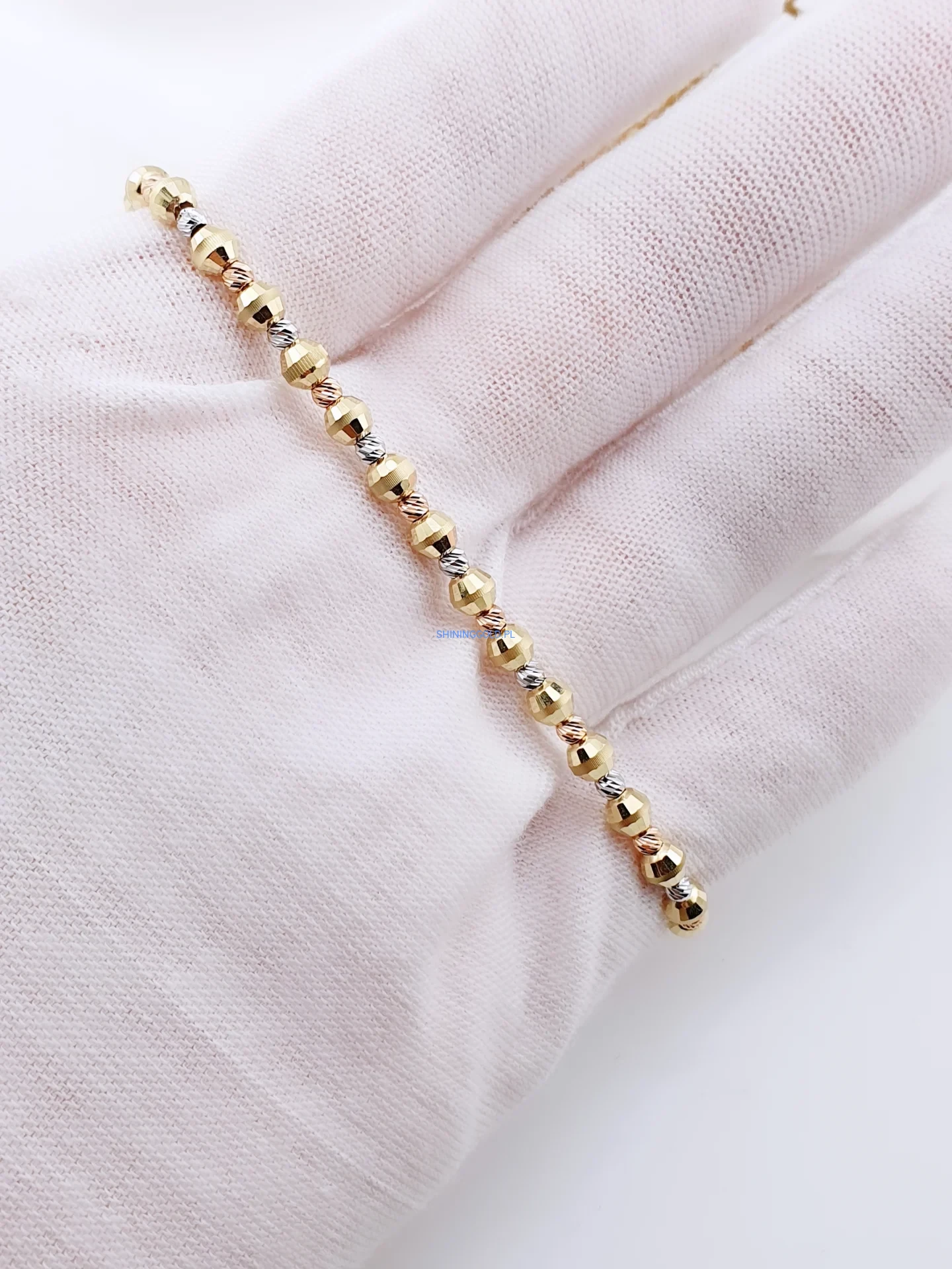 Złota bransoletka z kuleczkami 416a to wyjątkowa ozdoba, która łączy elegancję z nowoczesnym stylem. Wykonana ze złota próby 585, zachwyca drobnymi, geometrycznie fasetowanymi kuleczkami w trzech odcieniach złota – żółtym, białym i różowym. Regulowana długość sprawia, że bransoletka idealnie dopasowuje się do nadgarstka, stając się efektownym dodatkiem na co dzień i od święta.