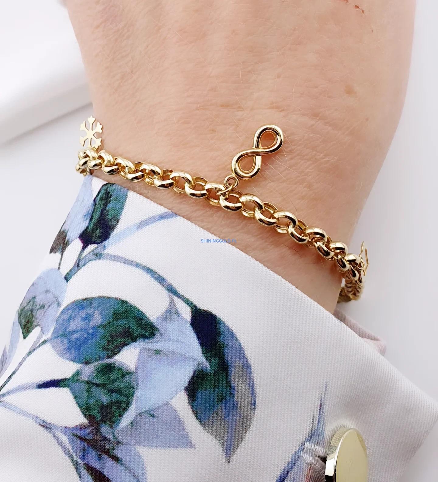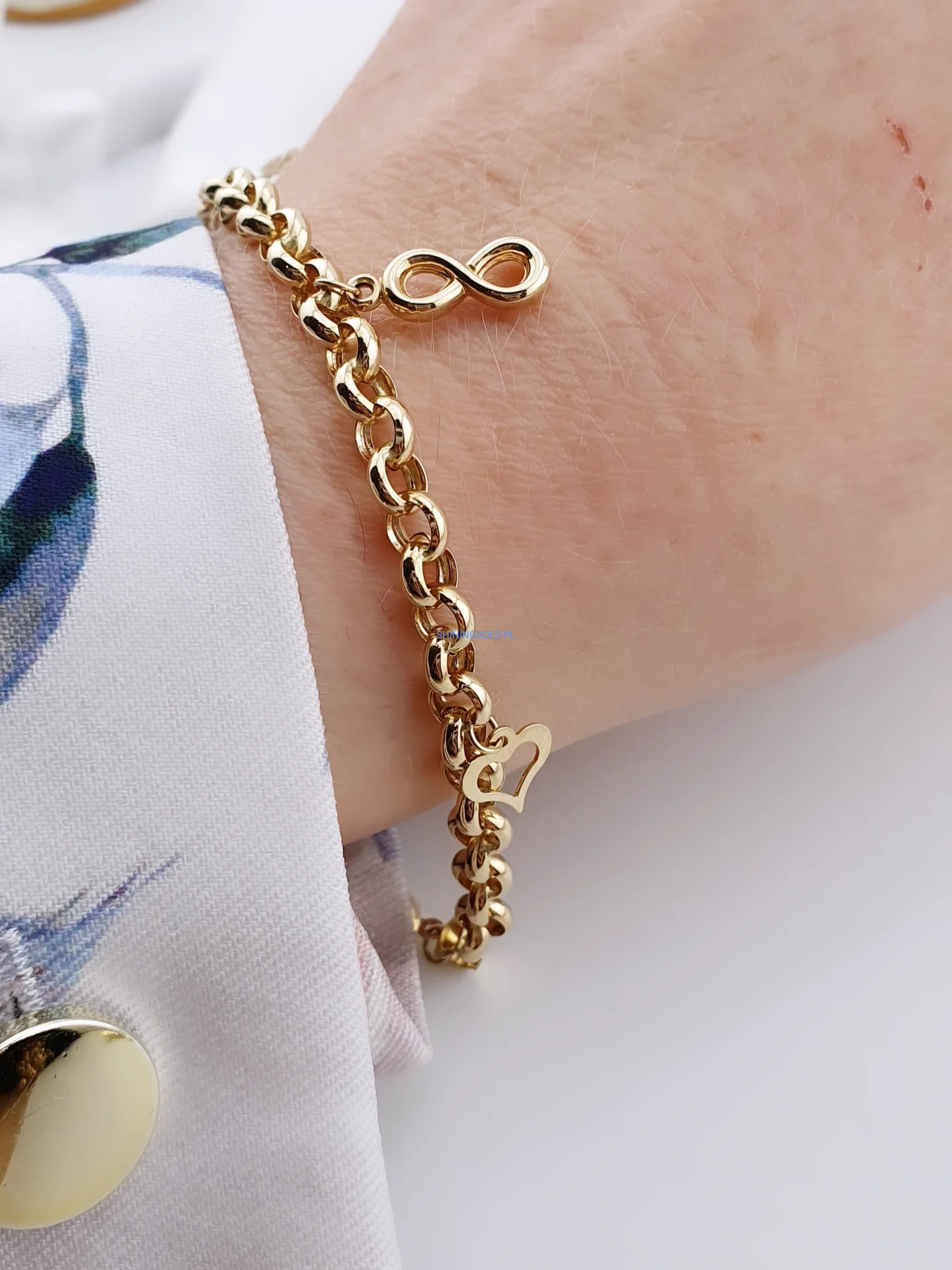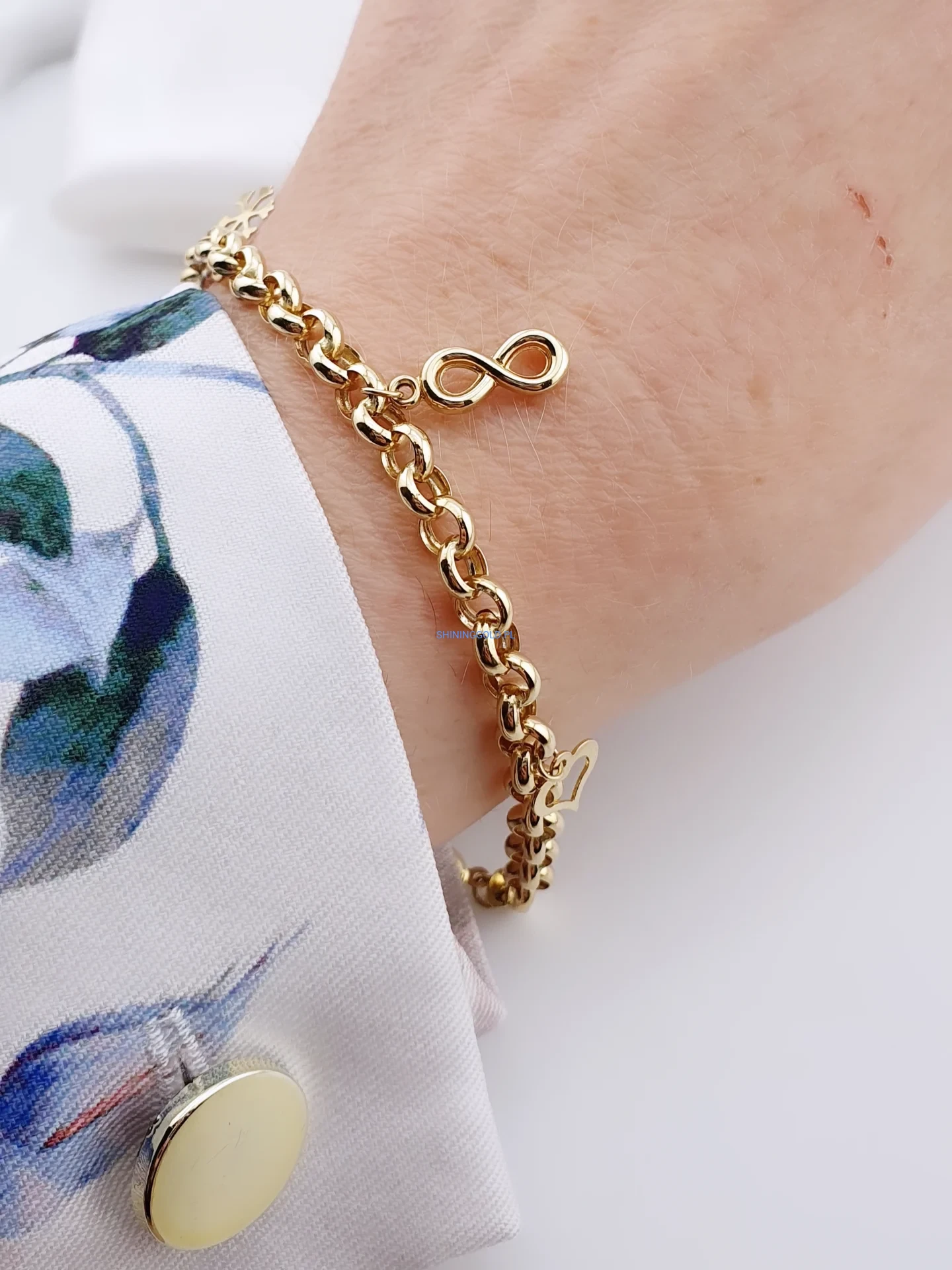 Złota bransoletka z zawieszkami to modna i kobieca biżuteria, która łączy klasykę ze współczesnym stylem. Wykonana ze złota próby 585, ozdobiona została uroczymi zawieszkami w kształcie serca, nieskończoności oraz gwiazdki. Regulowana długość sprawia, że idealnie dopasowuje się do nadgarstka, a jej blask dodaje elegancji każdej stylizacji.