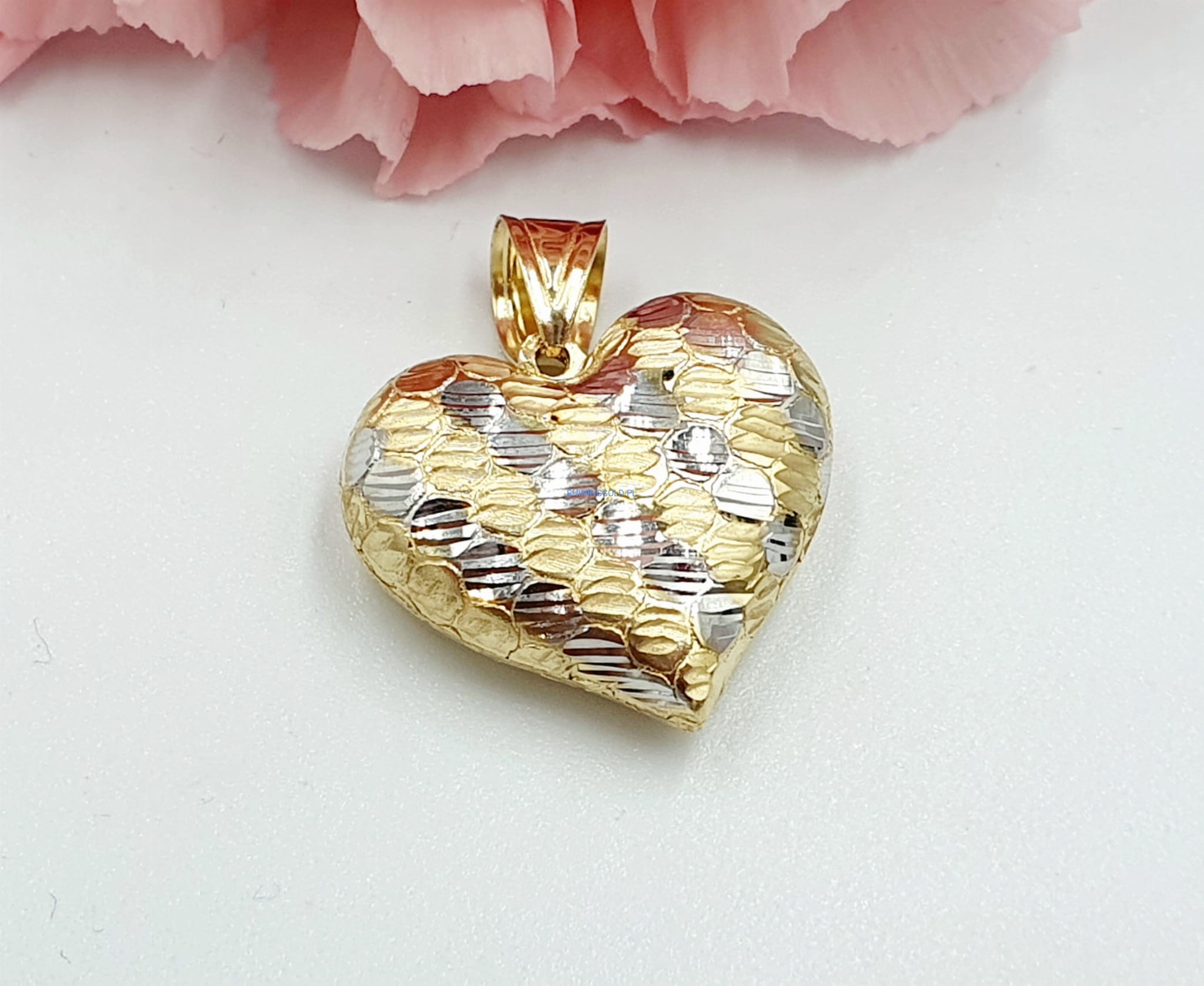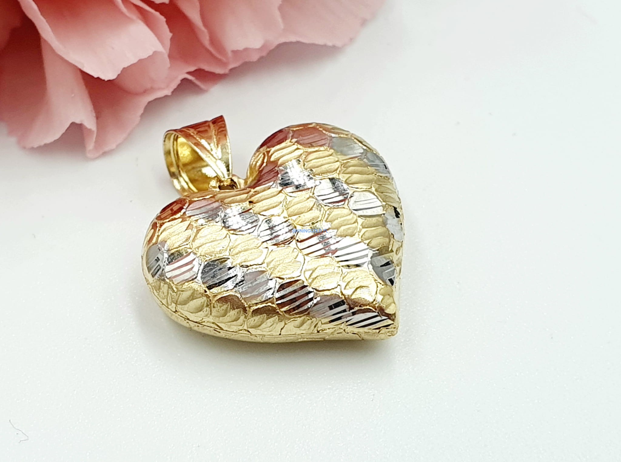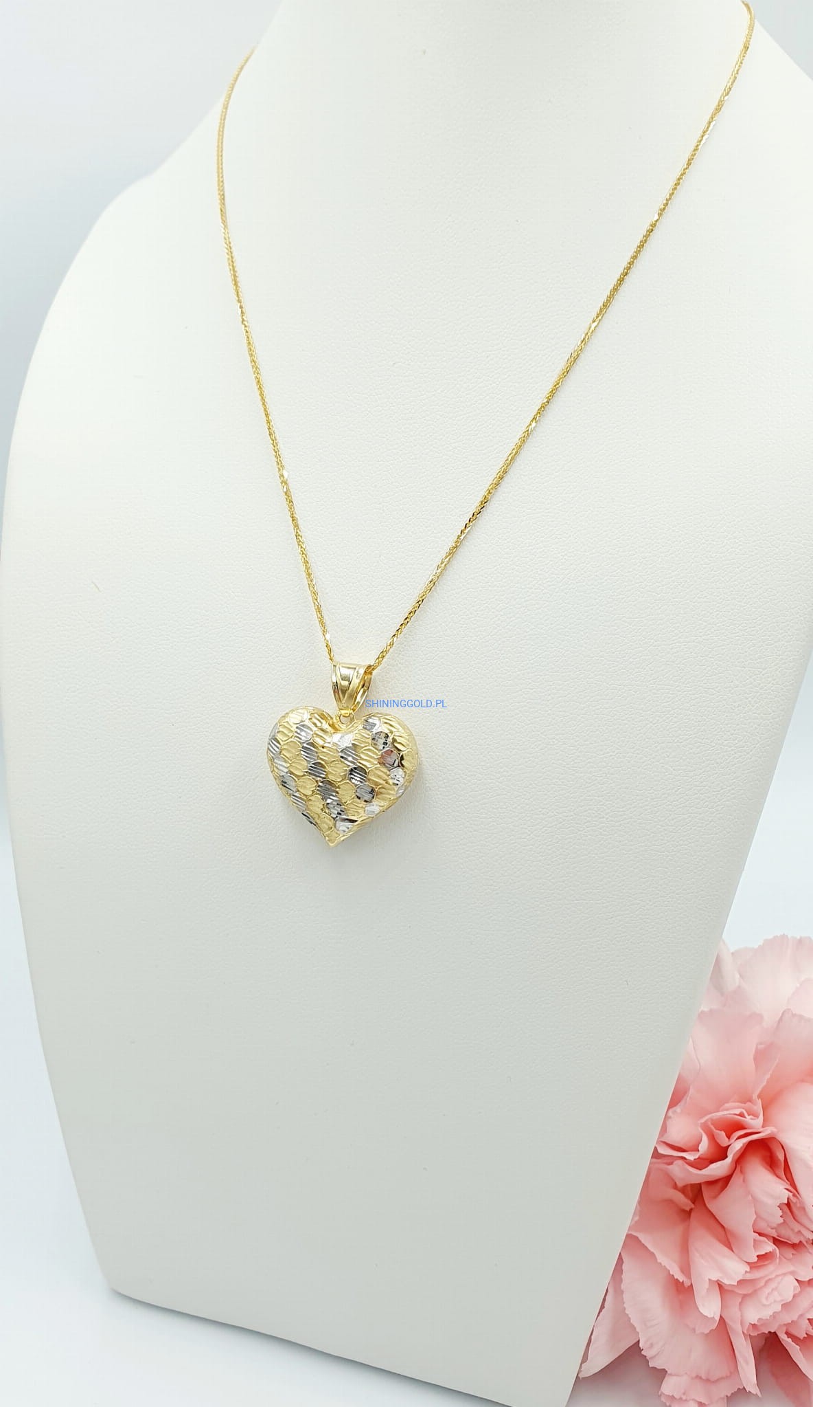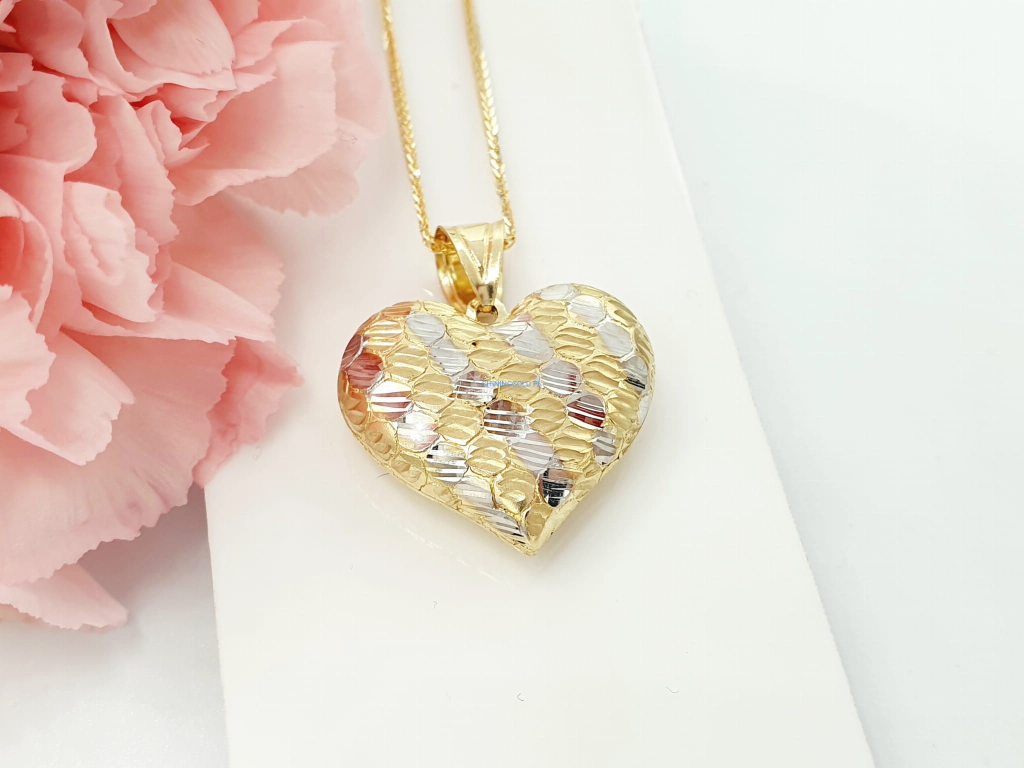 Unikalny Design: Zawieszka prezentuje delikatny kształt serca, symbolizujący miłość i bliskość. Dwa kolory złota - białe i żółte - dodają jej wyjątkowego uroku i sprawiają, że jest to biżuteria, która z łatwością przyciąga wzrok. Dzięki starannemu wykonaniu, zawieszka emanuje blaskiem i elegancją, idealnie komponując się z różnymi stylami.