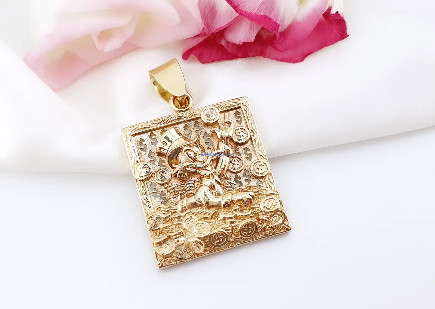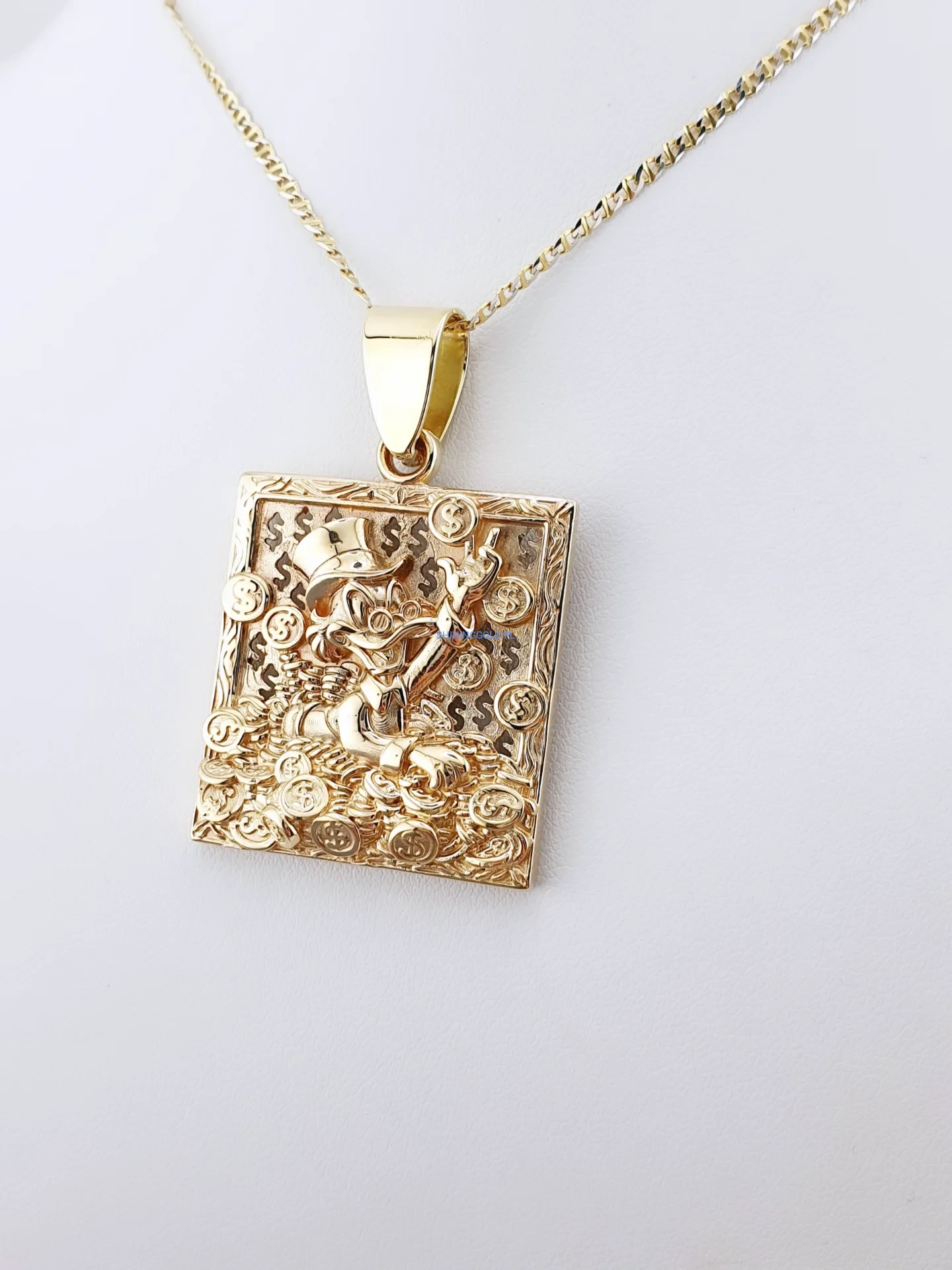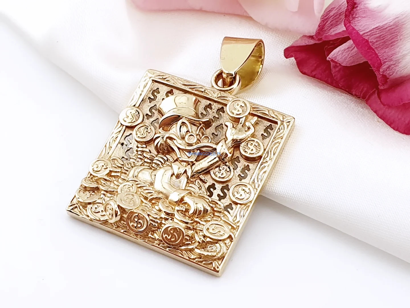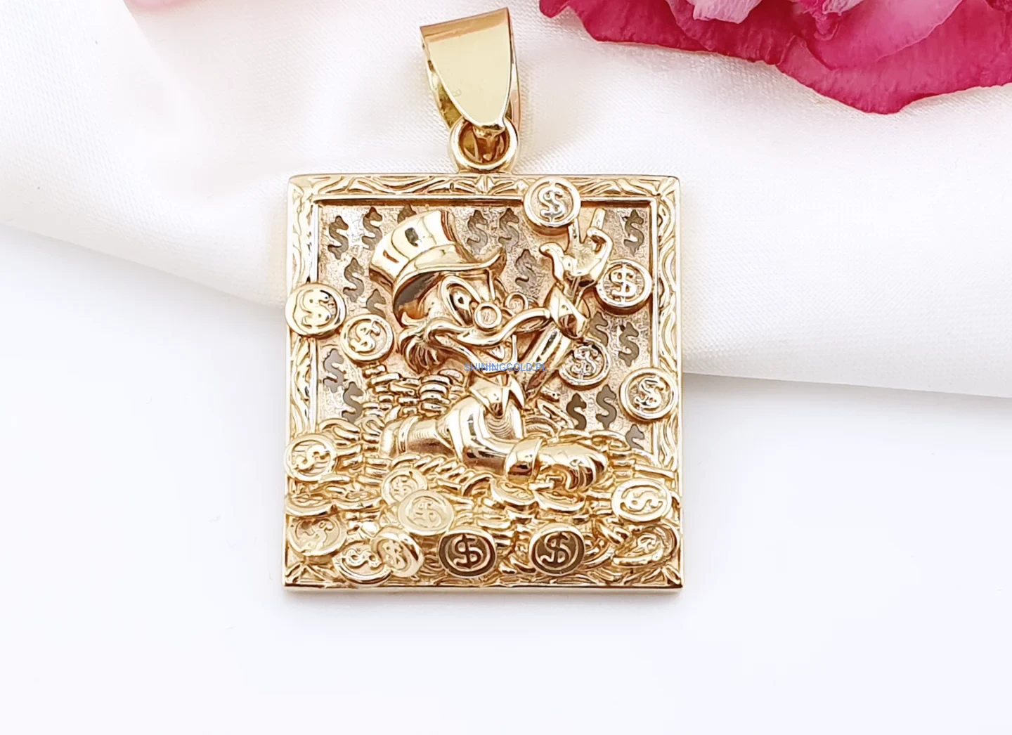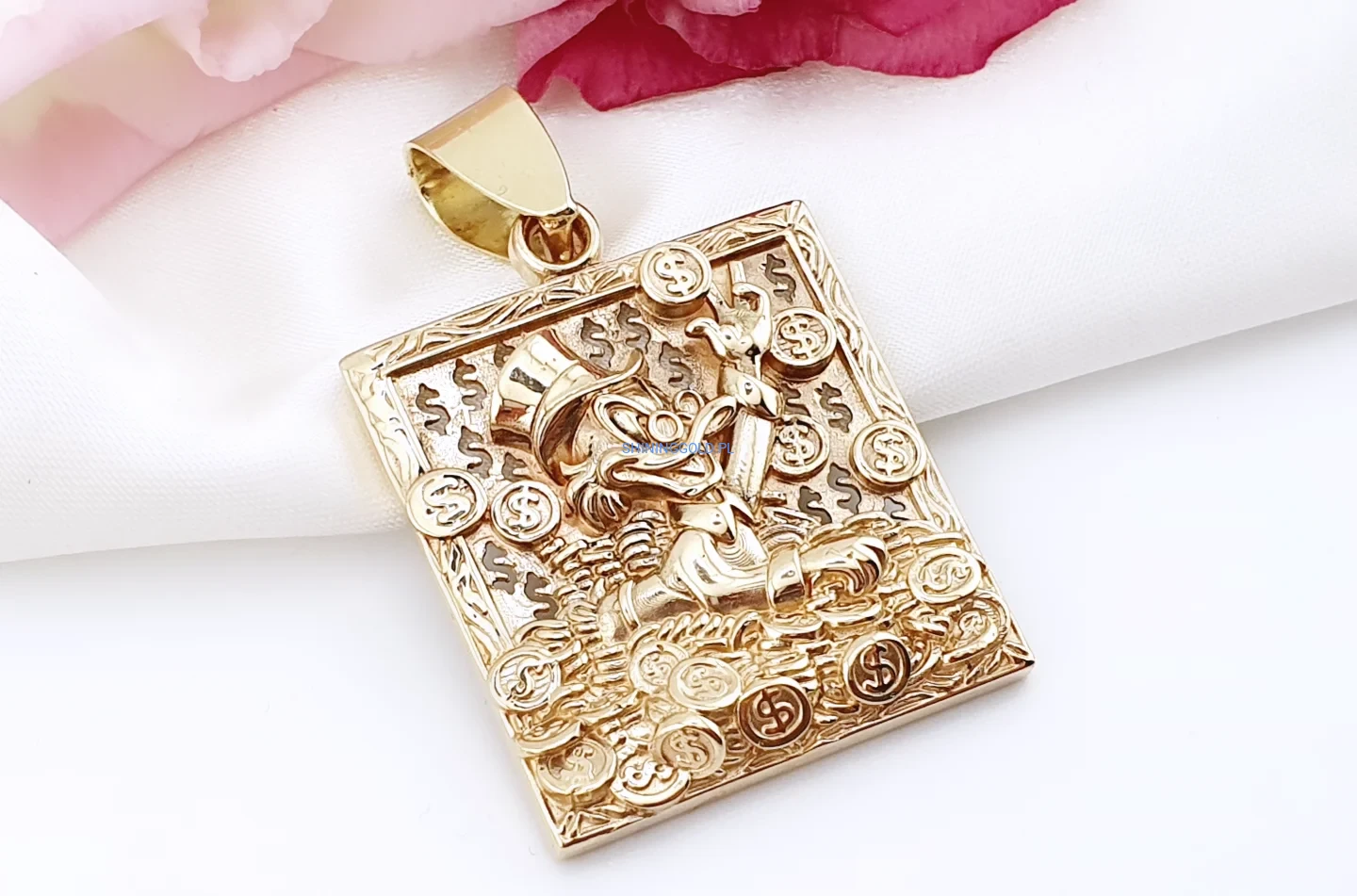 Efektowna, masywna zawieszka wykonana z żółtego złota próby 585, przedstawiająca symbol bogactwa, powodzenia i finansowej pomyślności. Precyzyjnie wykonany relief z motywem postaci otoczonej monetami i znakami dolara nadaje biżuterii wyrazisty, luksusowy charakter.
