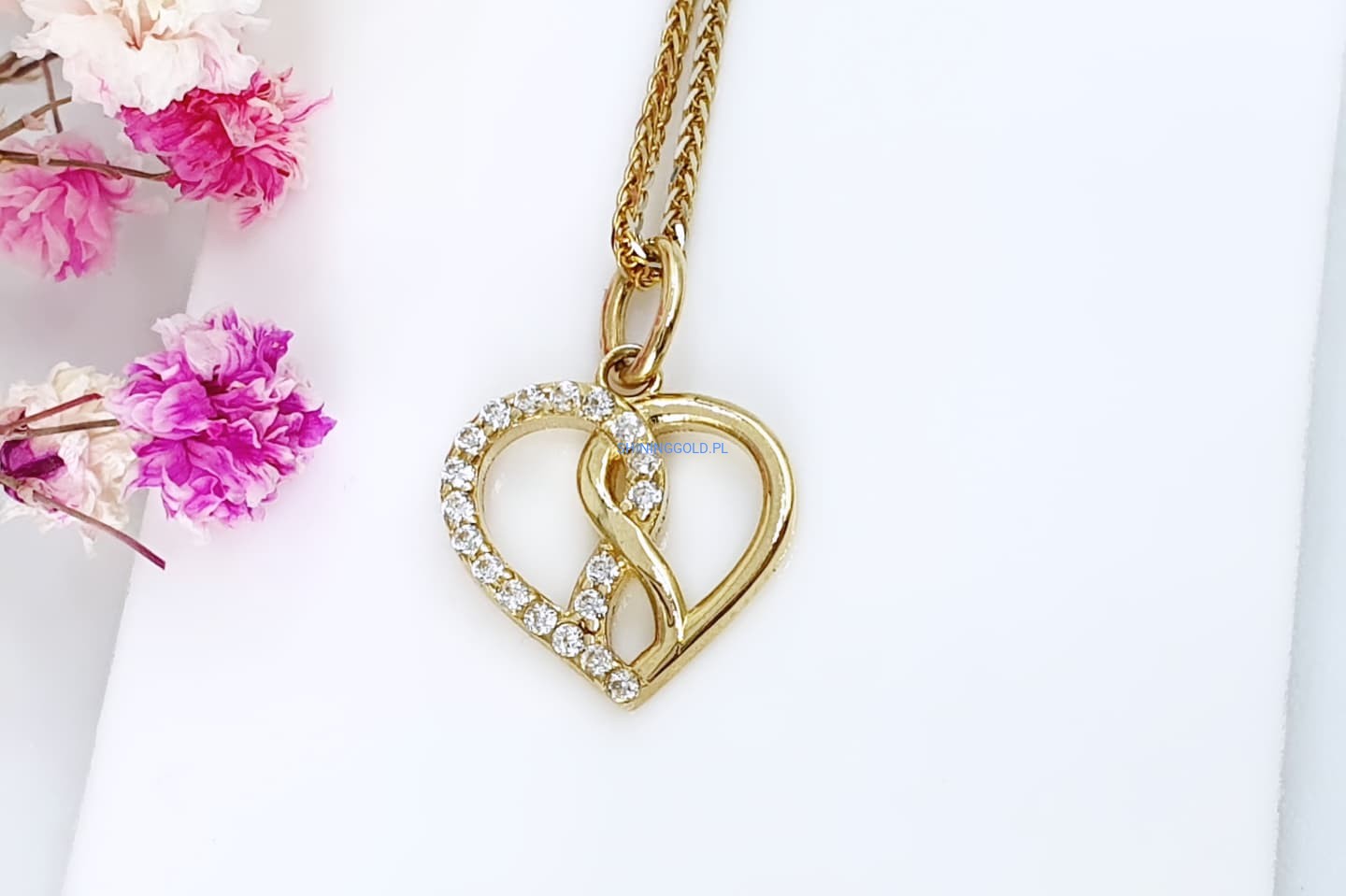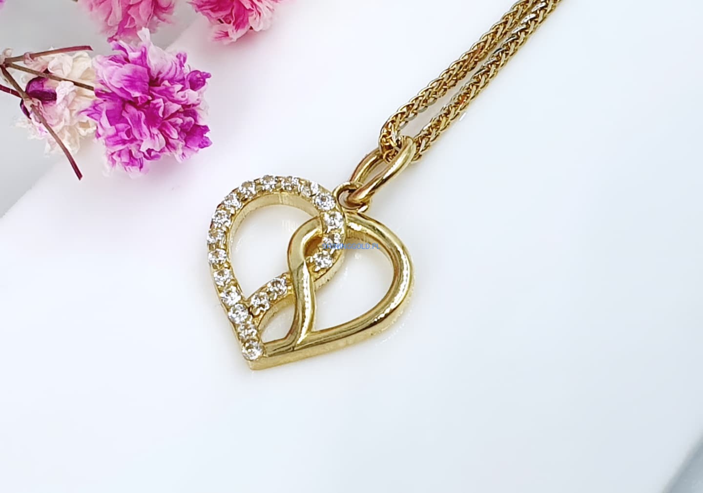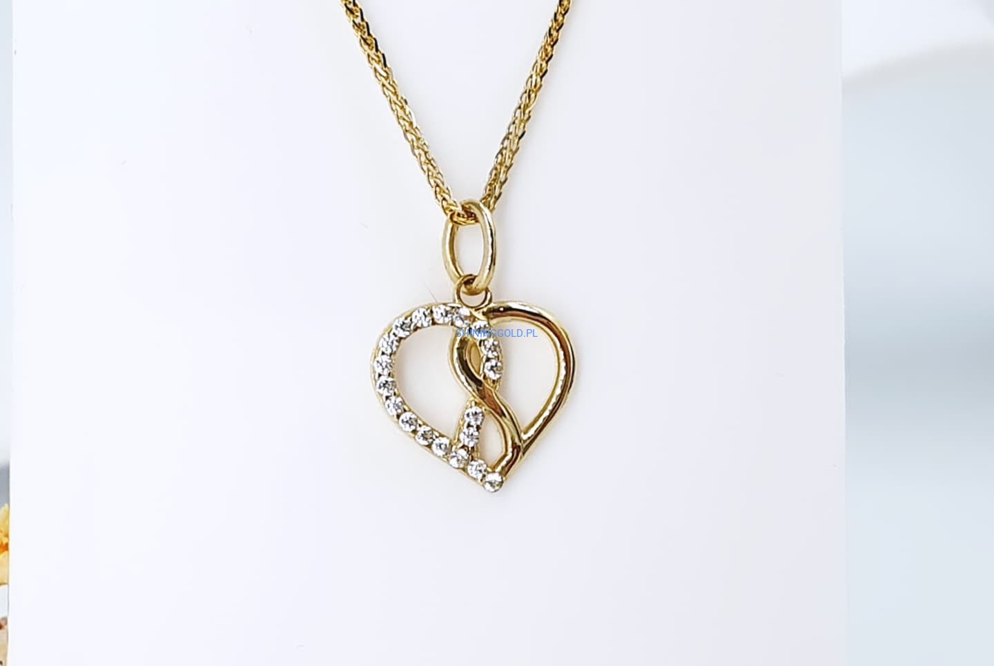 Delikatna zawieszka w kształcie serduszka, wykonana z żółtego złota próby 585, ozdobiona subtelnymi cyrkoniami, które pięknie odbijają światło i dodają całości eleganckiego blasku.