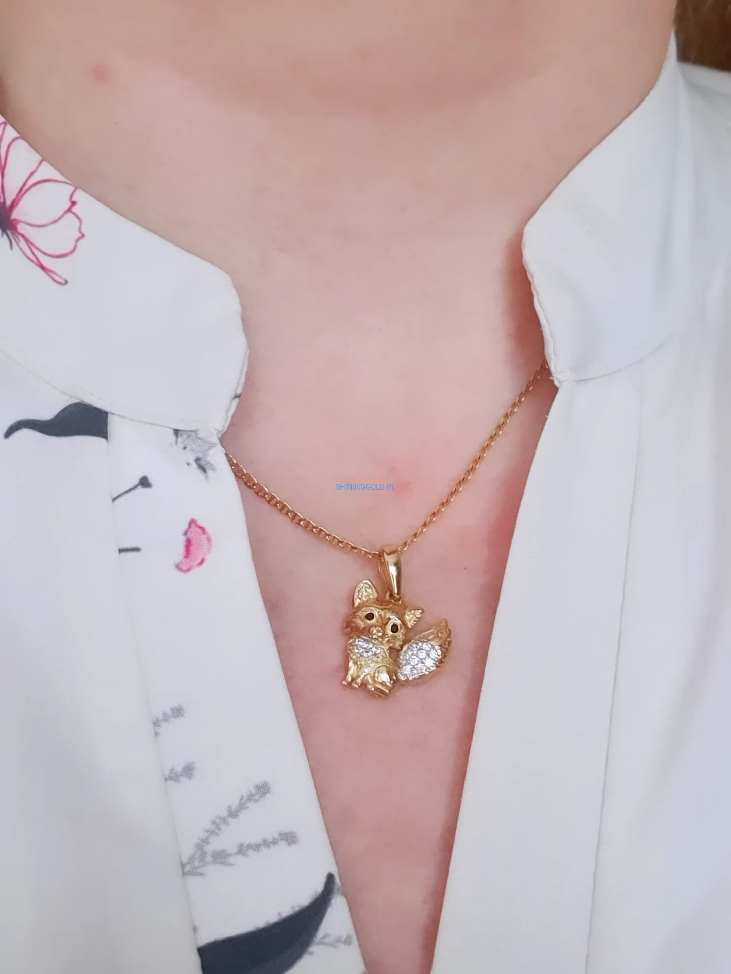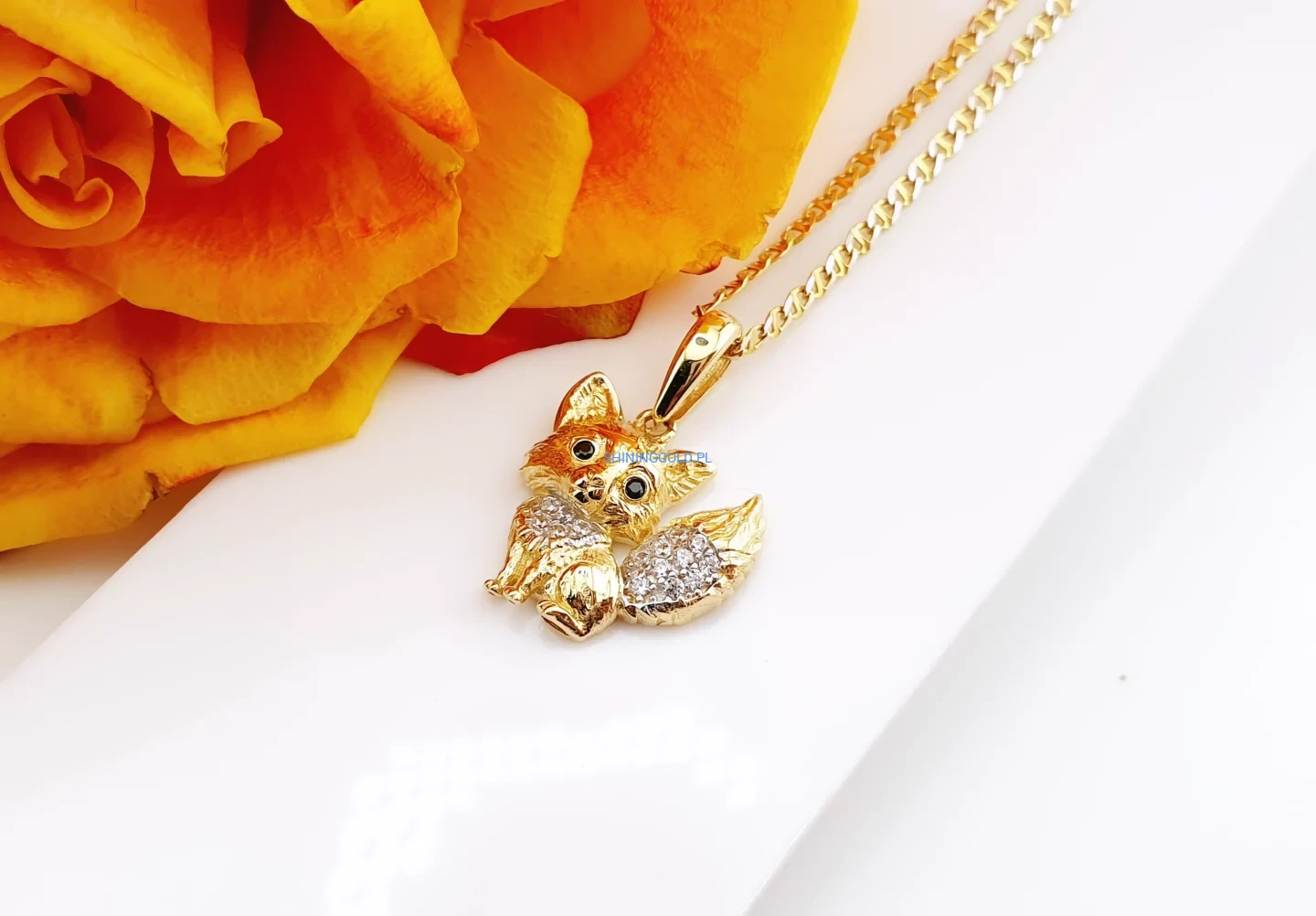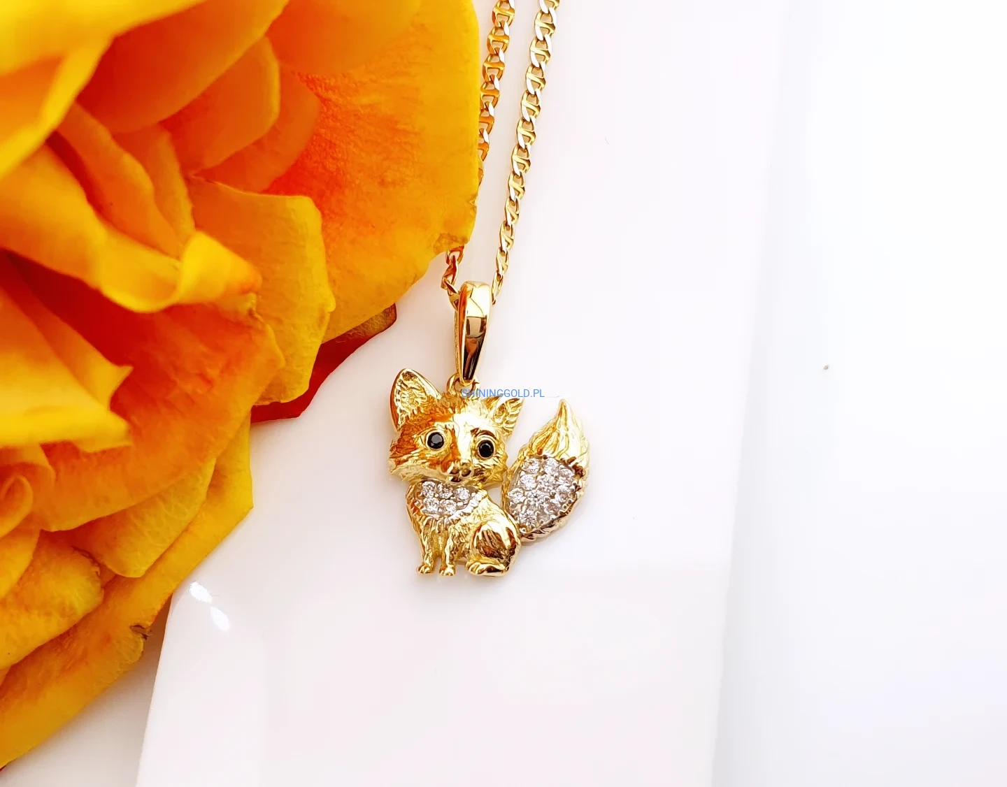 Urocza zawieszka wykonana ze złota próby 585, ozdobiona cyrkoniami, które dodają jej lekkości i blasku. Motyw liska nadaje biżuterii wyjątkowego charakteru – idealna propozycja dla osób ceniących delikatne, ale oryginalne dodatki.