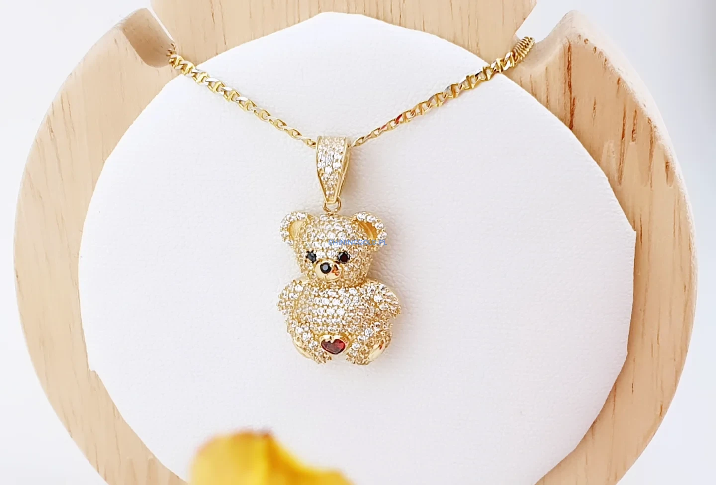 Zawieszka wykonana ze złota próby 585, bogato zdobiona cyrkoniami, które pięknie odbijają światło. Delikatny motyw misia z serduszkiem nadaje całości wyjątkowego, romantycznego charakteru – idealna na prezent dla bliskiej osoby.