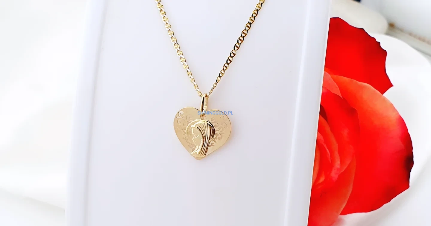 Subtelna i pełna symboliki złota zawieszka wykonana ze złota próby 375. Motyw serca połączony z delikatnym wizerunkiem Matki Boskiej tworzy wyjątkową biżuterię o duchowym i sentymentalnym charakterze. Gładko polerowana powierzchnia pięknie odbija światło, a drobne zdobienia dodają całości elegancji.