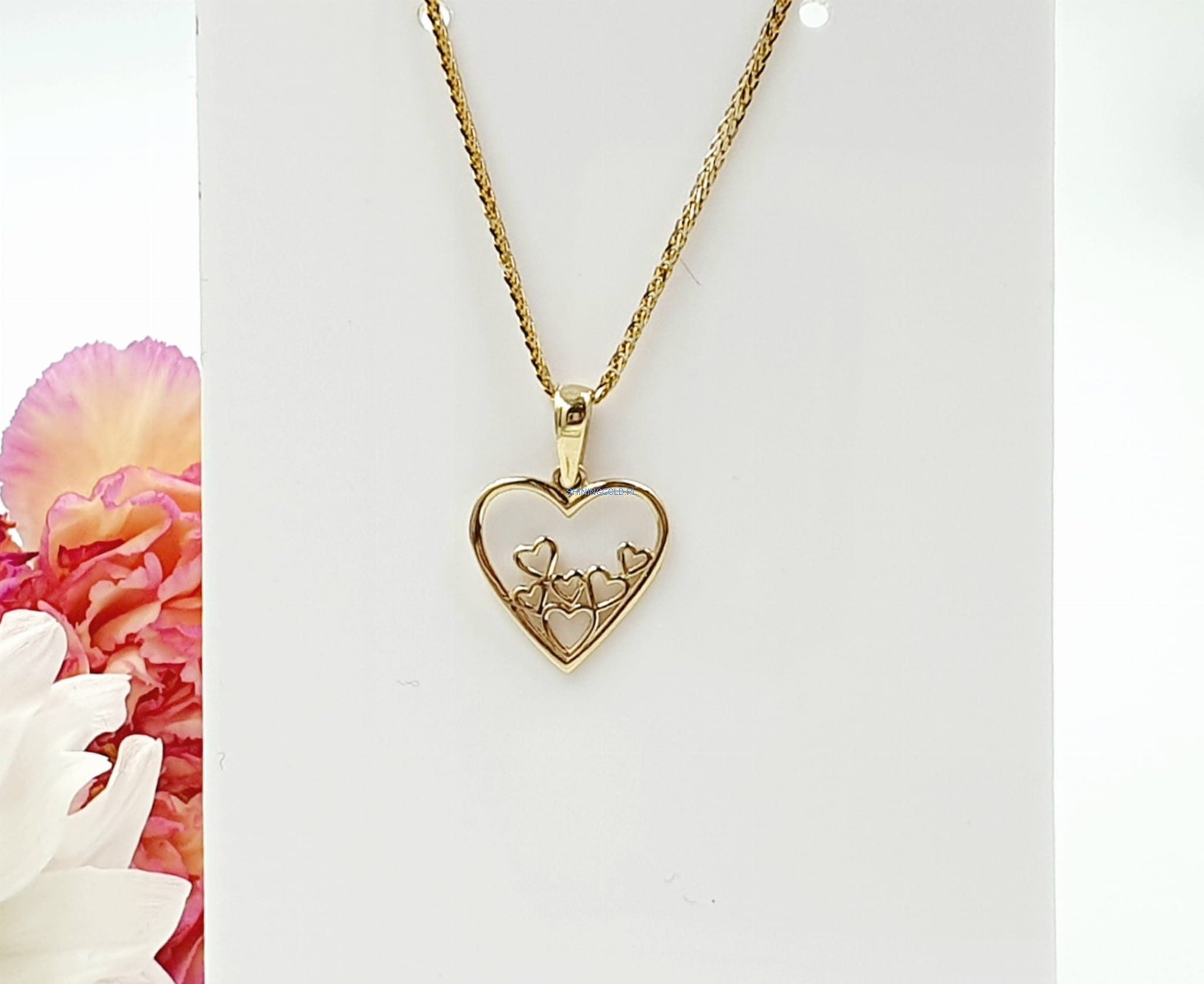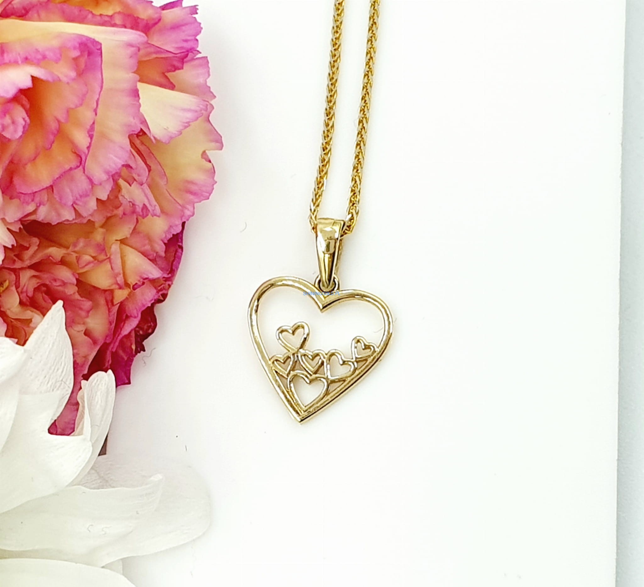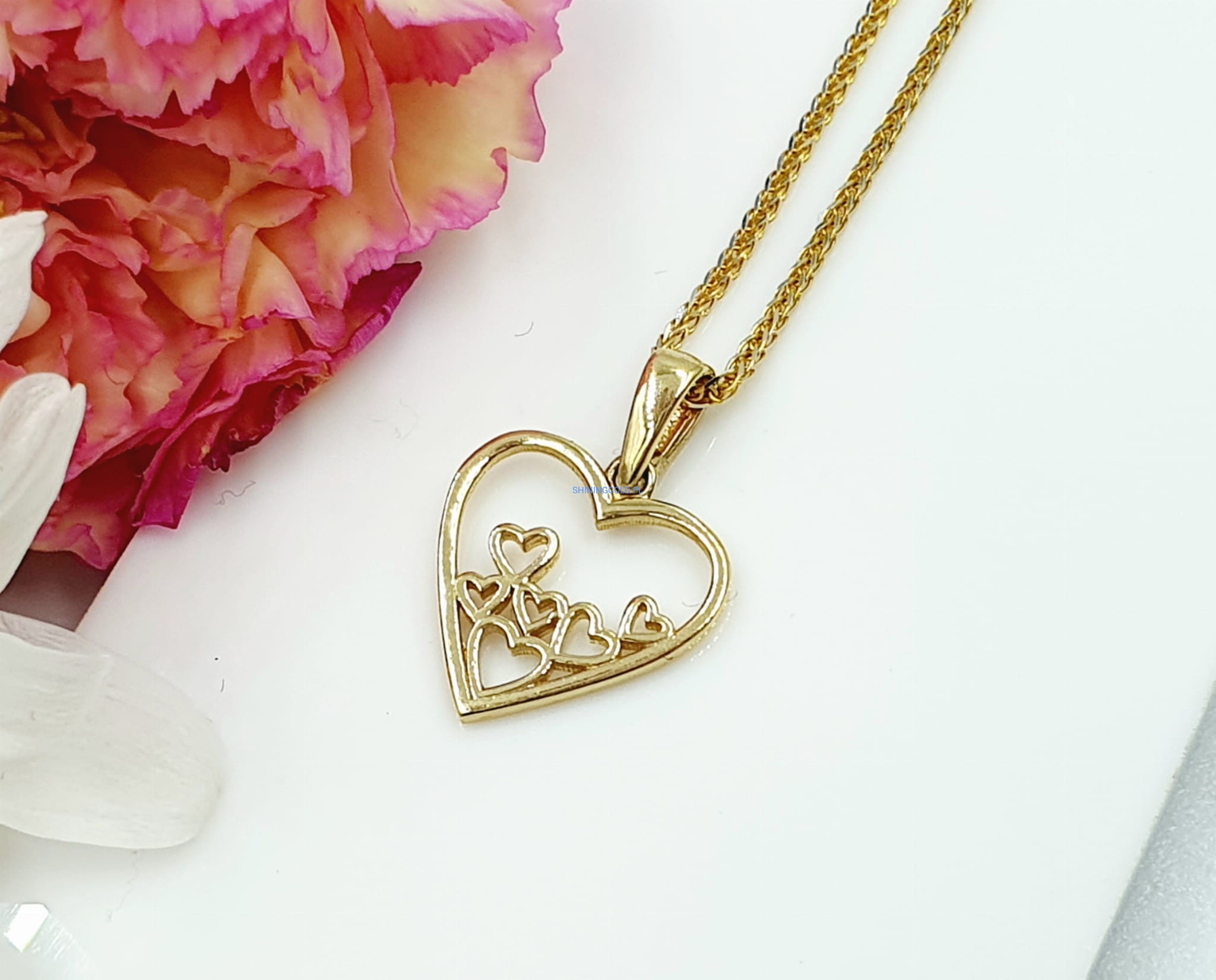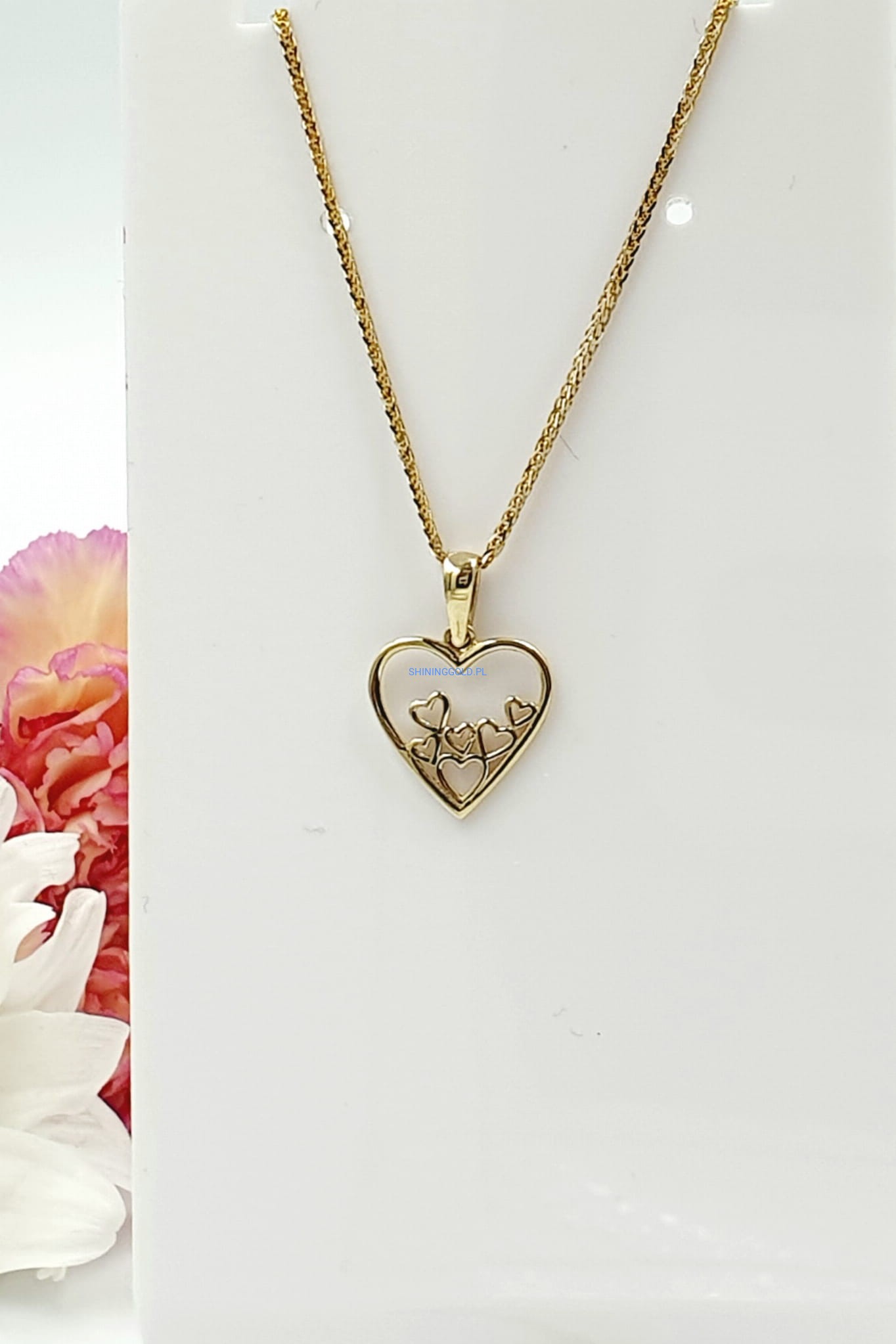 Urocza zawieszka w kształcie serca, wypełniona mniejszymi serduszkami. Delikatny i romantyczny design wykonany z wysokiej jakości złota próby 585. Idealna na prezent lub jako subtelny dodatek do codziennych stylizacji.
