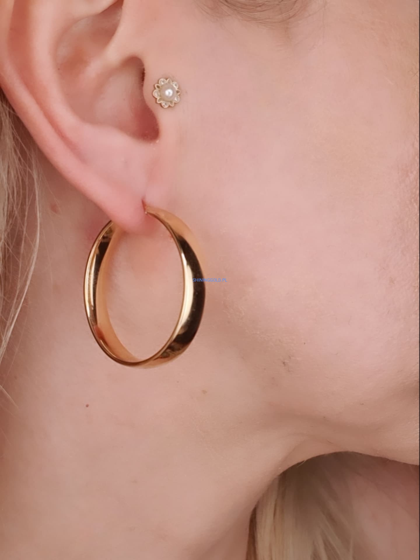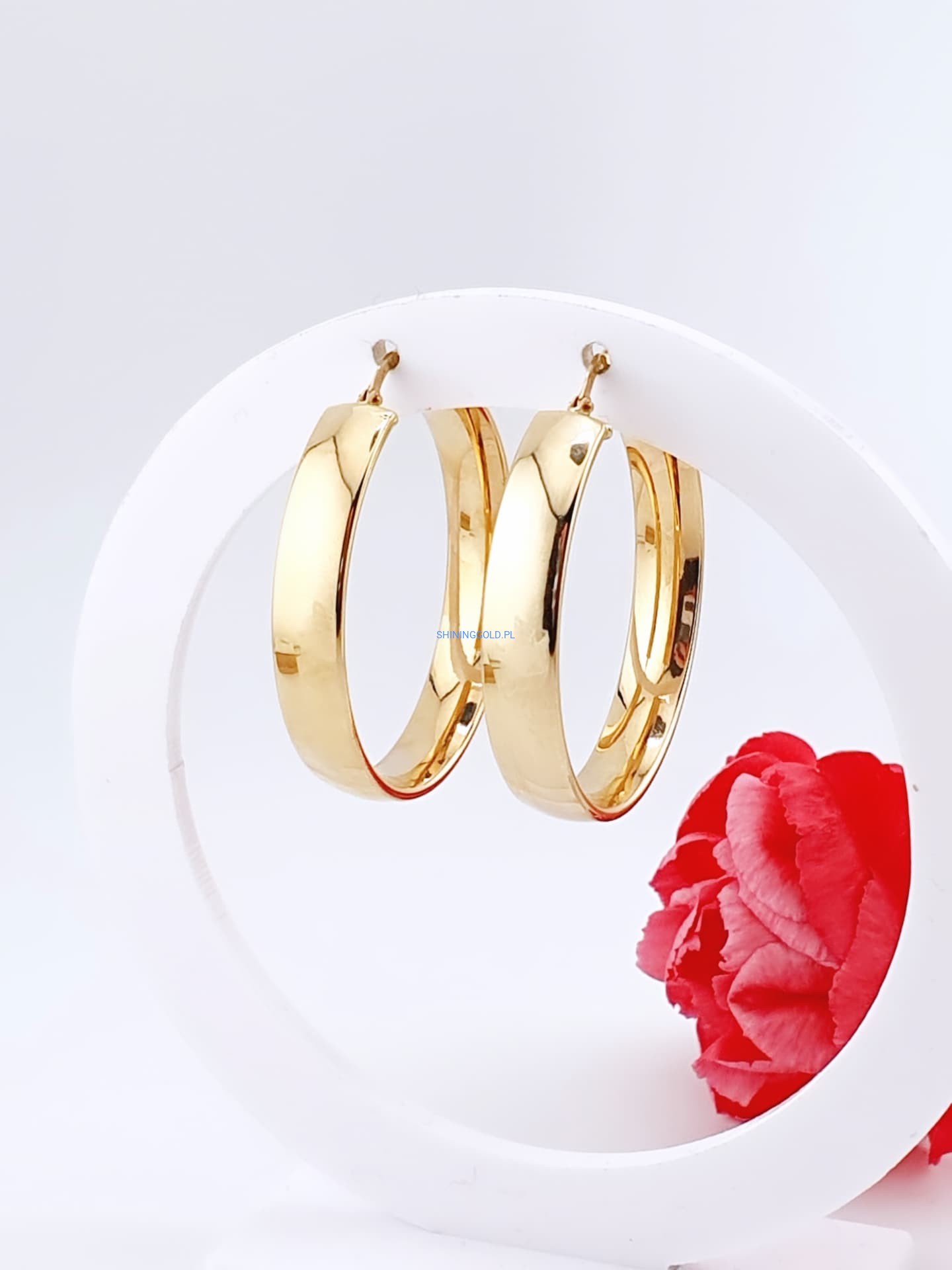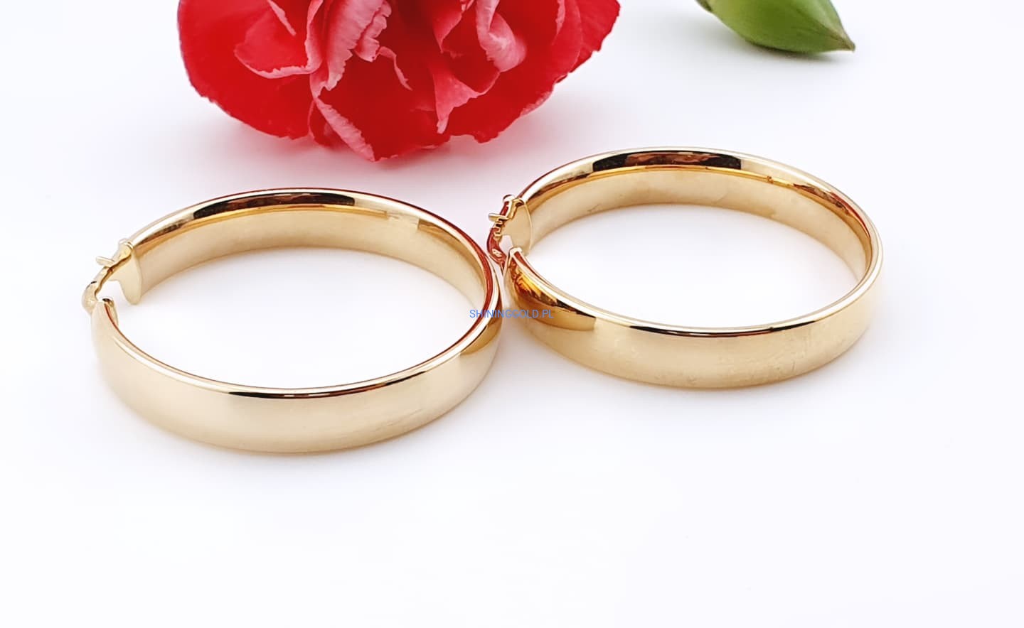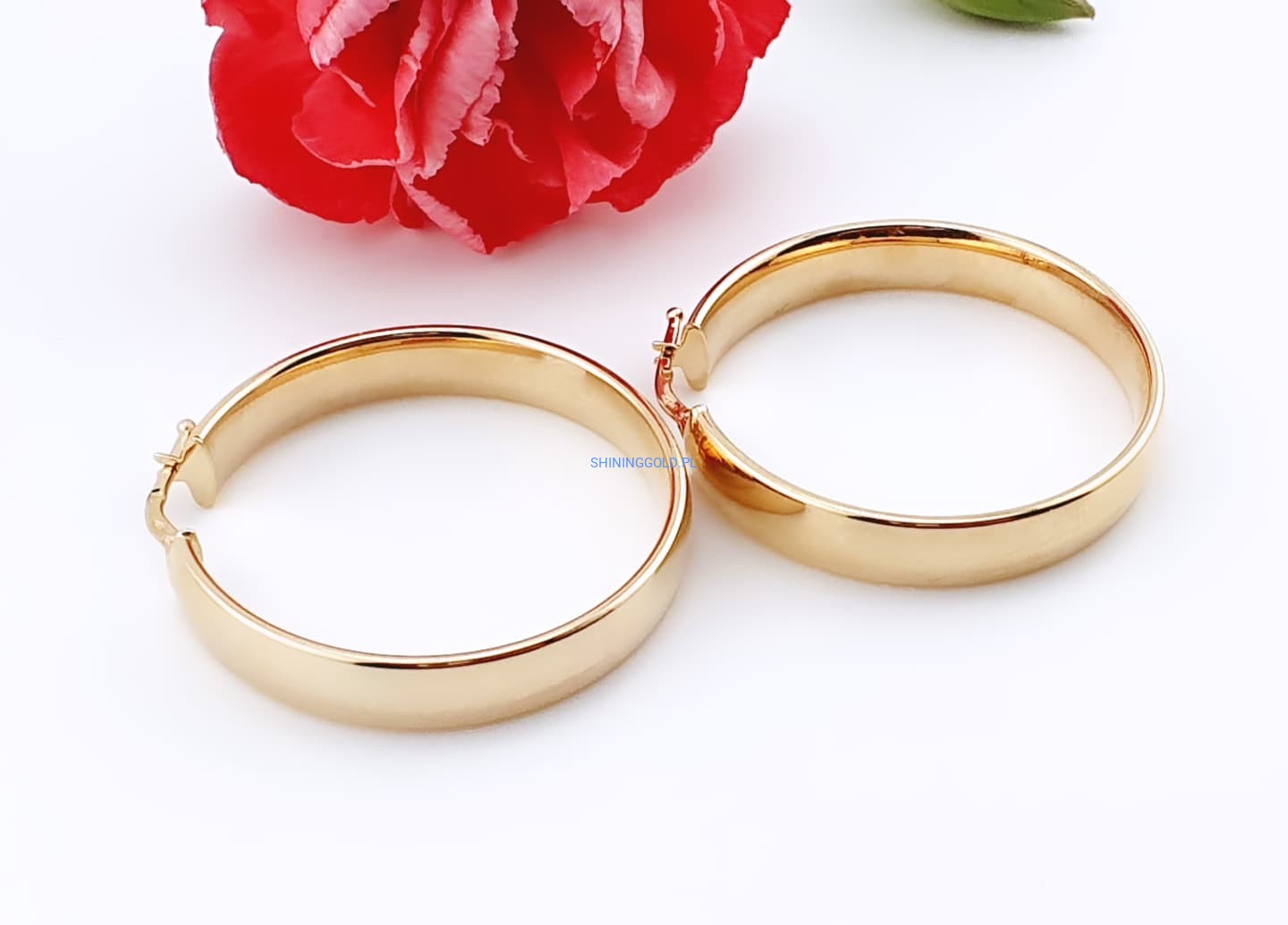 Ponadczasowy design: Szerokie koła to klasyka, która nigdy nie wychodzi z mody, a lekko różowe złoto dodaje im nowoczesnego charakteru.