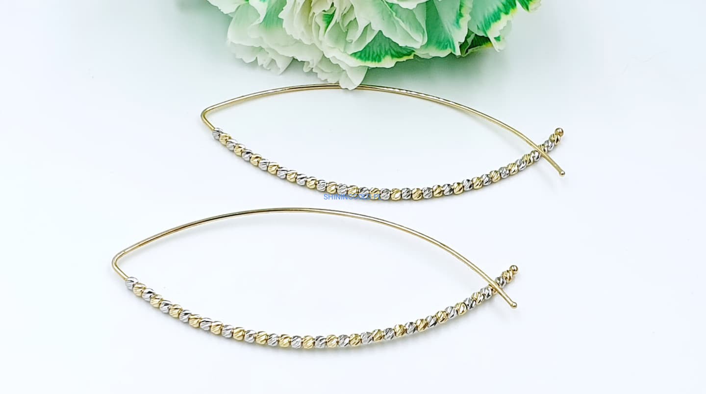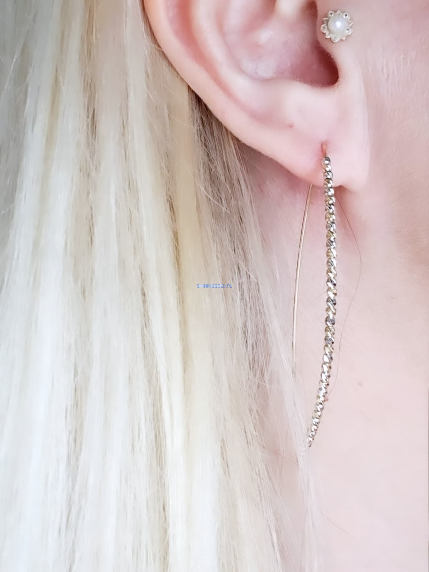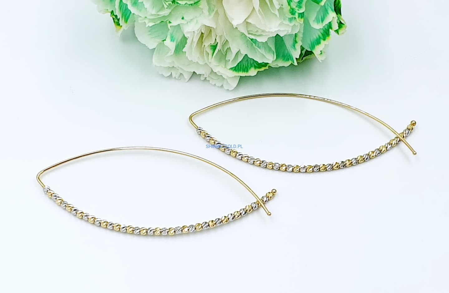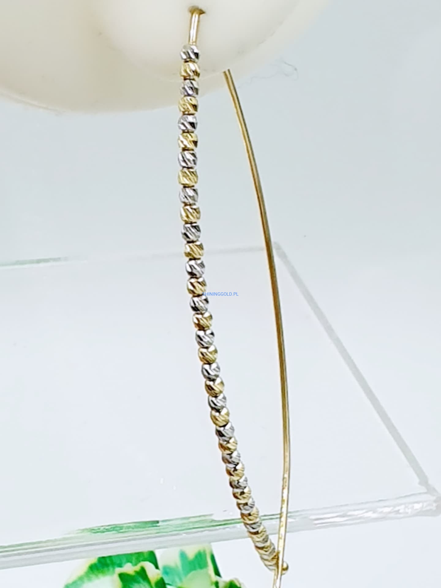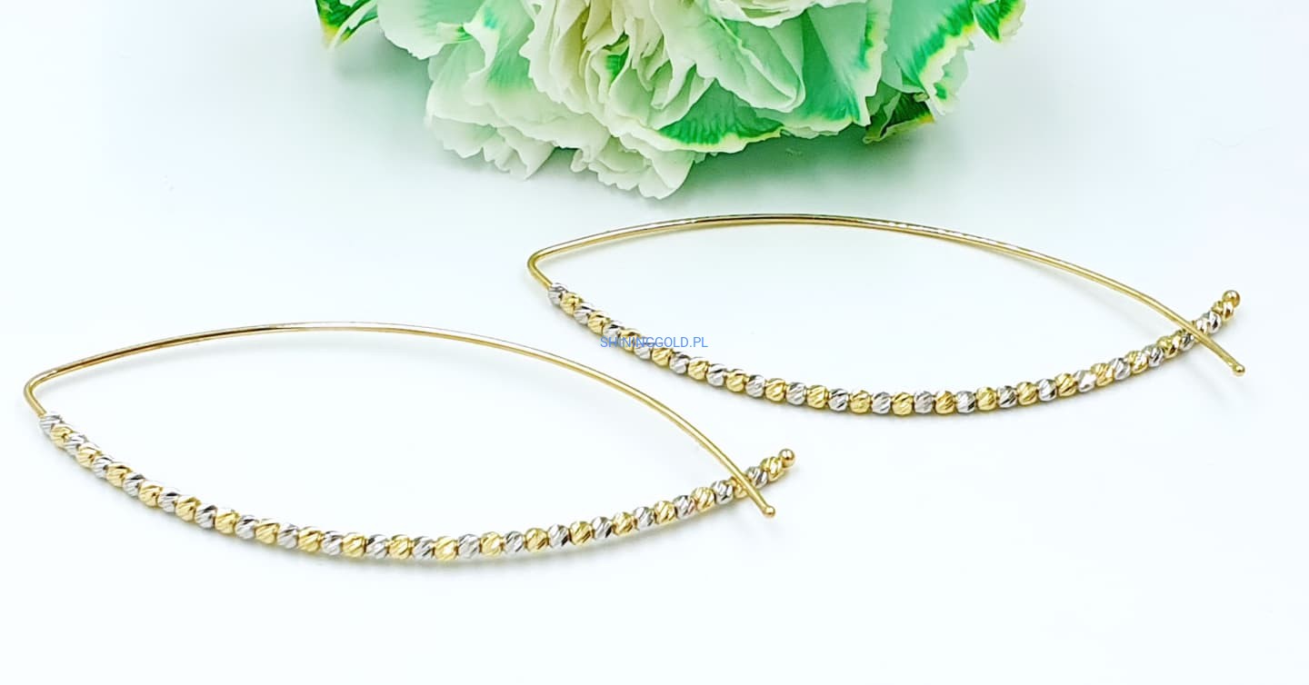 Te długie, złote kolczyki zachwycają swoją finezyjną formą oraz subtelnym blaskiem. Wykonane z wysokiej próby złota 585 z małymi, błyszczącymi kuleczkami.