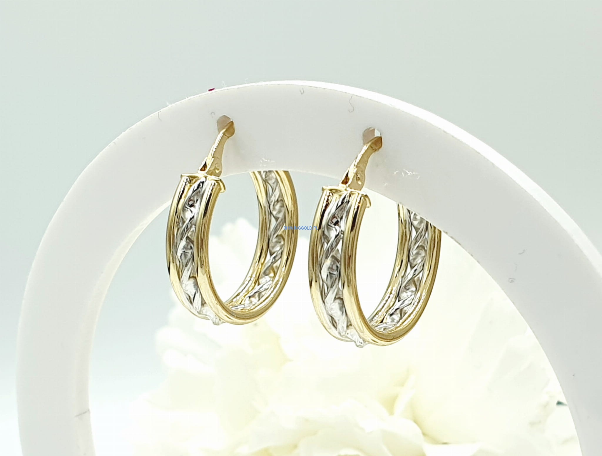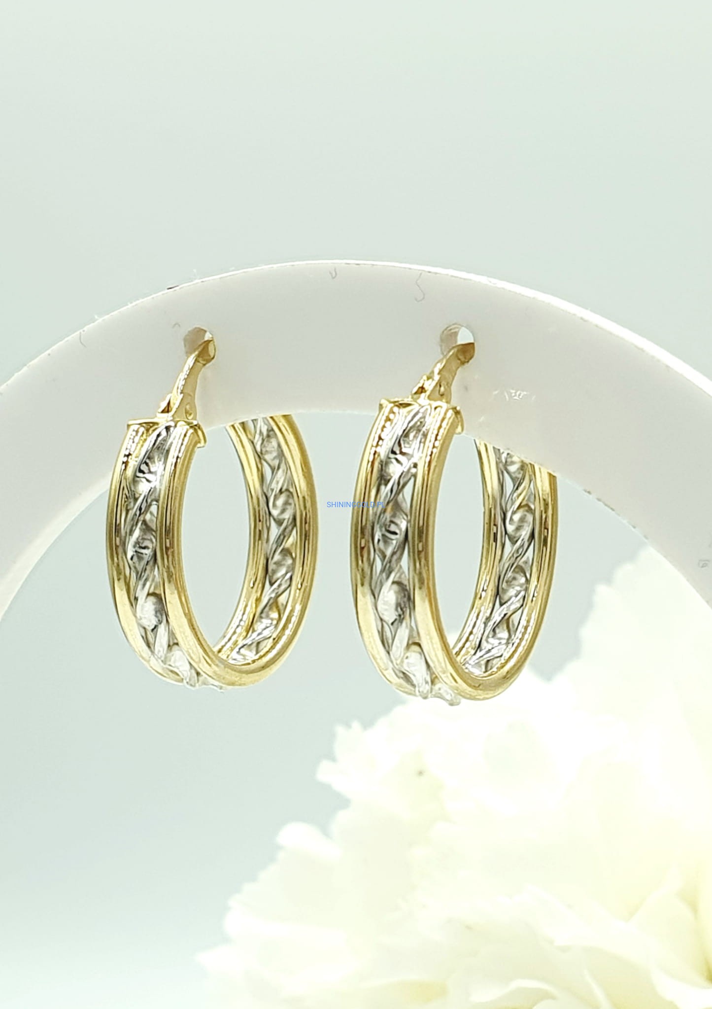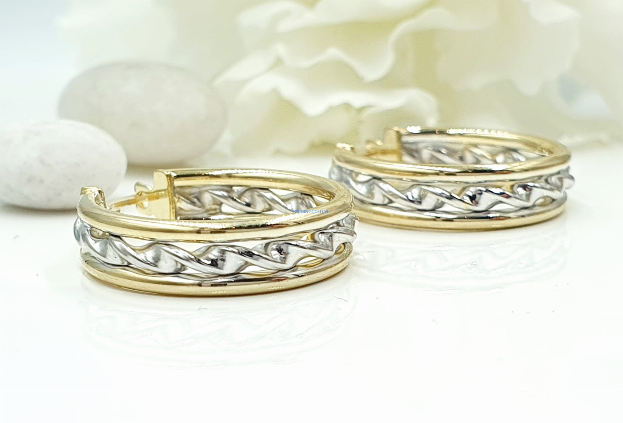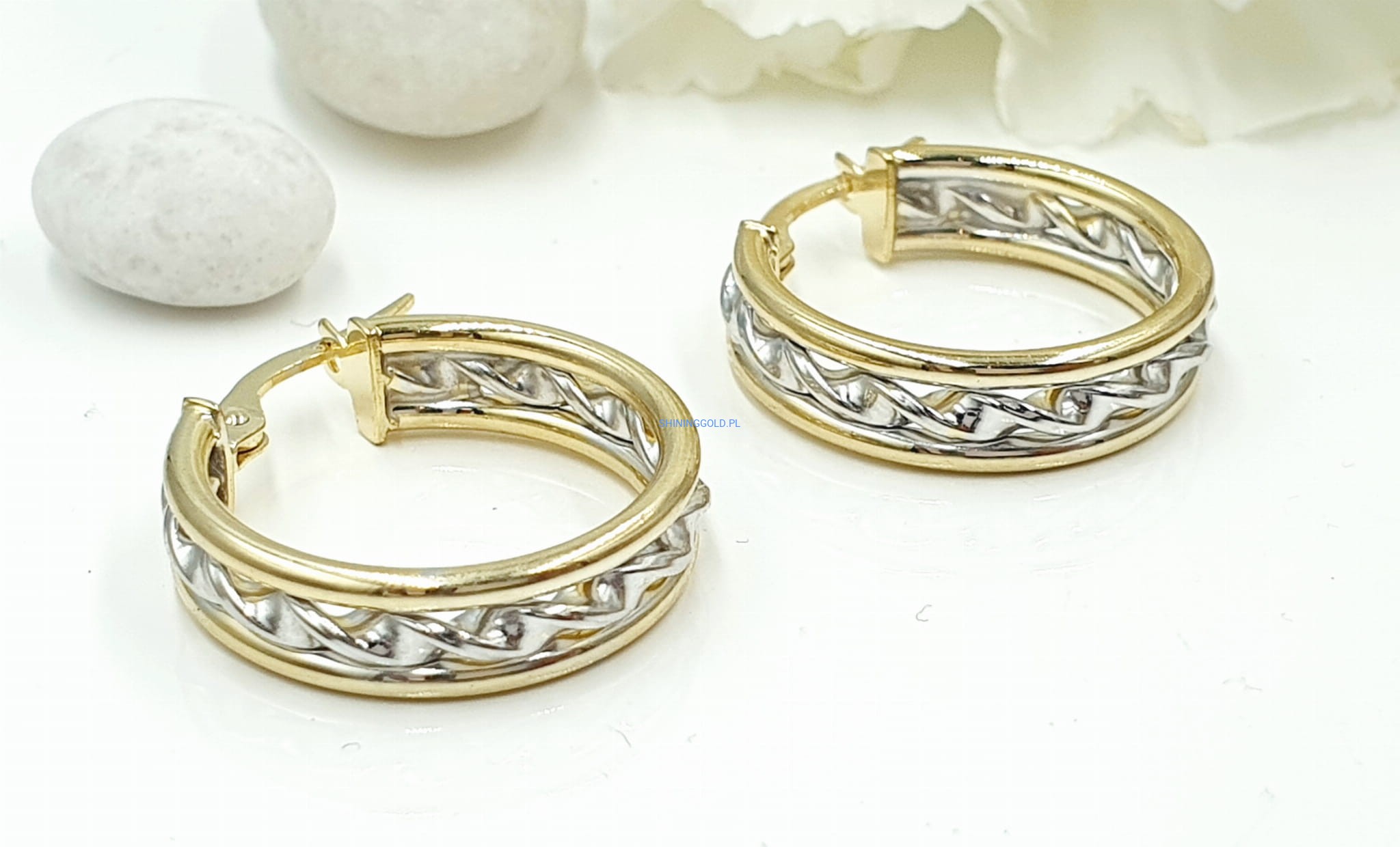 Nowe złote kolczyki Złote kolczyki w stylu eleganckiej klasyki z nowoczesnym akcentem. Wykonane z dwóch kolorów złota — żółtego i białego — co dodaje im wyrafinowanego i unikalnego charakteru. Idealne na co dzień oraz do bardziej formalnych stylizacji.