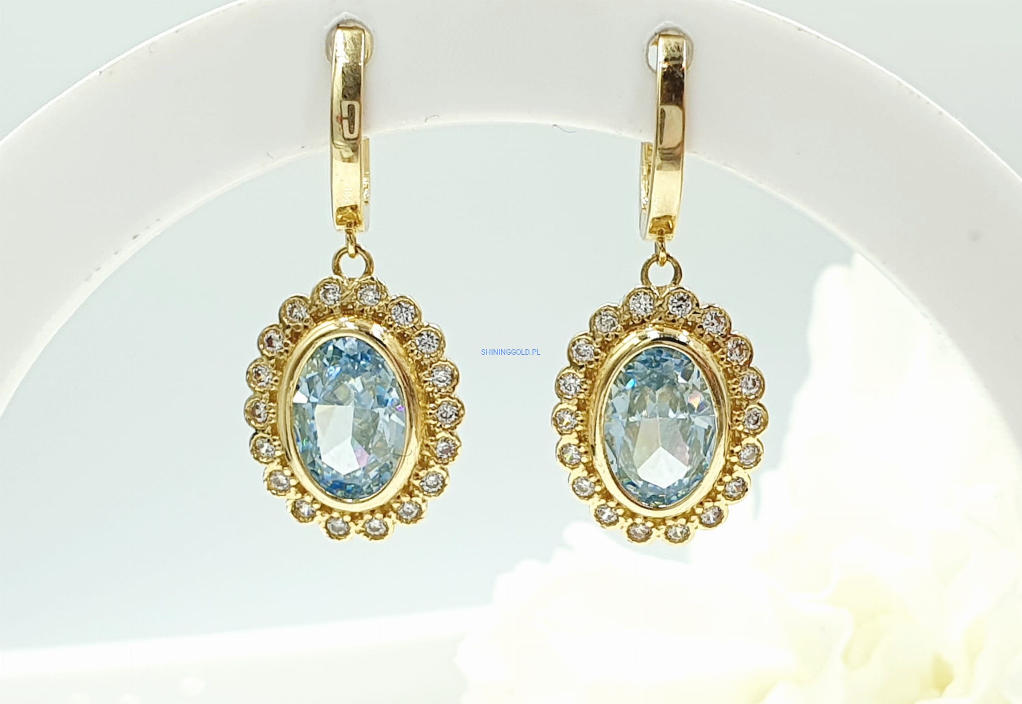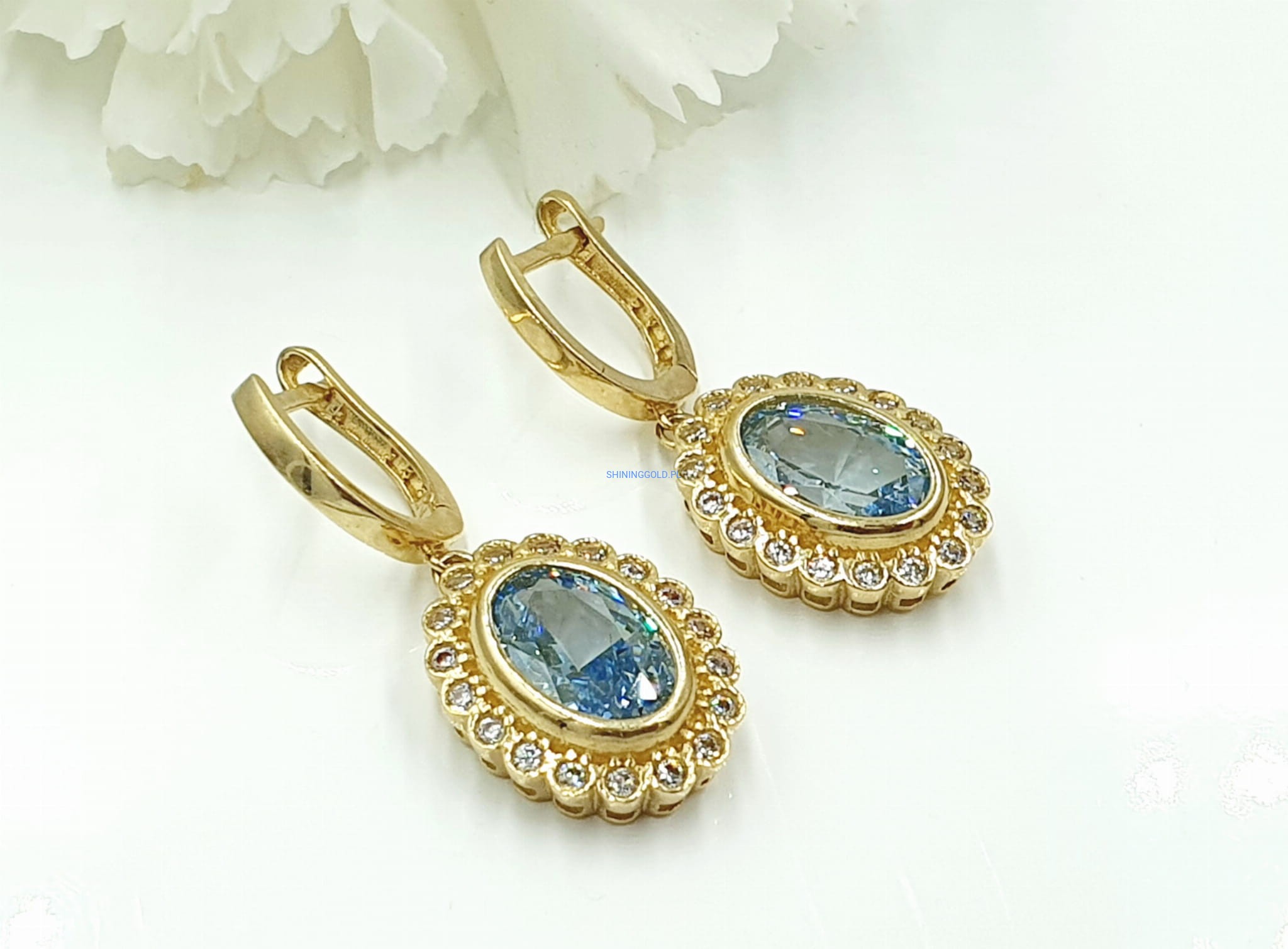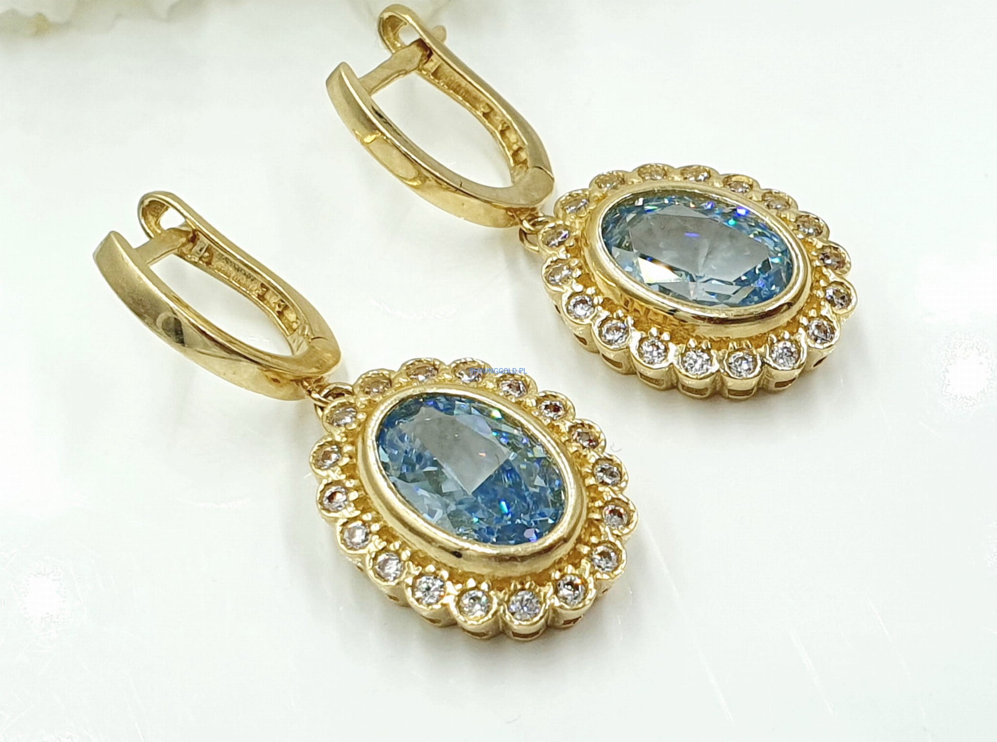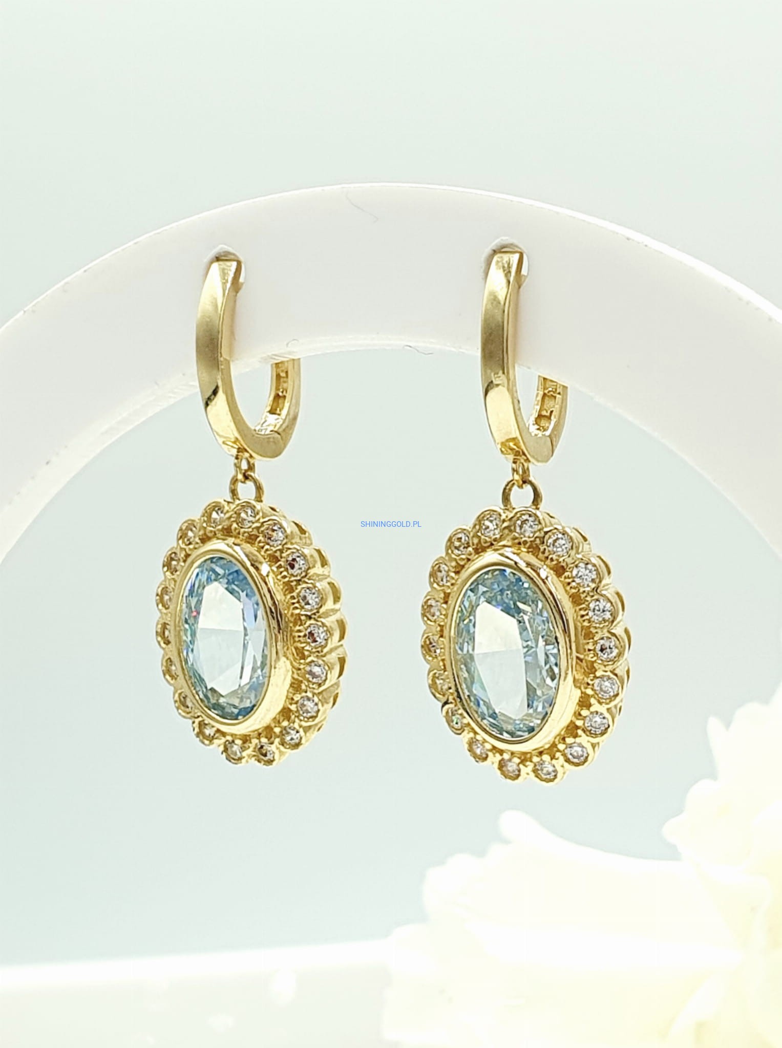 - Błękitny kamień centralny: Czysty, subtelny odcień błękitu w centralnej części kolczyków nadaje im wyrafinowanego uroku.