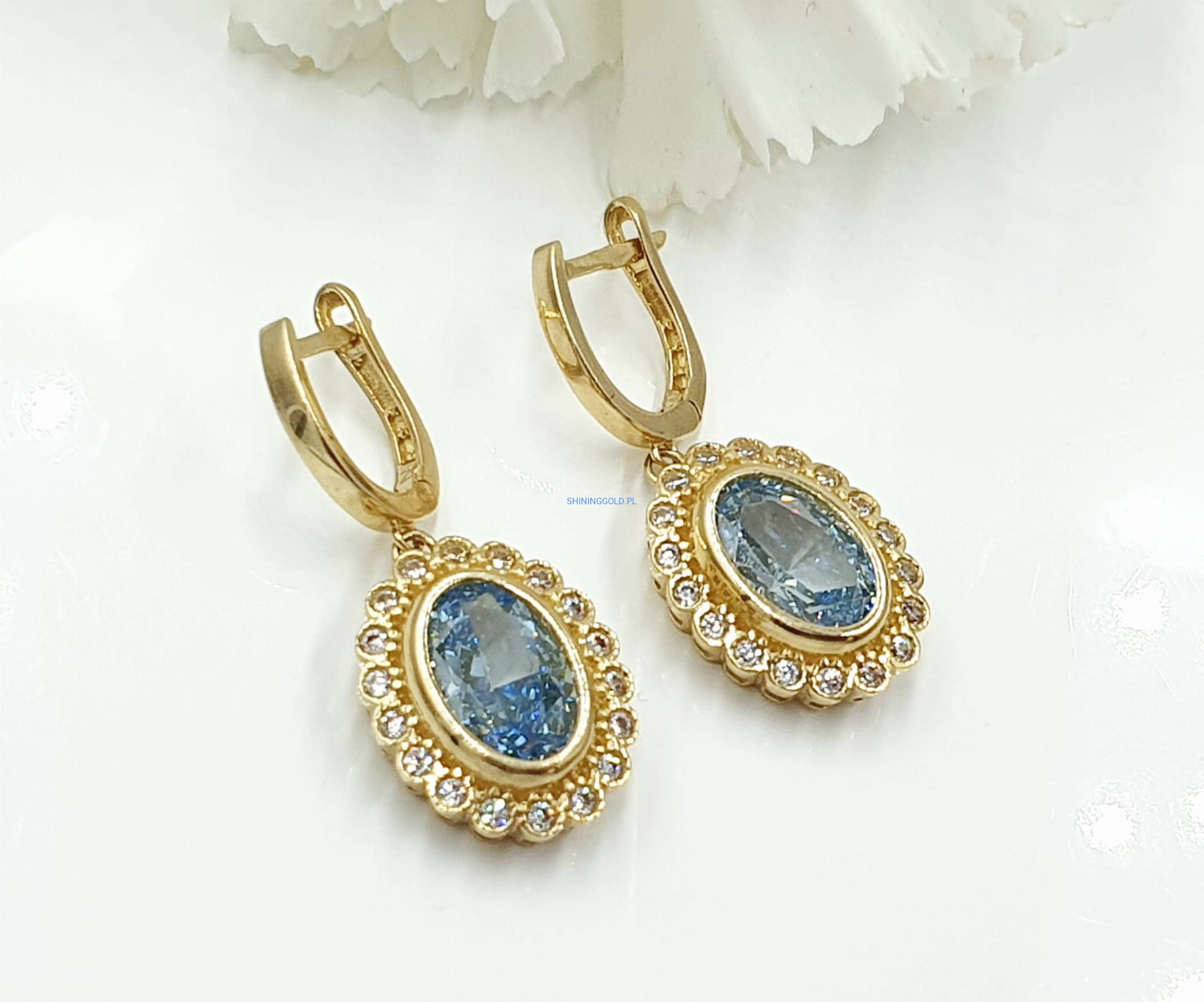 Piękne, nowe złote kolczyki z centralnym błękitnym kamieniem otoczonym delikatnymi cyrkoniami, które dodają im blasku i elegancji. Te kolczyki to wyjątkowy akcent, który idealnie sprawdzi się jako dodatek do wieczorowych i codziennych stylizacji.