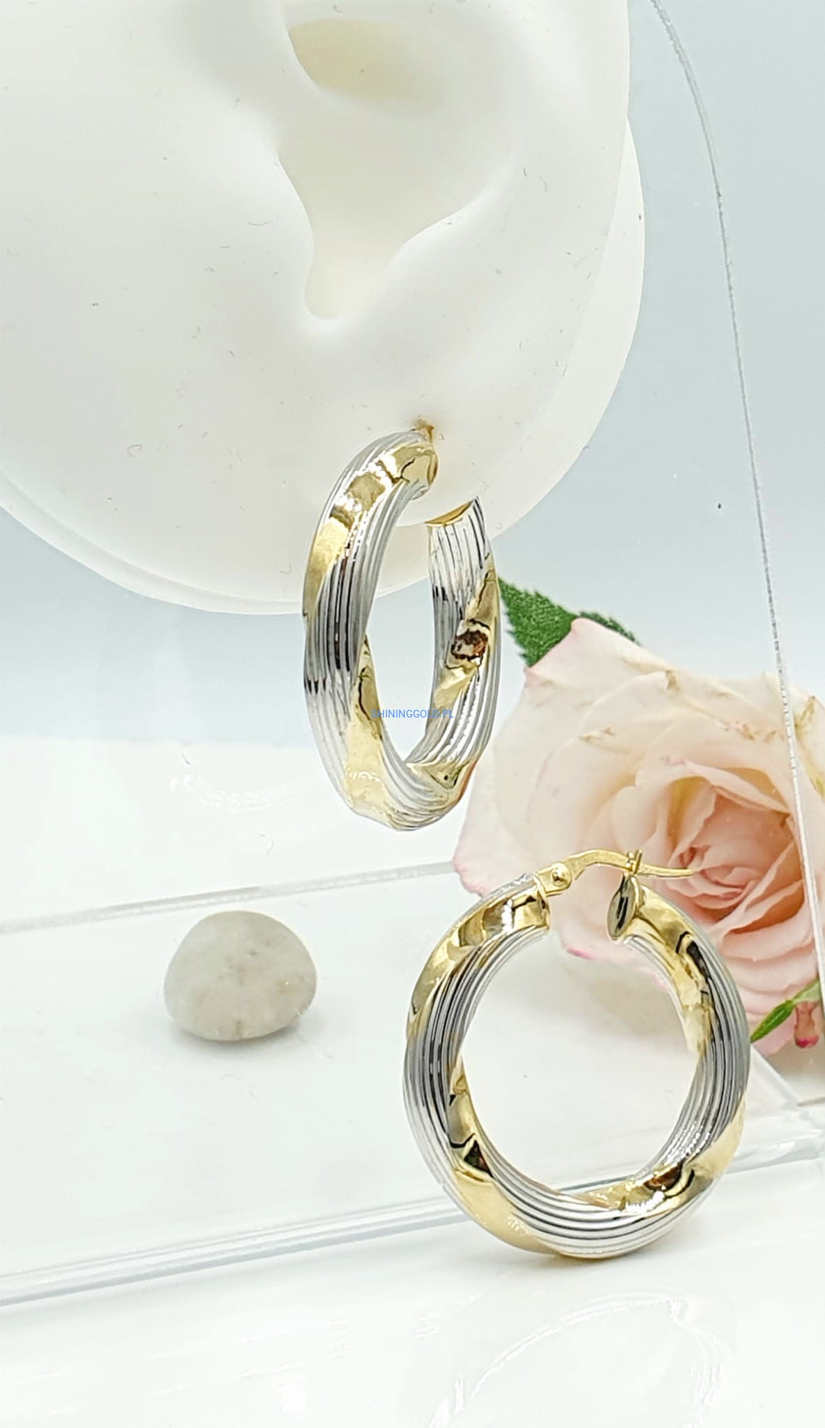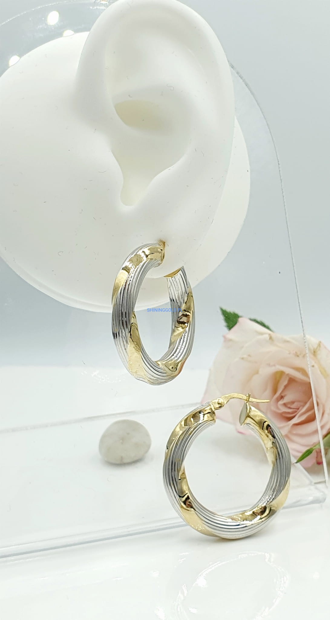 Nowe, złote kolczyki wykonane z połączenia żółtego i białego złota, które nadają im elegancki i nowoczesny wygląd. Kolczyki o klasycznym, okrągłym kształcie, świetnie pasują zarówno do codziennych, jak i bardziej eleganckich stylizacji.