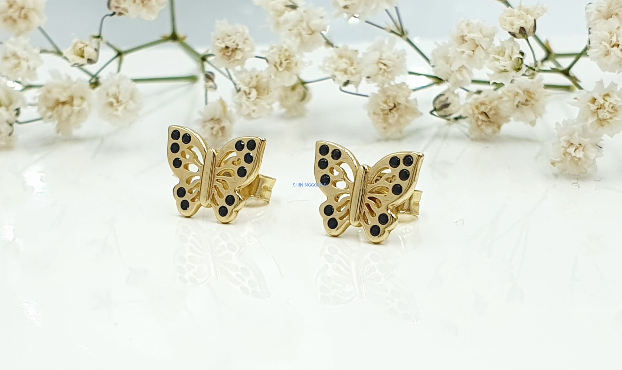Urocze kolczyki w kształcie motylków, wykonane z wysokiej jakości żółtego złota o próbie 585. Delikatny design i subtelne wymiary (8 mm wysokości, 10 mm szerokości) sprawiają, że idealnie nadają się zarówno na co dzień, jak i na wyjątkowe okazje