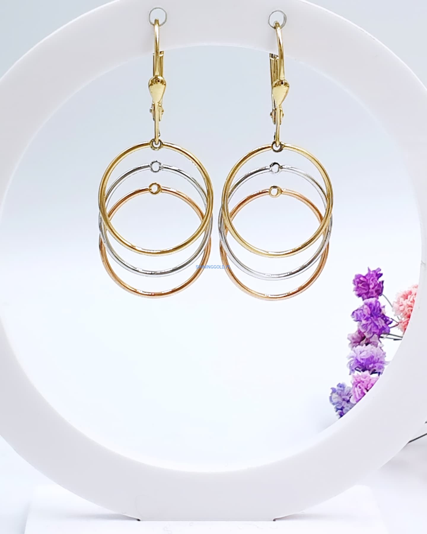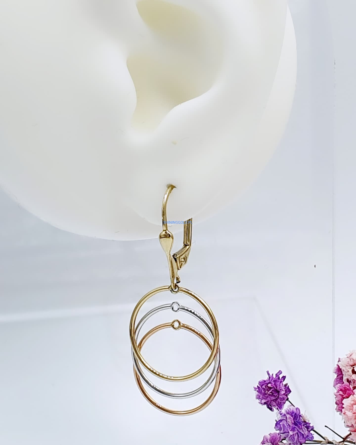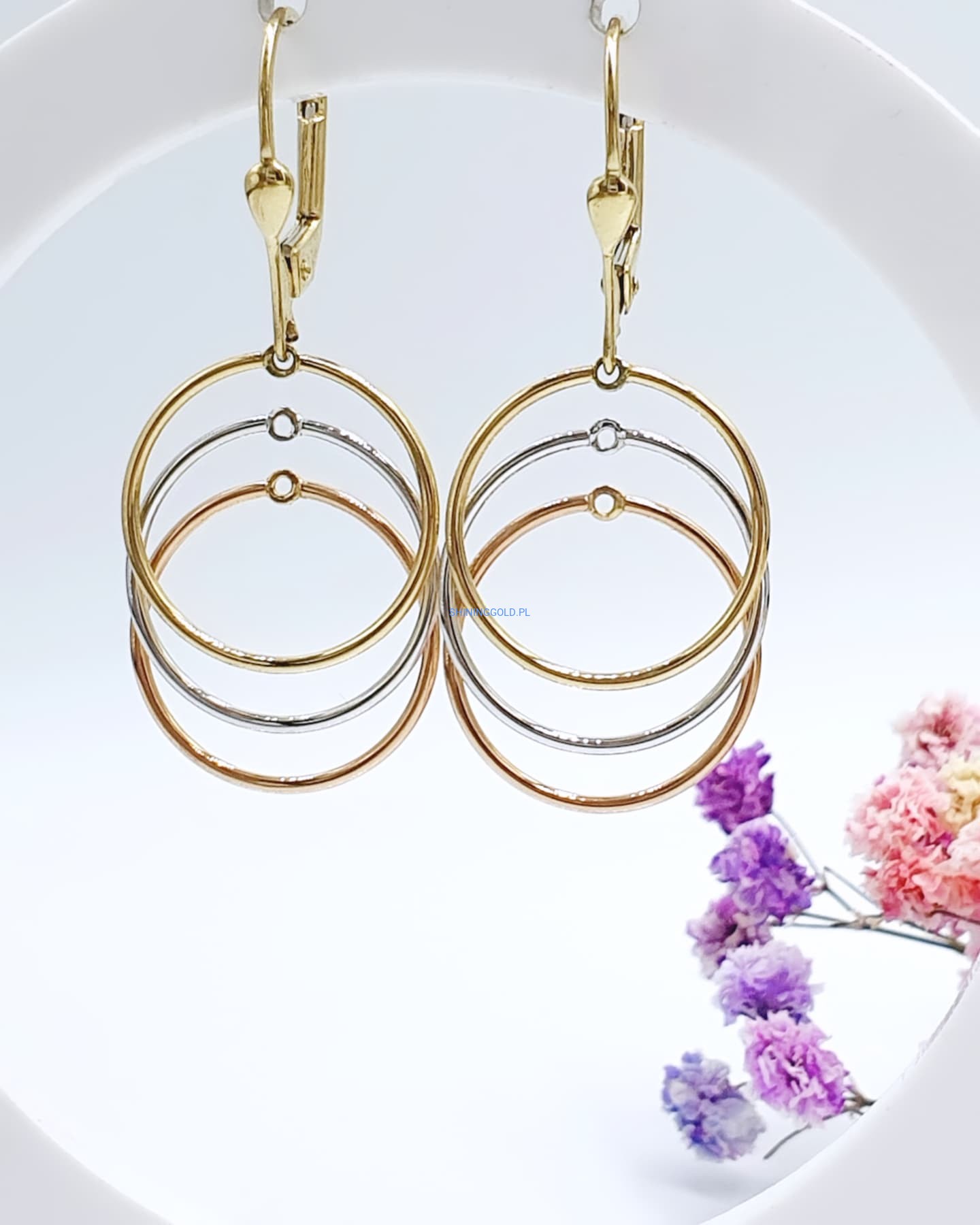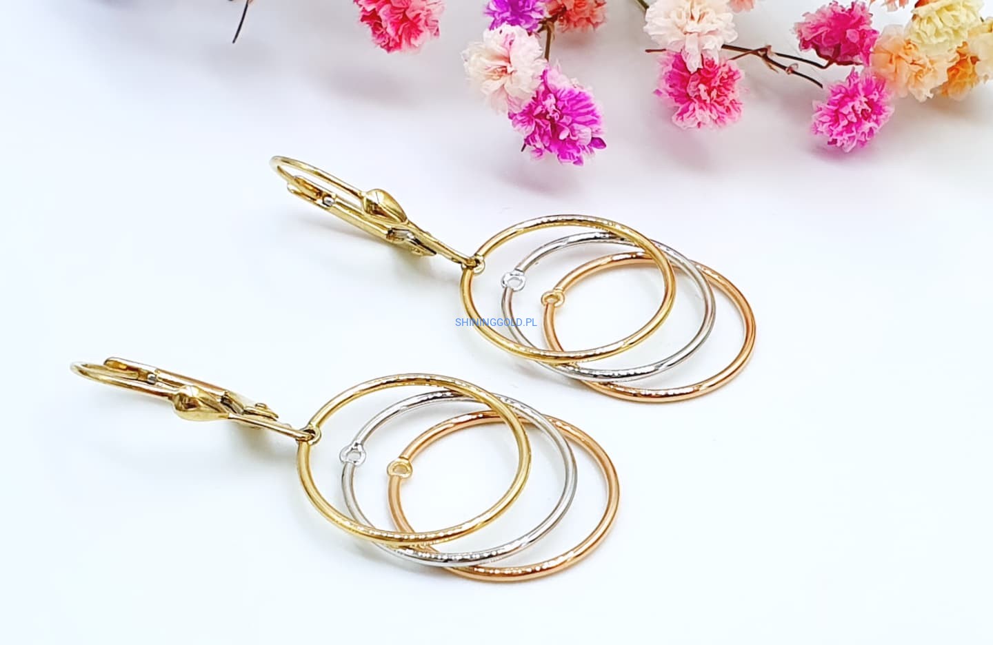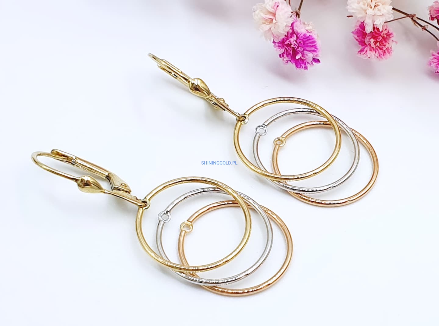 Eleganckie, złote kolczyki wiszące w formie trzech połączonych kół w trzech kolorach złota: żółtym, białym i różowym. Ich subtelny, a zarazem nowoczesny design sprawia, że doskonale komponują się zarówno z codziennymi, jak i bardziej eleganckimi stylizacjami.