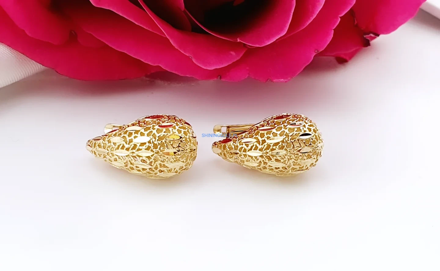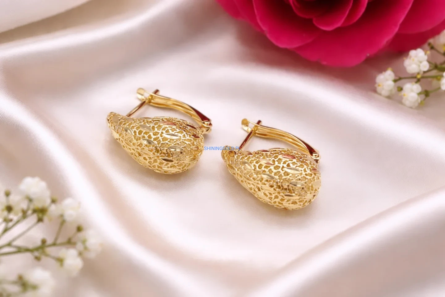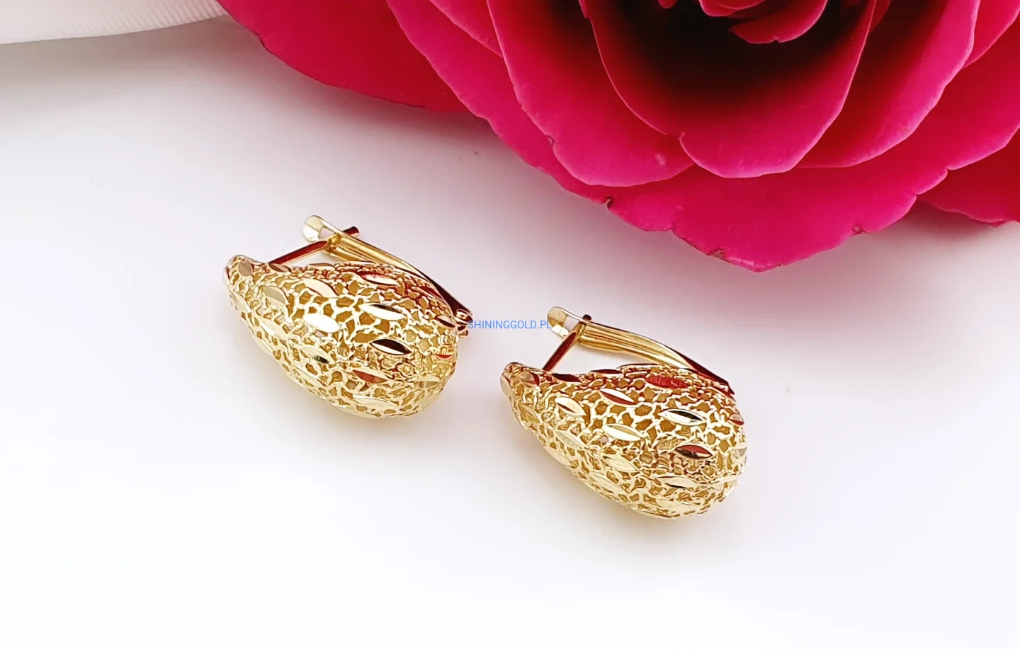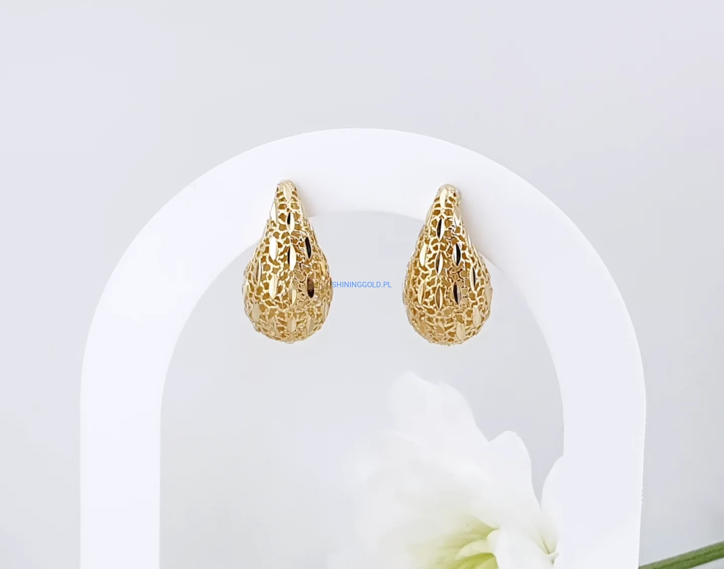 Stylowe kolczyki ze złota próby 585 w formie delikatnych łezek o ażurowej strukturze. Ich lekko wypukły kształt i misterny wzór pięknie odbijają światło, nadając biżuterii subtelnego blasku.