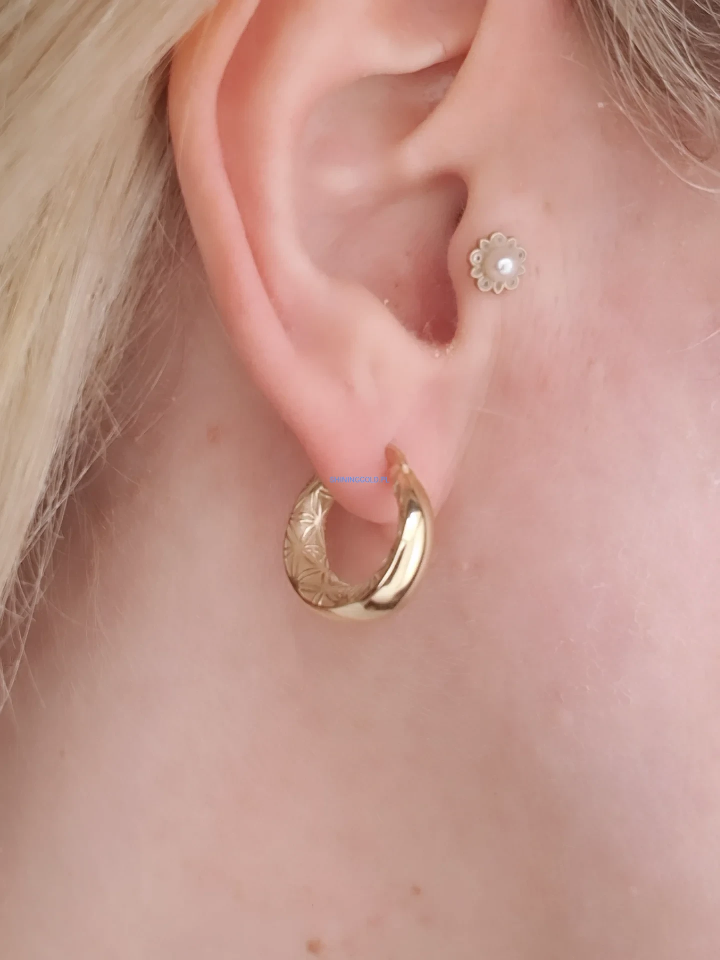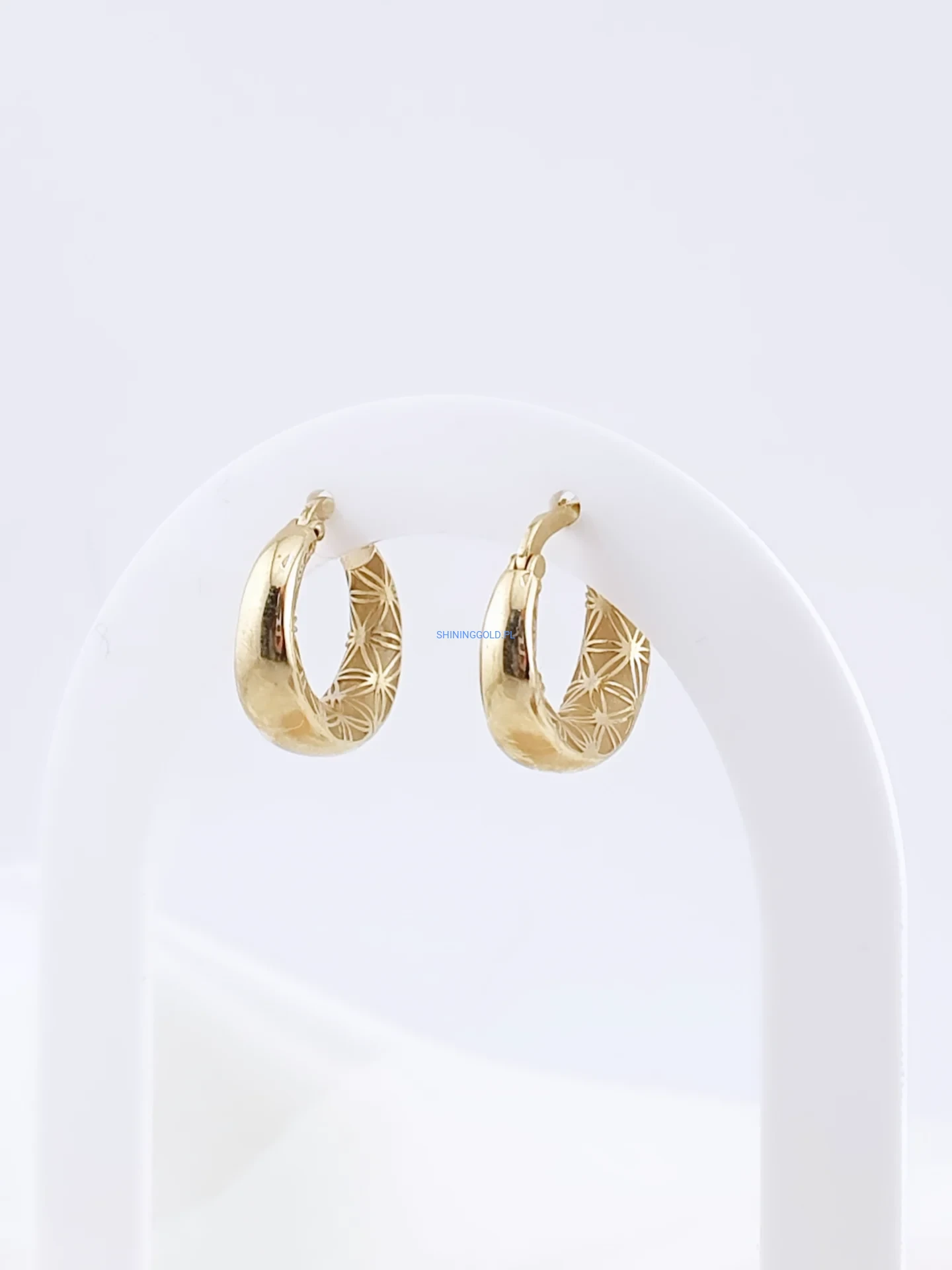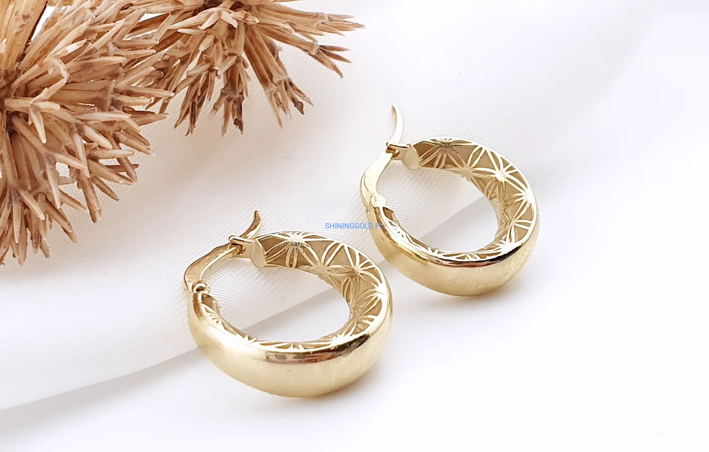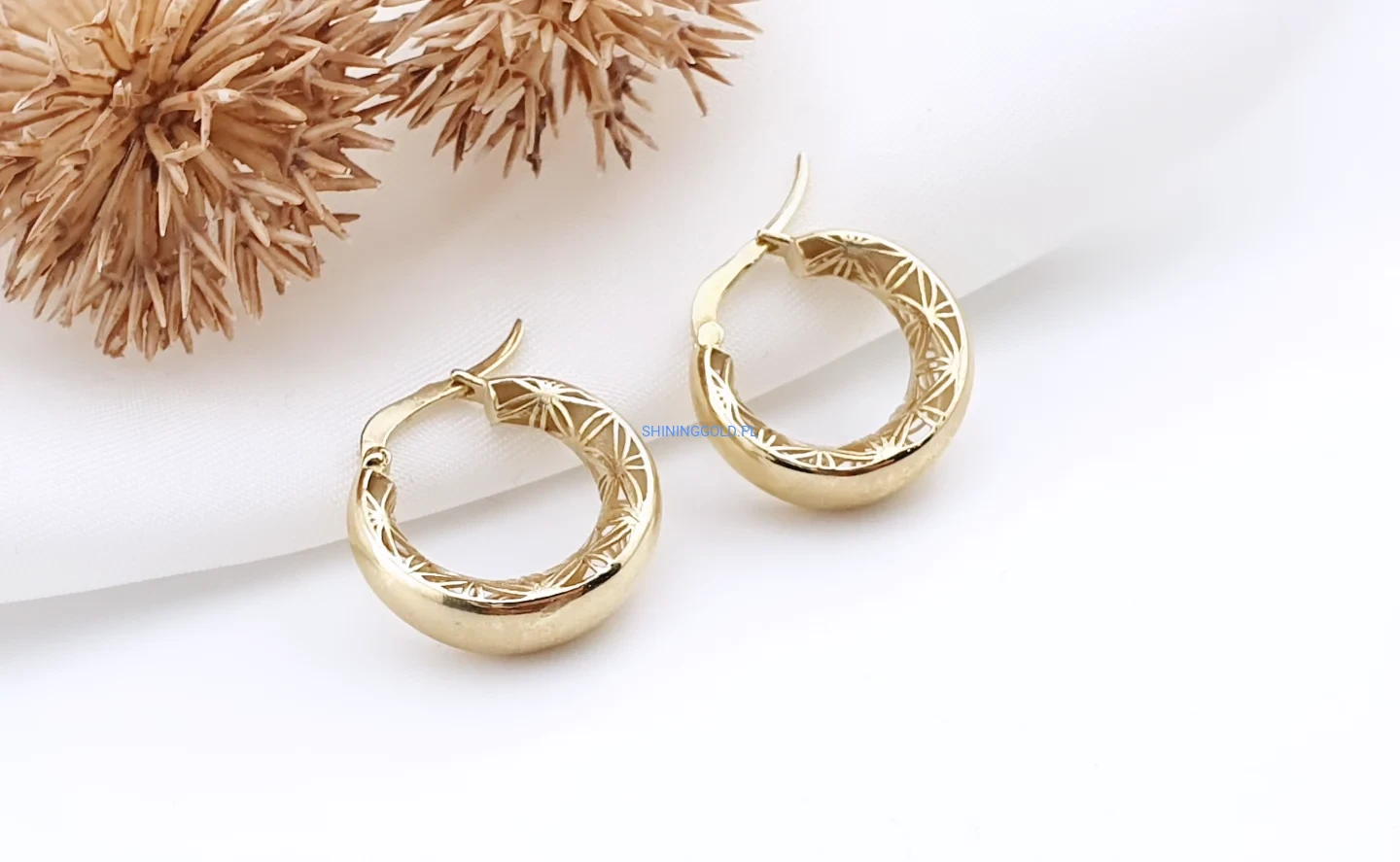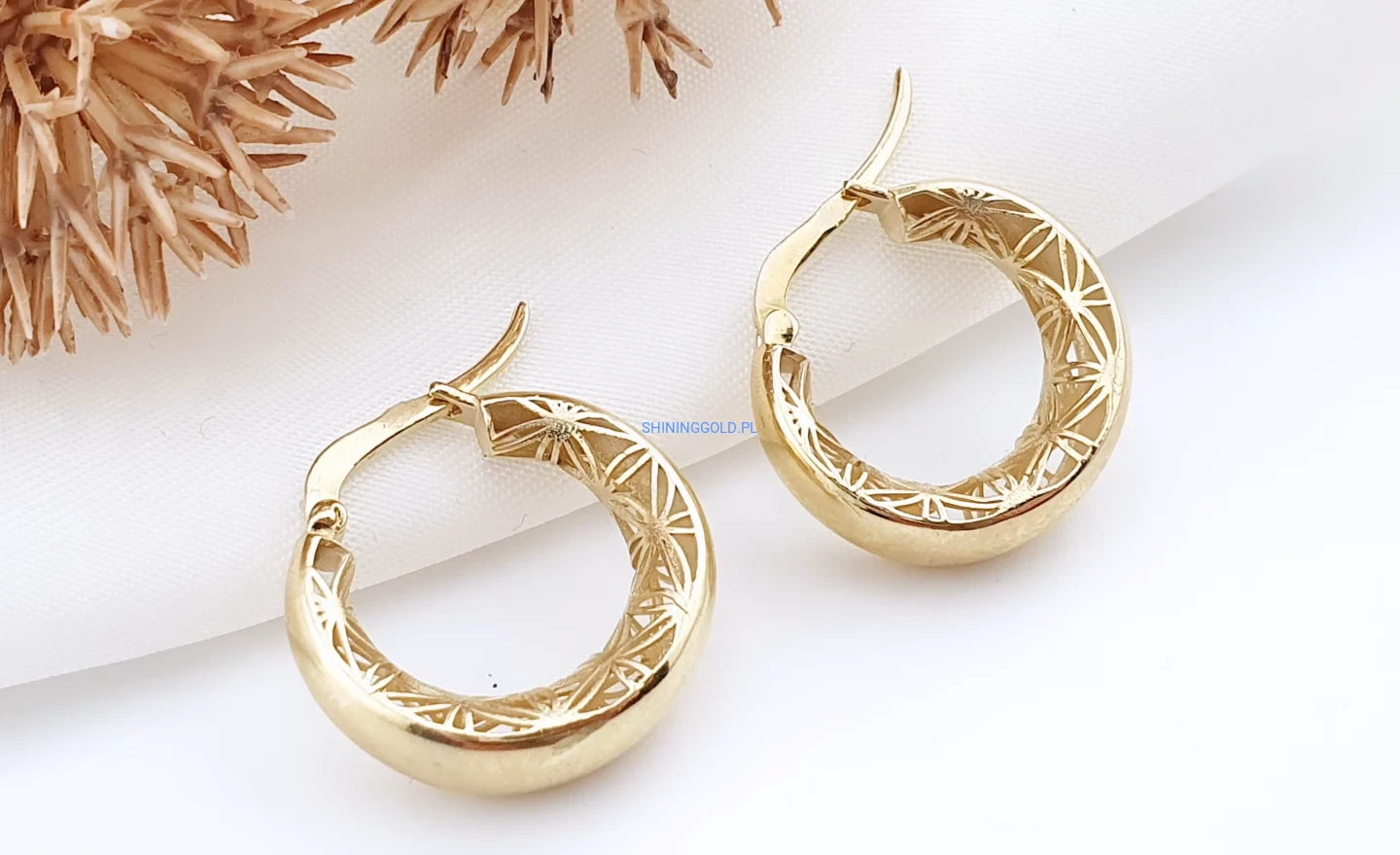 Złote kolczyki koła 375 to klasyka w najlepszym wydaniu. Wykonane z żółtego złota próby 375, wyróżniają się subtelnym grawerem o geometrycznym wzorze, który pięknie odbija światło. Ich ponadczasowy kształt i lekkość sprawiają, że doskonale pasują zarówno do codziennych stylizacji, jak i eleganckich okazji.