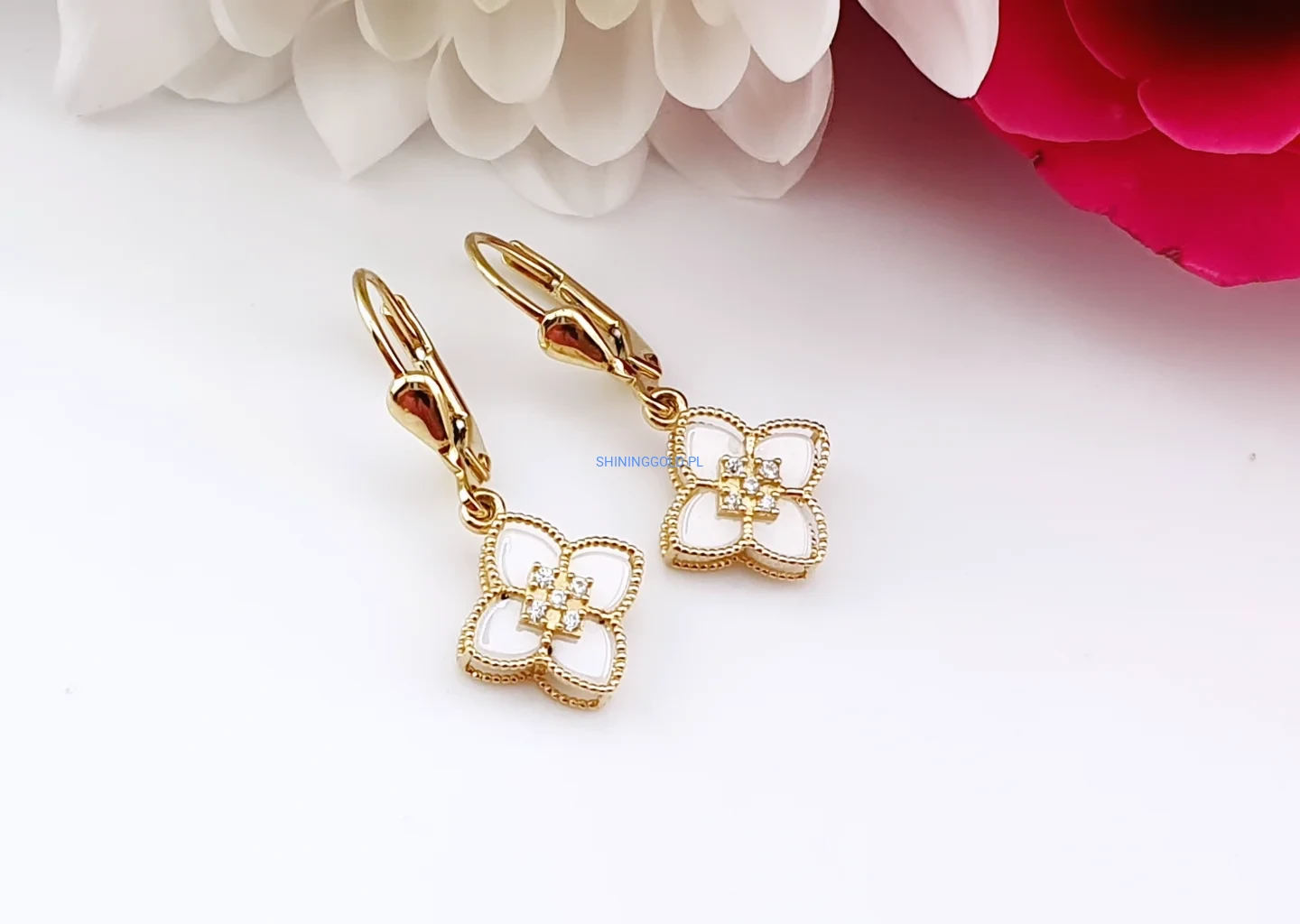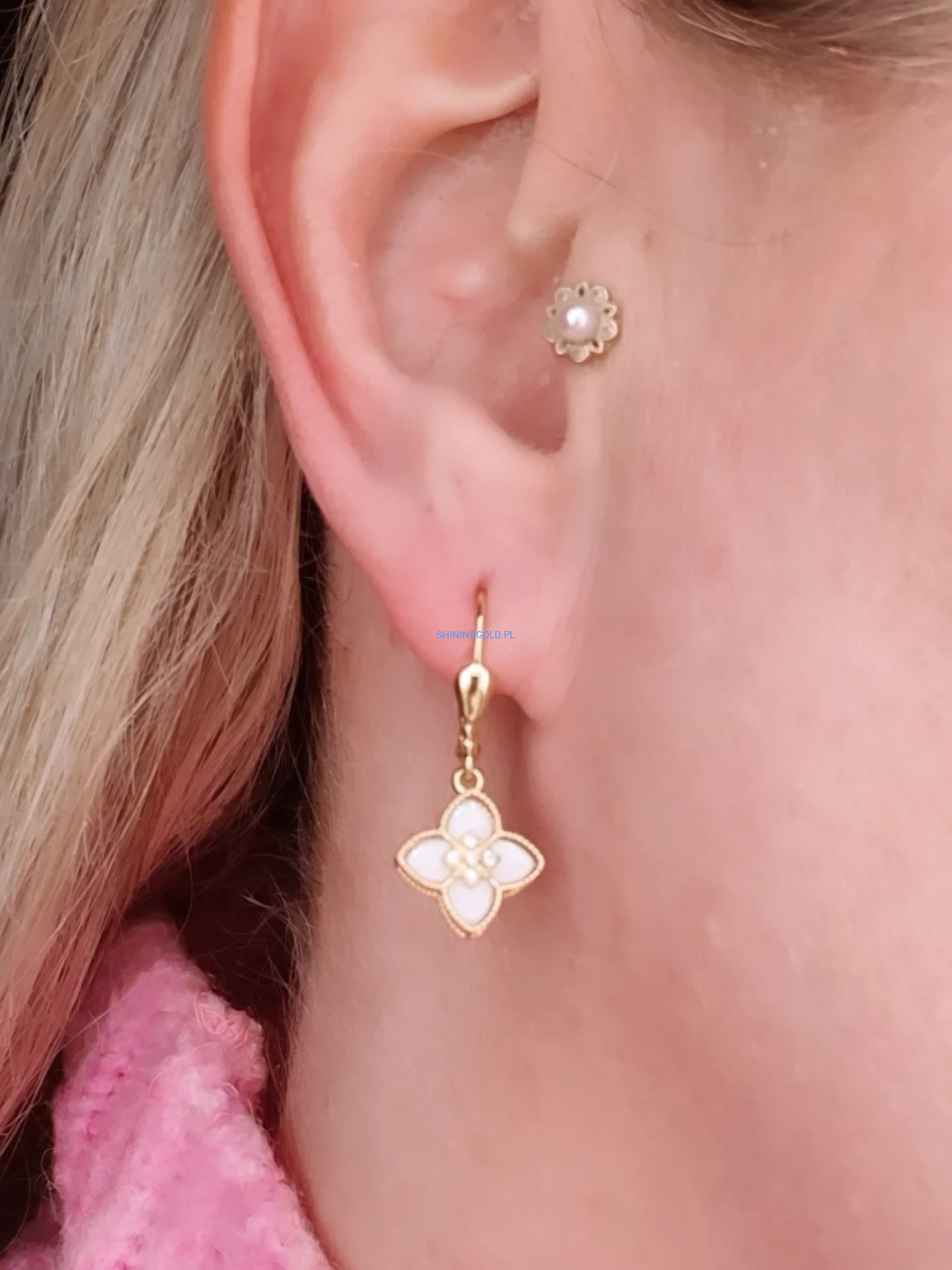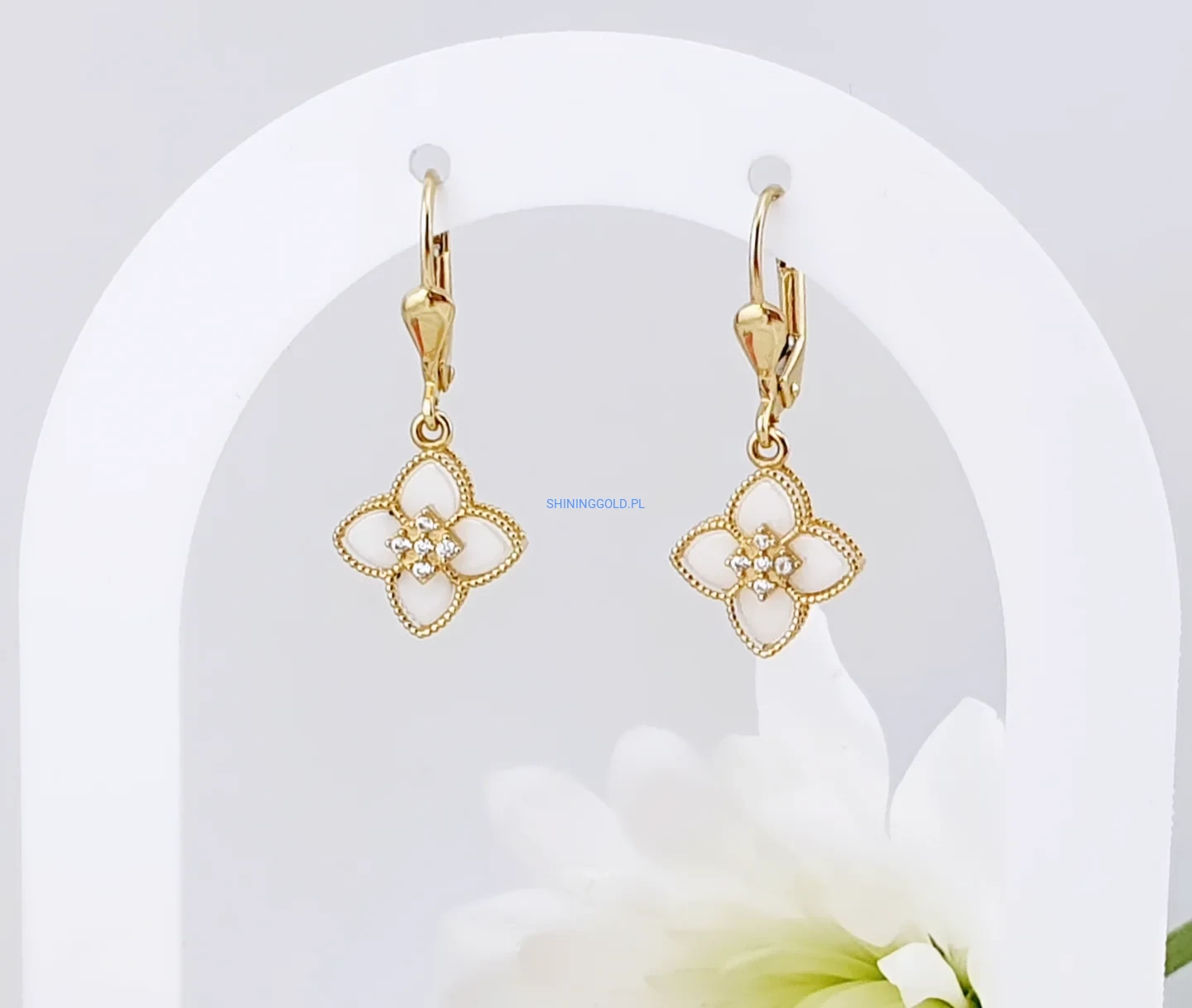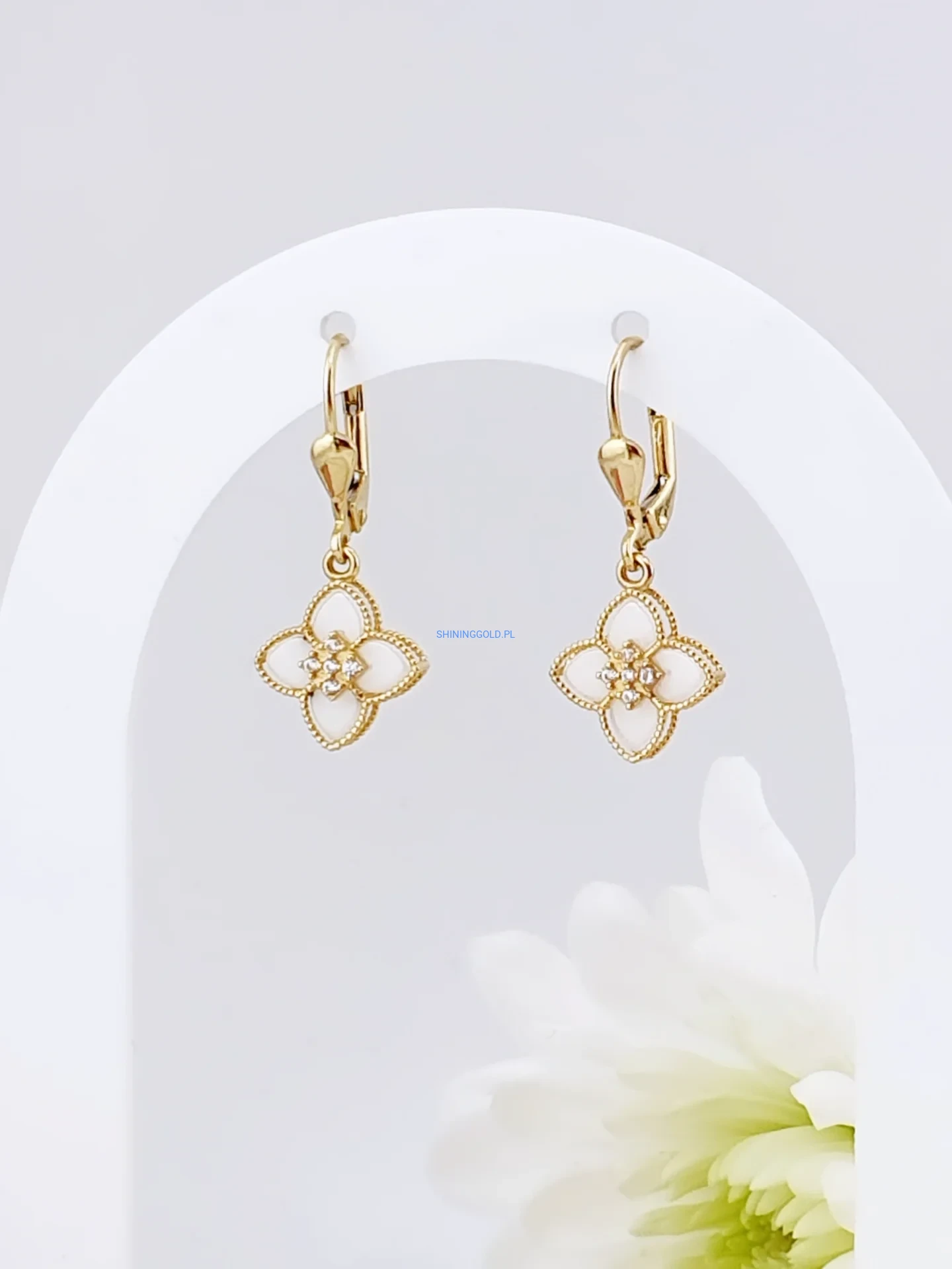 Eleganckie kolczyki wykonane ze złota próby 585 w kształcie kwiatów. Ażurowa forma w połączeniu z drobnymi zdobieniami w centralnej części nadaje im lekkości i subtelnego blasku.