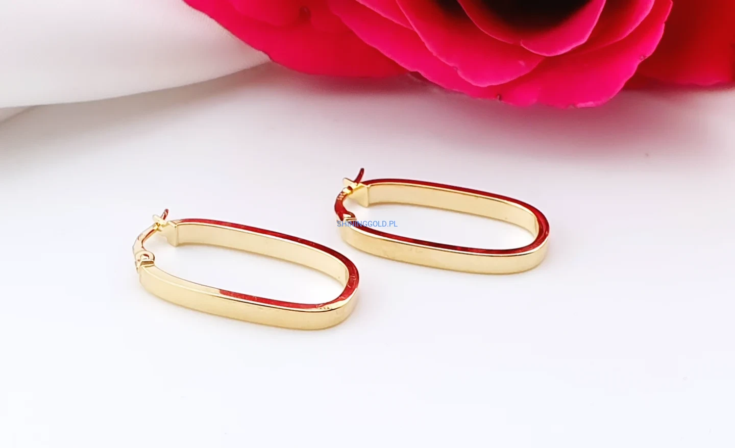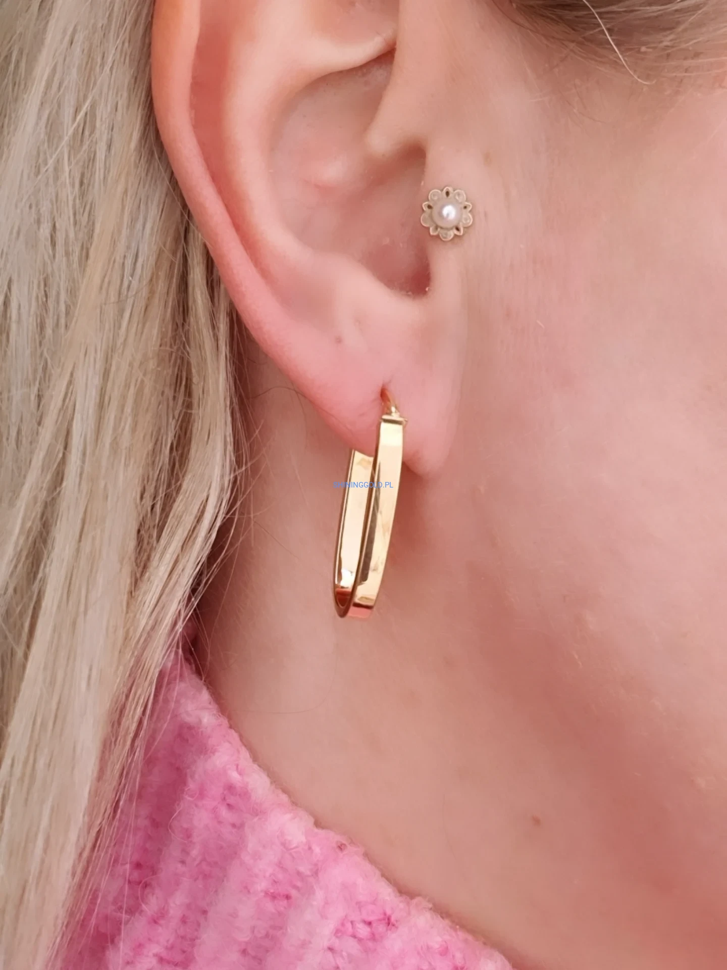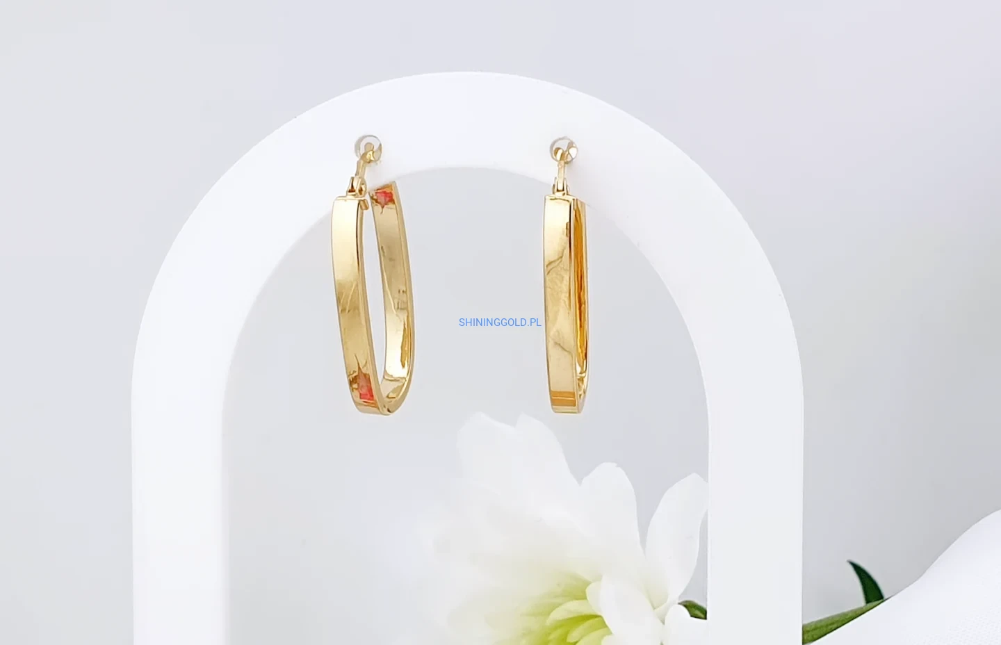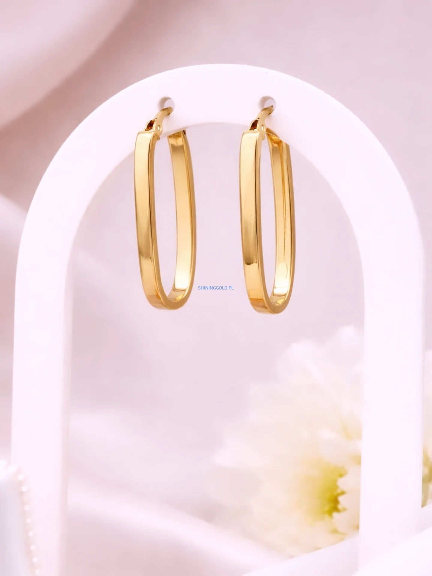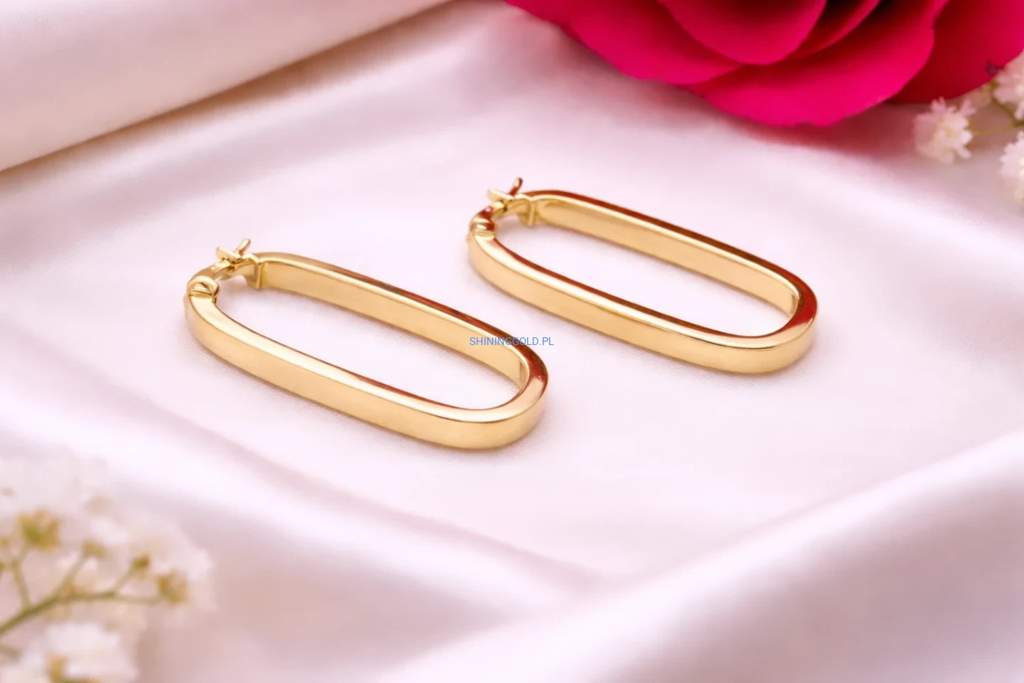 Stylowe kolczyki ze złota próby 585 w nowoczesnym, wydłużonym owalnym kształcie. Gładka, polerowana powierzchnia pięknie odbija światło, dzięki czemu kolczyki są subtelne, ale jednocześnie przyciągają uwagę.