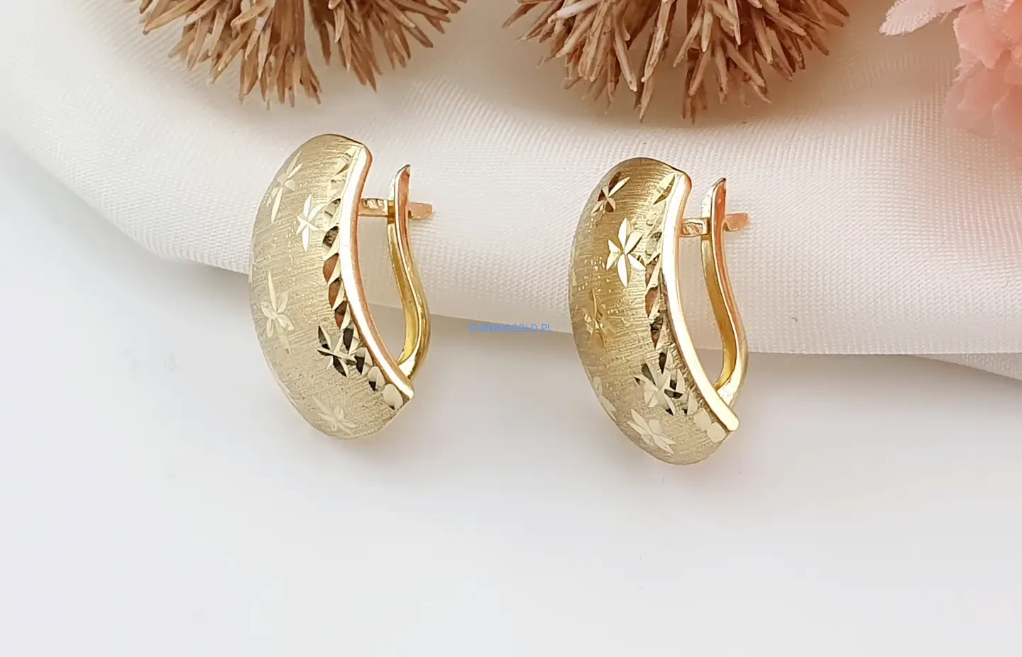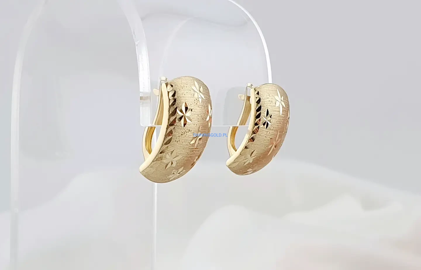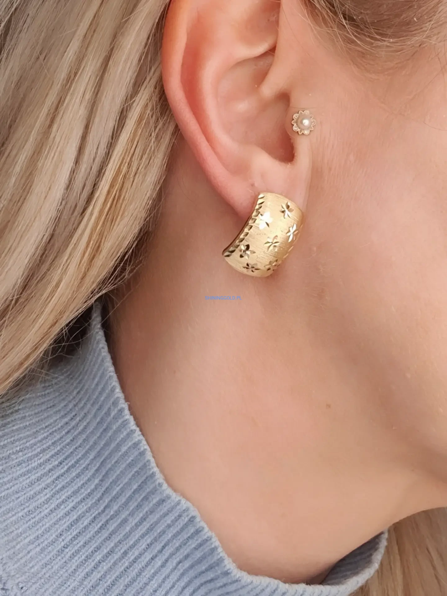 Stylowe, szerokie kolczyki z żółtego złota to połączenie elegancji i wyrazistego designu. Wykonane z wysokiej jakości złota próby 585, zachwycają subtelnym, matowym wykończeniem i efektownym grawerem w kształcie gwiazdek. Idealne dla kobiet, które lubią błysk w wyjątkowym wydaniu.
