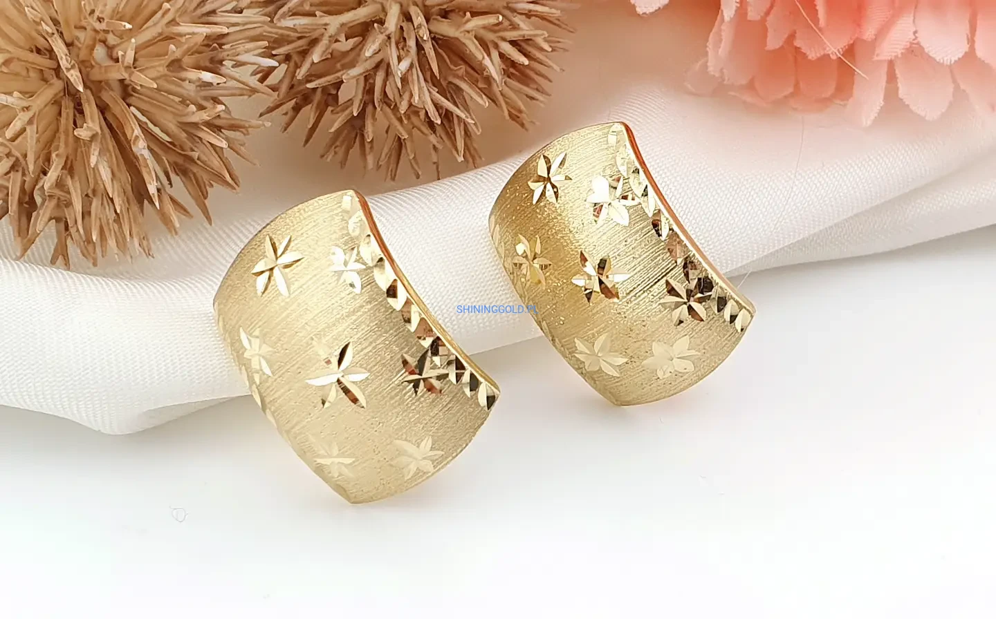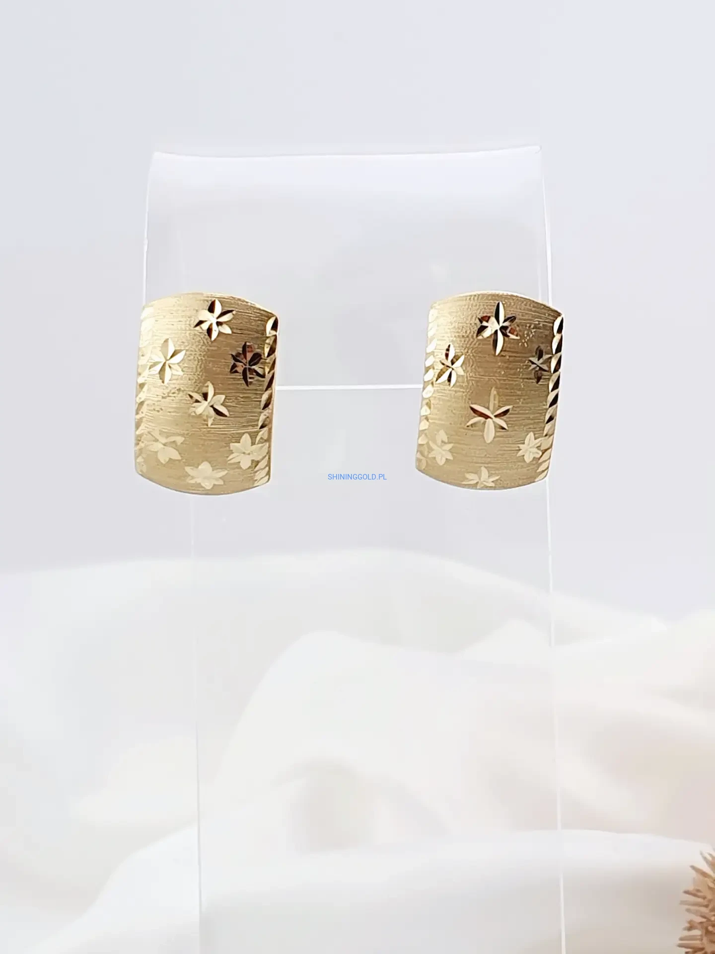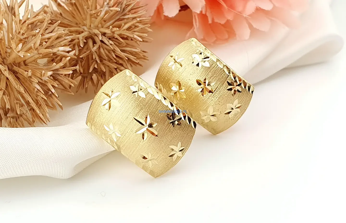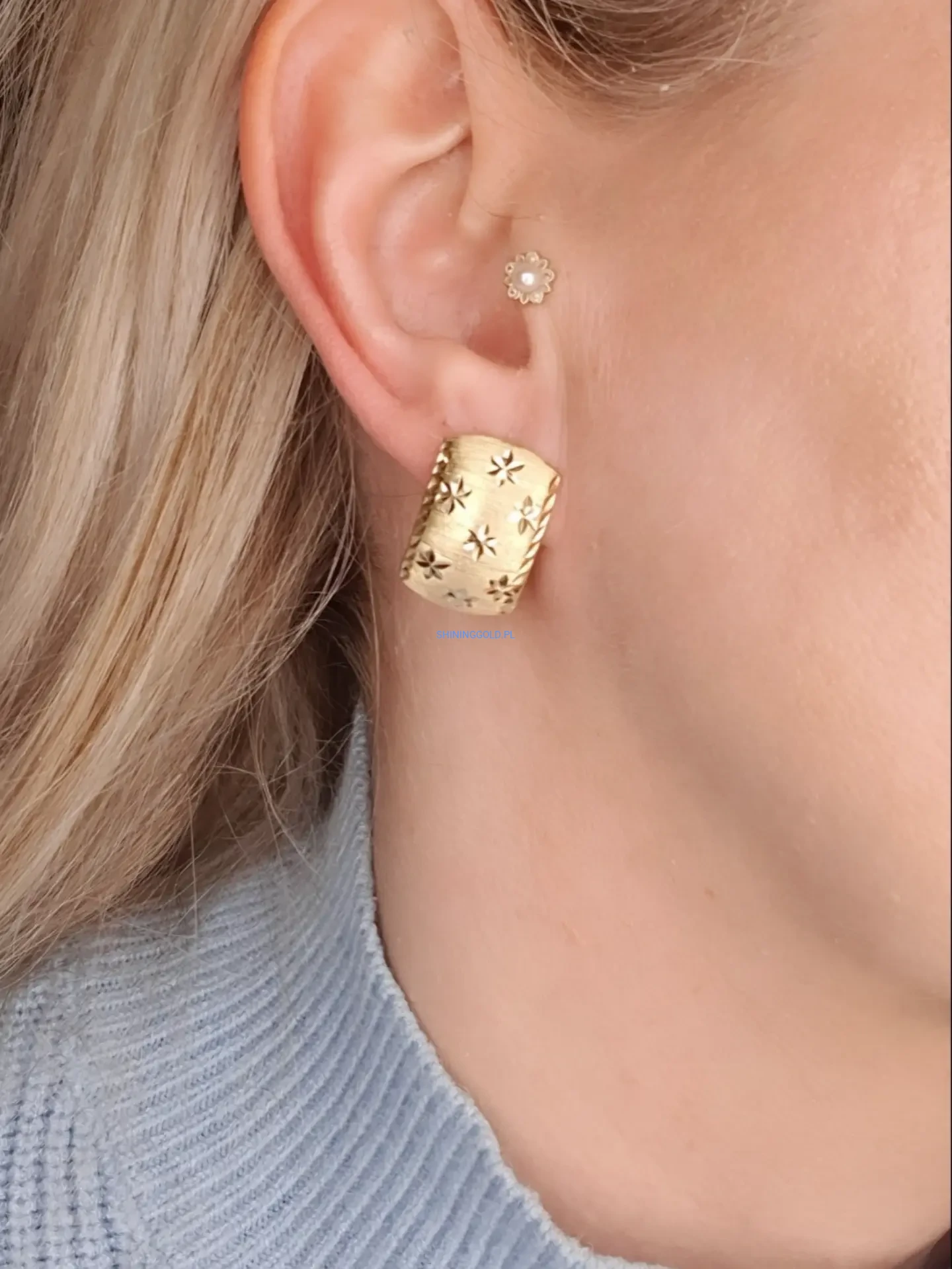 Stylowe, szerokie kolczyki z żółtego złota to połączenie elegancji i wyrazistego designu. Wykonane z wysokiej jakości złota próby 585, zachwycają subtelnym, matowym wykończeniem i efektownym grawerem w kształcie gwiazdek. Idealne dla kobiet, które lubią błysk w wyjątkowym wydaniu.