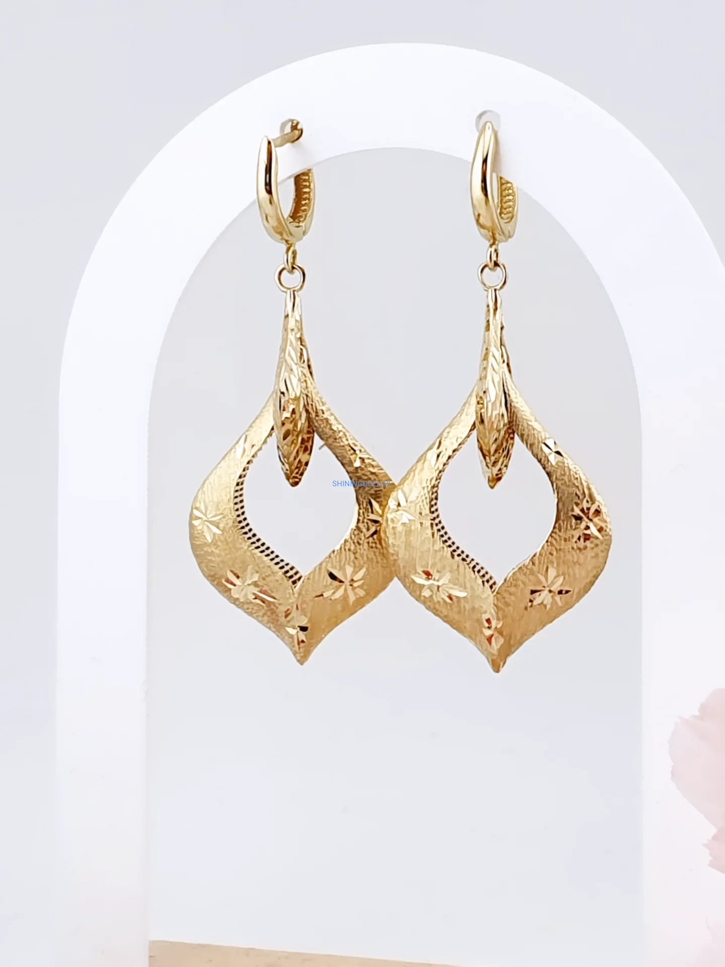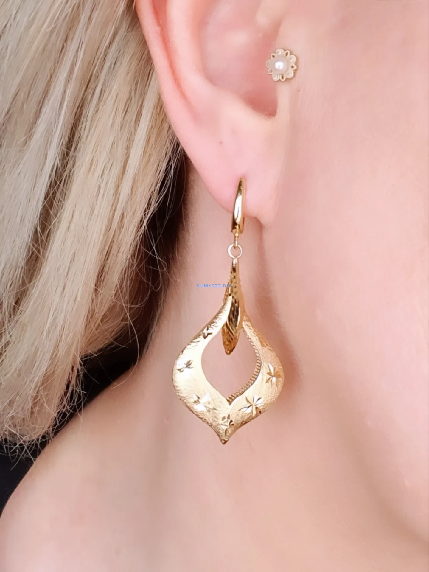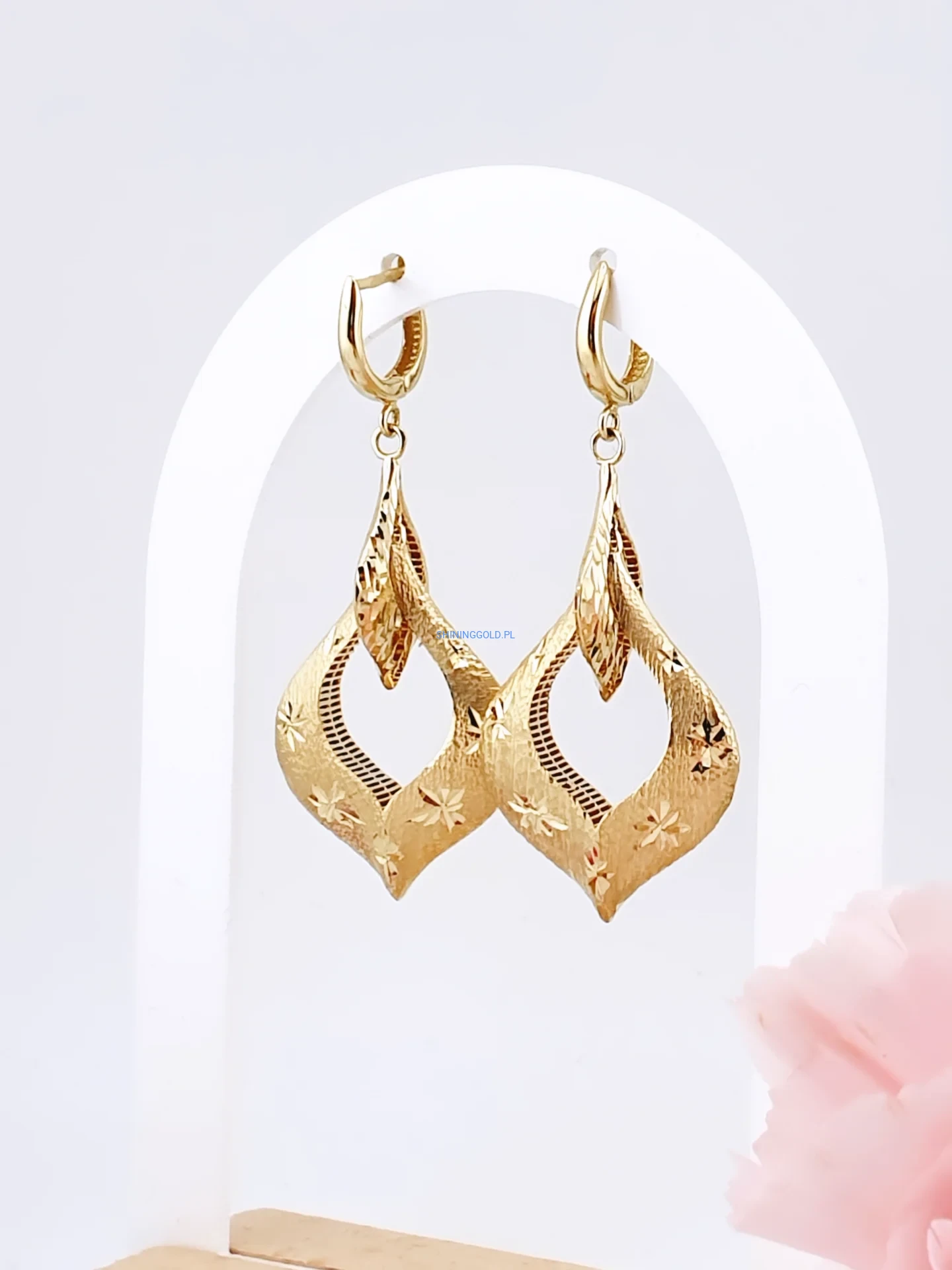 Stylowe kolczyki wykonane ze złota próby 585, o pięknej, ażurowej formie z delikatnymi zdobieniami. Subtelna faktura i lekko matowe wykończenie nadają im wyjątkowego charakteru, a wydłużony kształt pięknie podkreśla szyję.