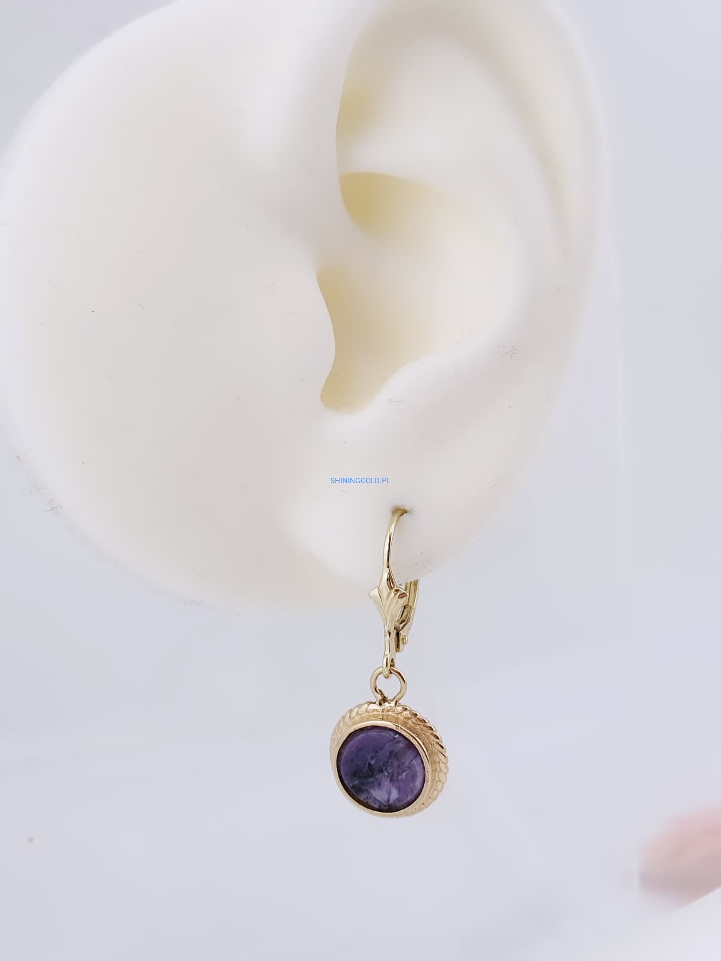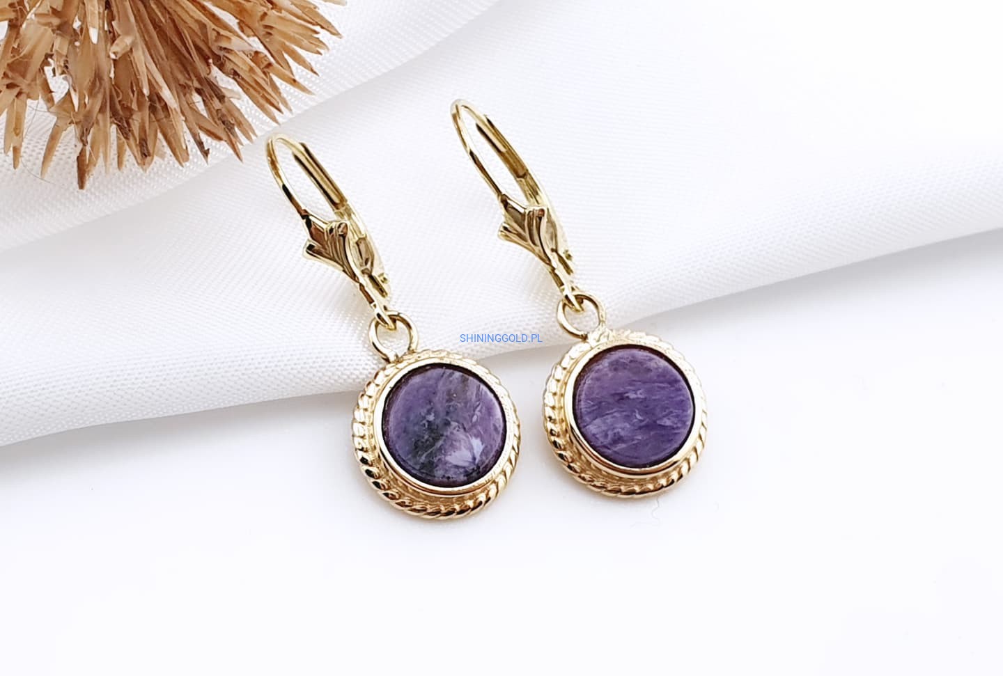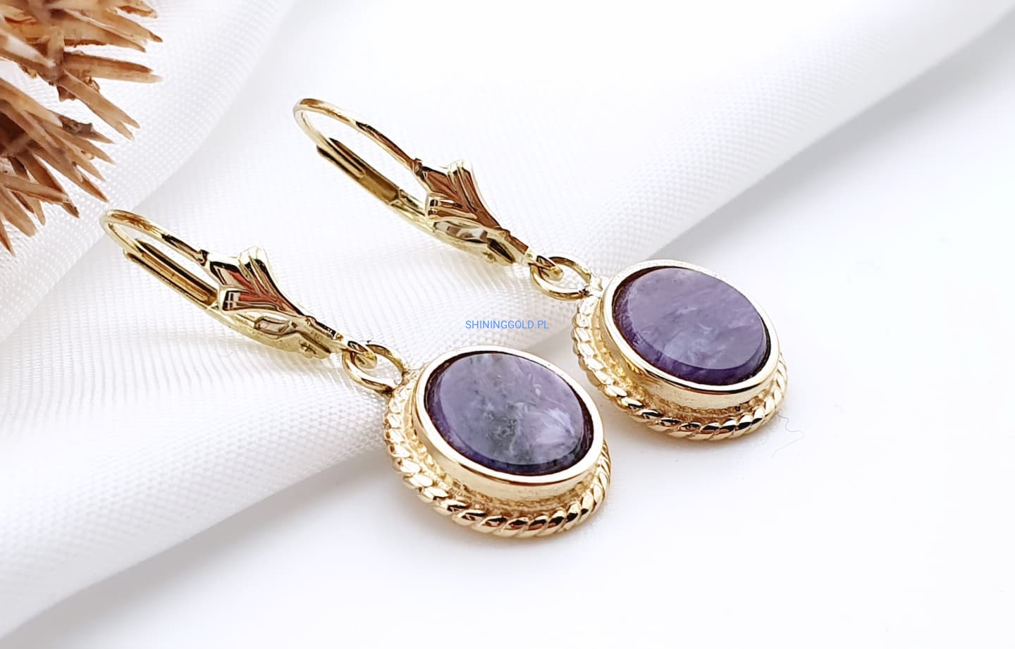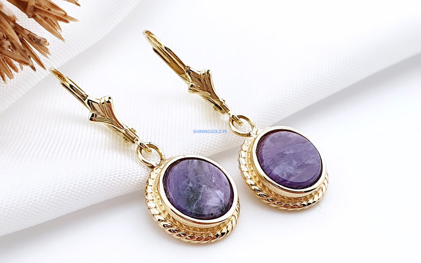 Złote kolczyki z czaroitem to niezwykle elegancka i unikatowa biżuteria, która zachwyca swoją niepowtarzalną barwą. Fioletowe odcienie kamienia z subtelnymi refleksami pięknie komponują się z ciepłym blaskiem złota próby 585, tworząc wyrafinowaną całość. To dodatek, który podkreśli indywidualny styl i doda szyku zarówno na co dzień, jak i podczas wyjątkowych okazji.