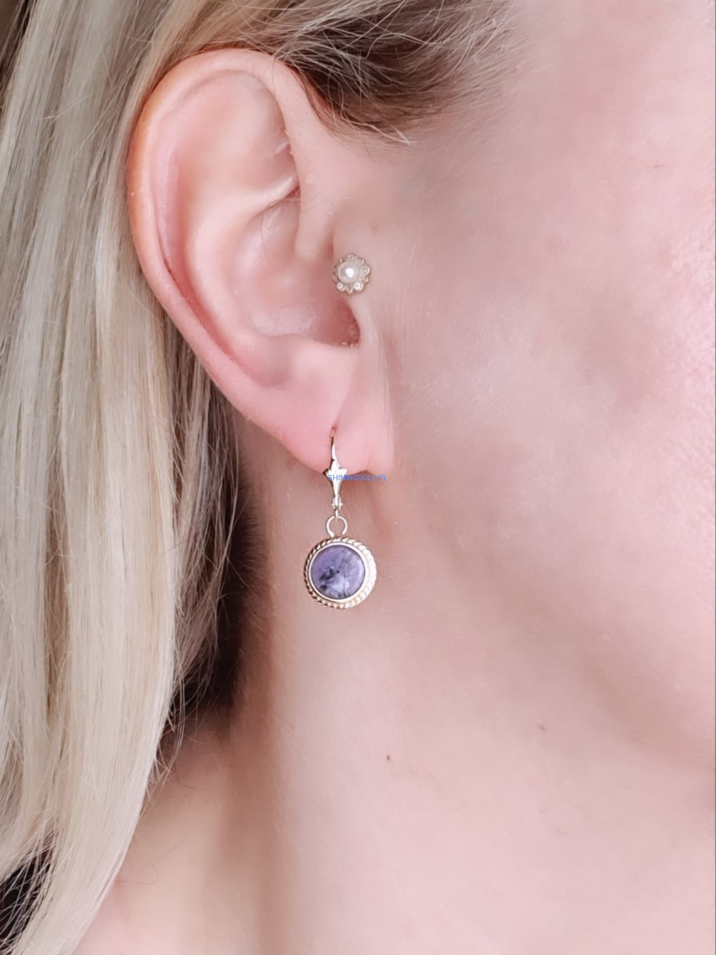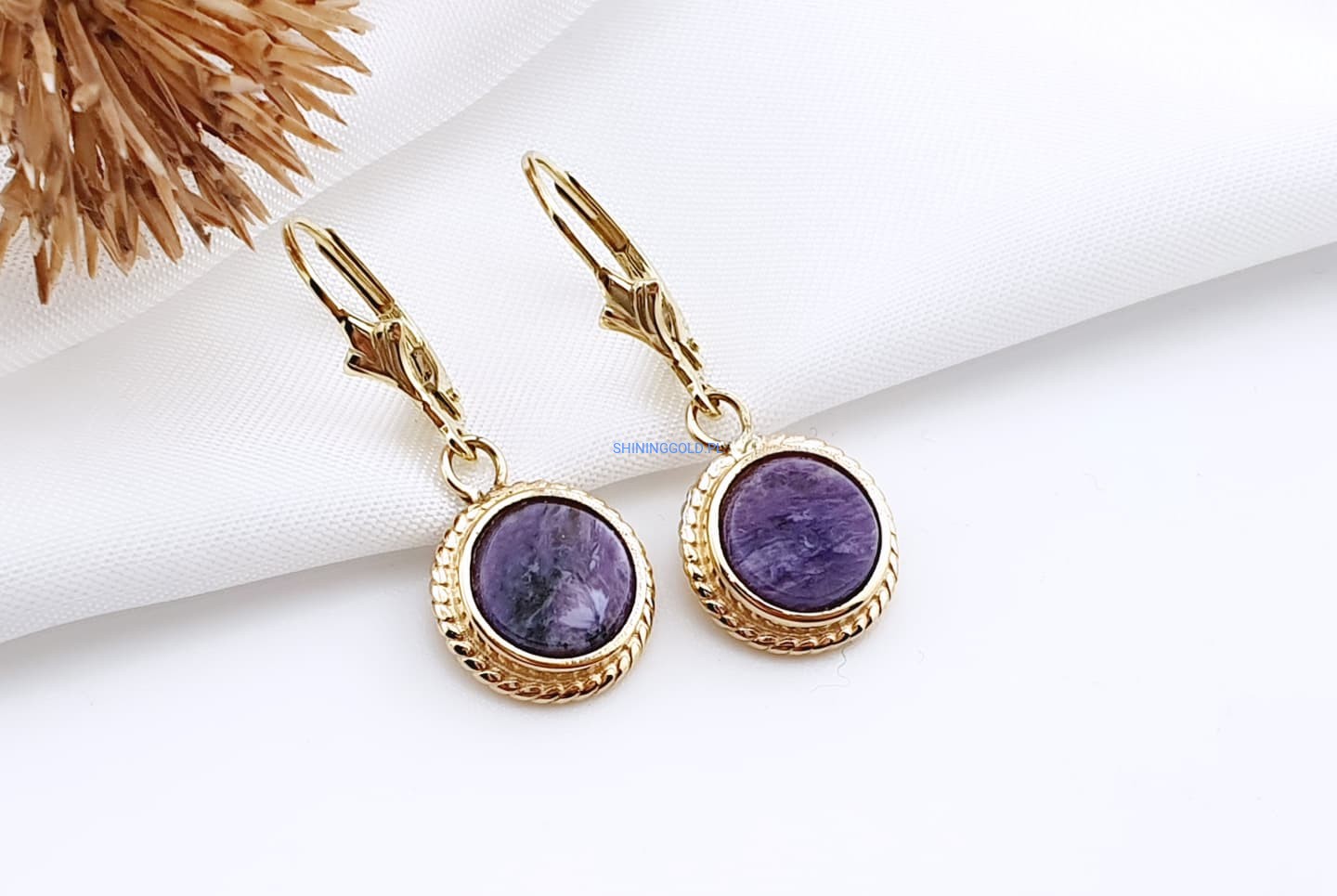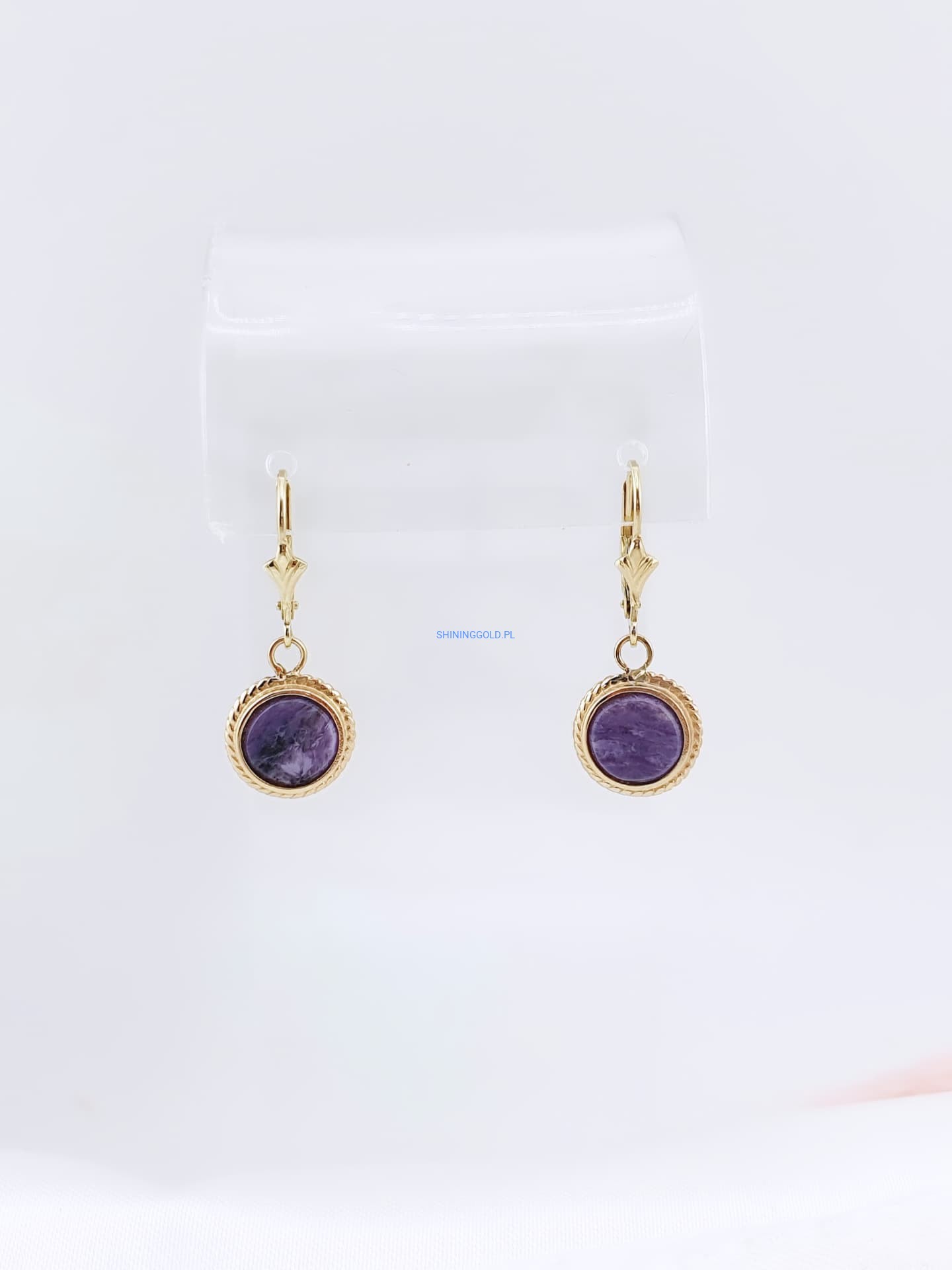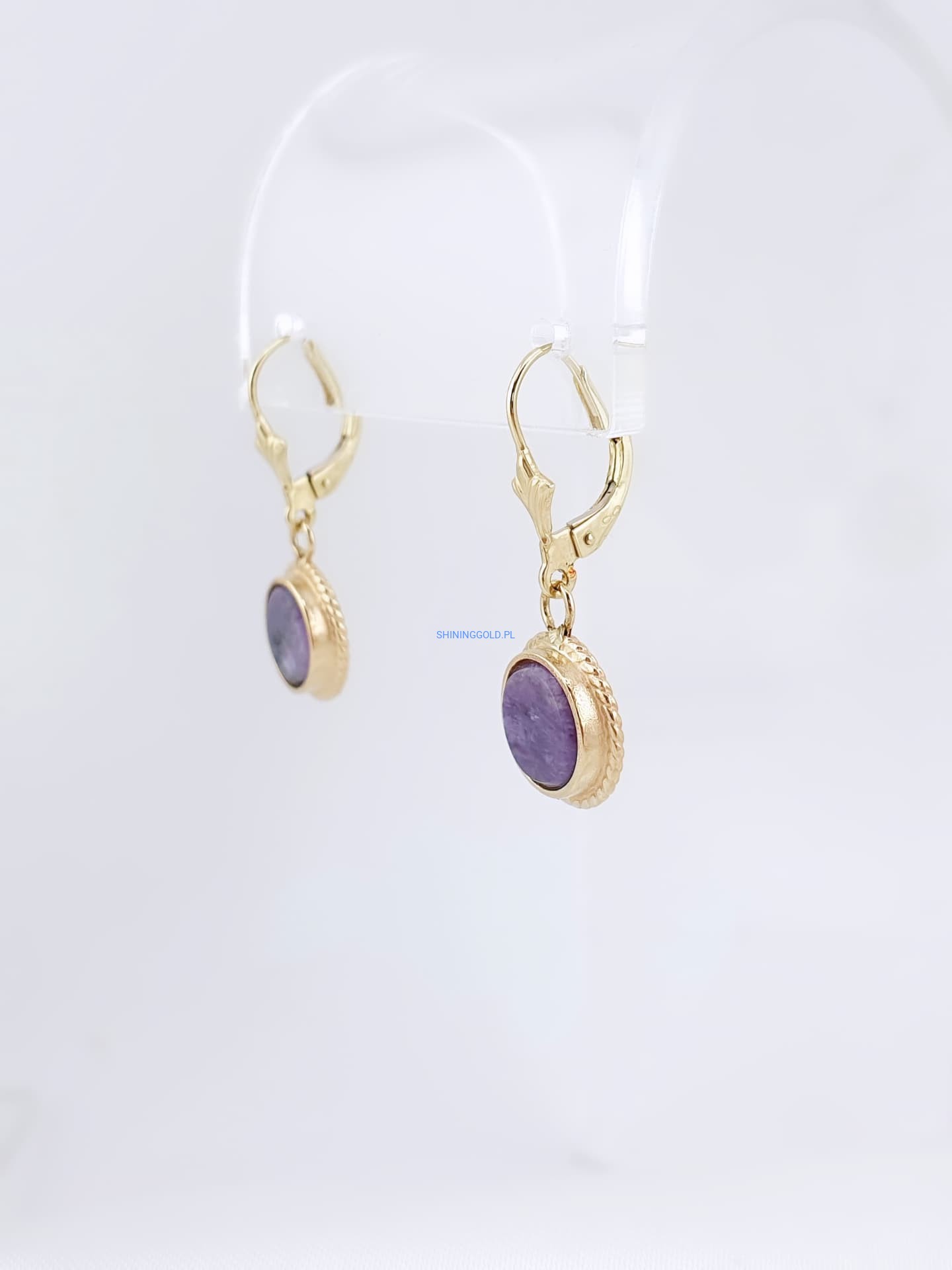 Złote kolczyki z czaroitem to niezwykle elegancka i unikatowa biżuteria, która zachwyca swoją niepowtarzalną barwą. Fioletowe odcienie kamienia z subtelnymi refleksami pięknie komponują się z ciepłym blaskiem złota próby 585, tworząc wyrafinowaną całość. To dodatek, który podkreśli indywidualny styl i doda szyku zarówno na co dzień, jak i podczas wyjątkowych okazji.