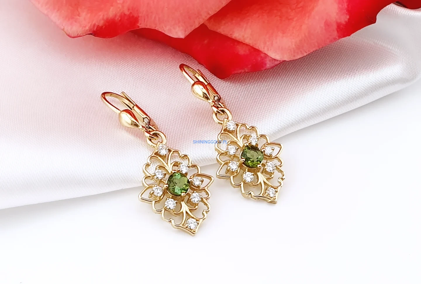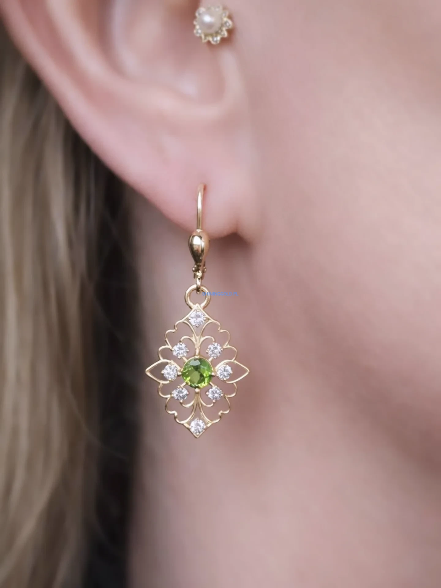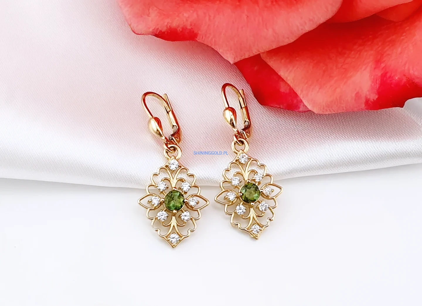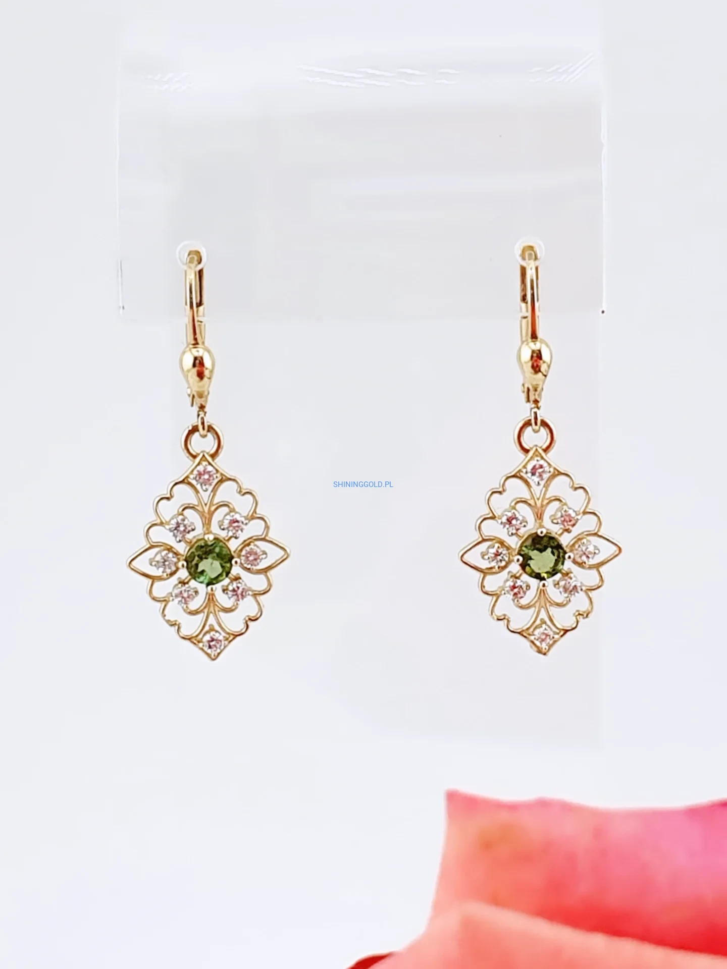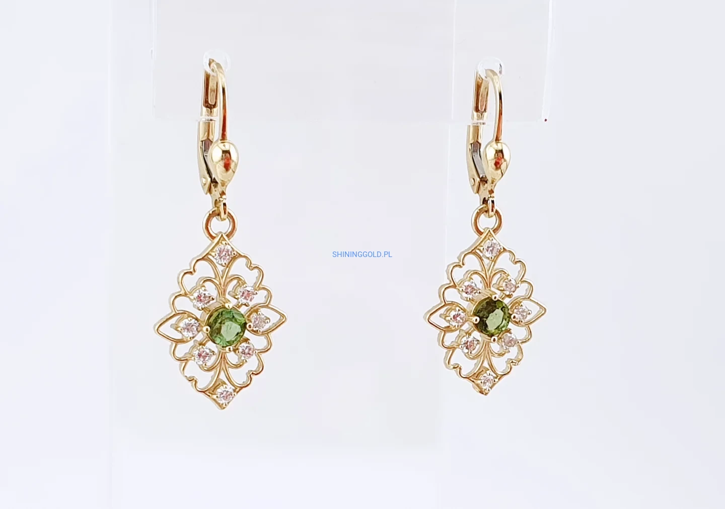 Wyjątkowe kolczyki wykonane ze złota próby 585, zachwycające finezyjnym, ażurowym wzorem inspirowanym motywem kwiatowym. Centralne miejsce zajmują naturalne zielone turmaliny, których barwa pięknie kontrastuje z blaskiem diamentów osadzonych wokół.