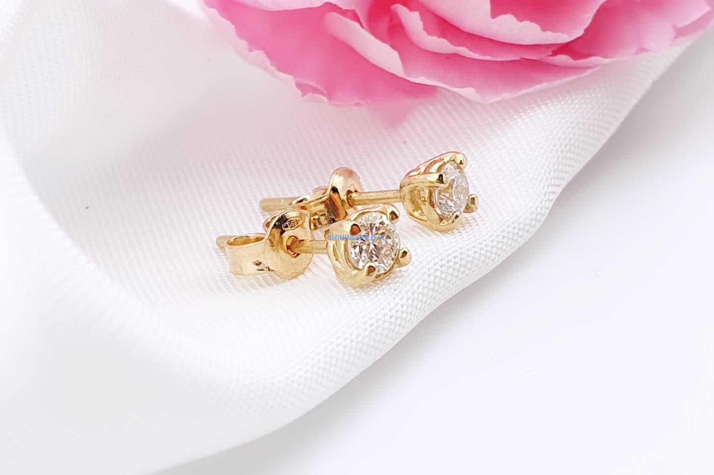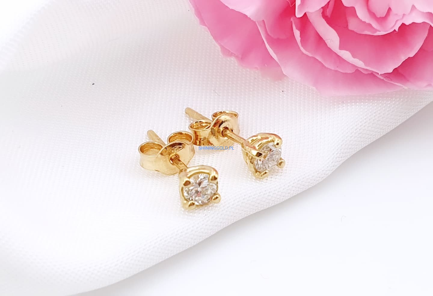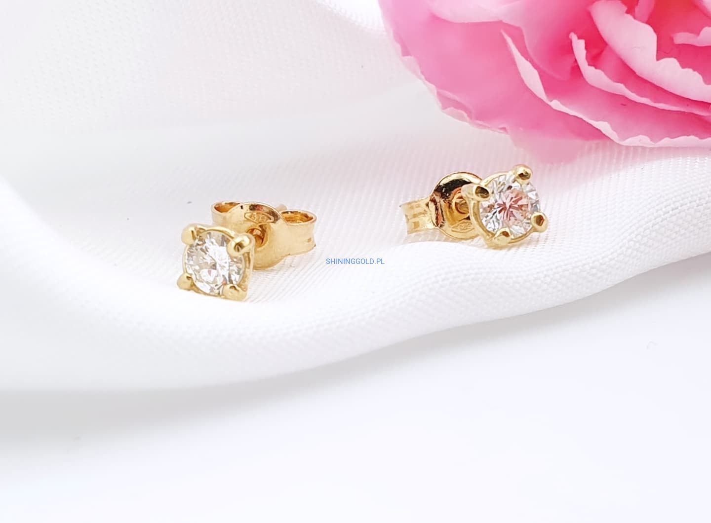 Klasyczne złote kolczyki sztyfty z naturalnymi diamentami – ponadczasowa biżuteria, która pasuje na każdą okazję. Wykonane ze złota próby 585, zdobione dwoma diamentami o łącznej masie 0,28 ct (czystość SI1-2, barwa H).