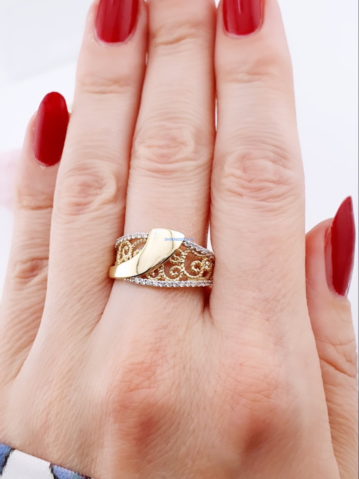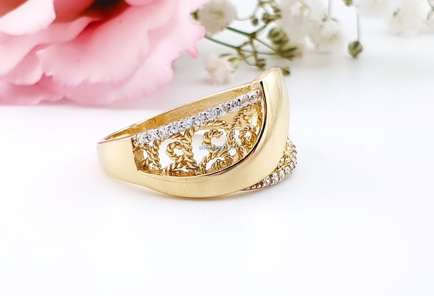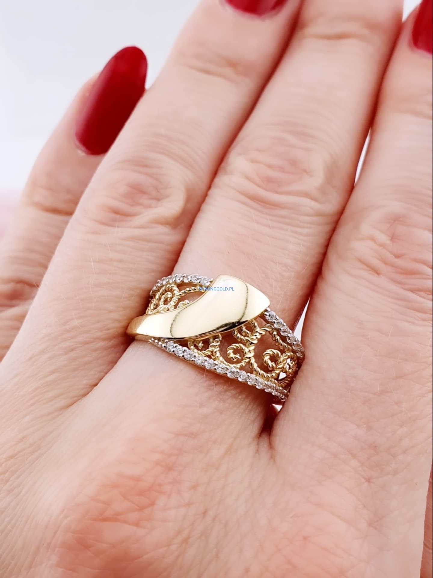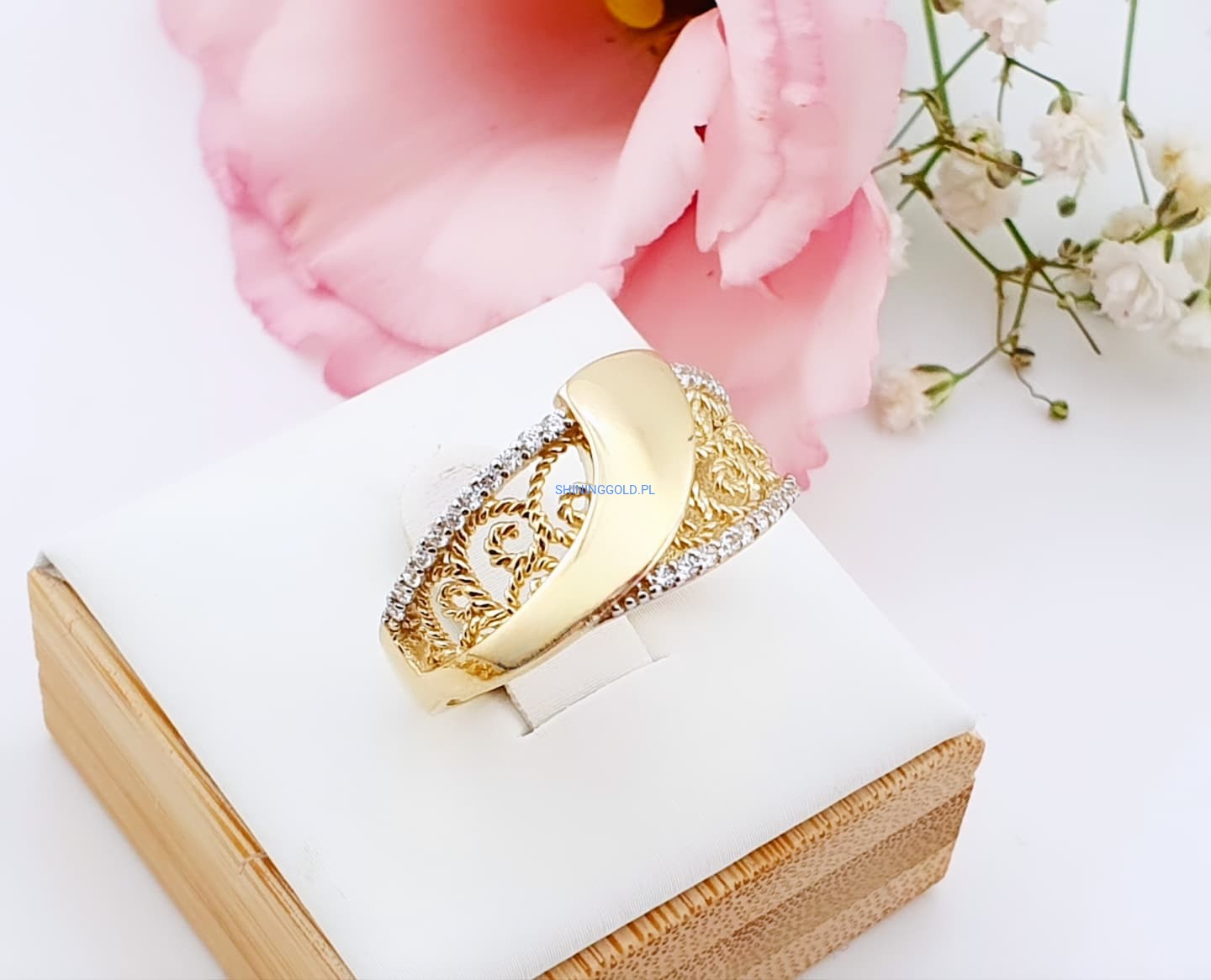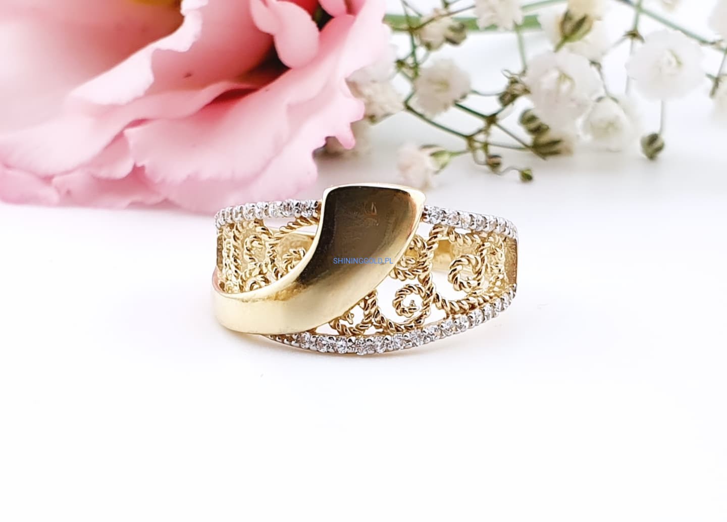 Złoty, nowy ażurowy pierścionek z cyrkoniami (052.P)