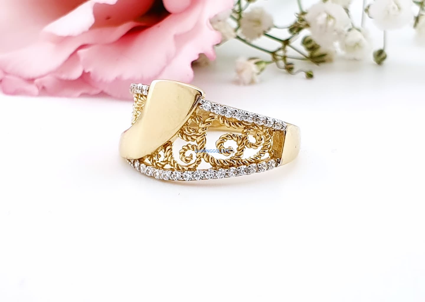 Wyjątkowy pierścionek z ażurowym wzorem, wykonany z żółtego złota próby 585. Ozdobiony iskrzącymi cyrkoniami, które pięknie odbijają światło, dodając mu elegancji i lekkości. Ażurowa forma sprawia, że pierścionek jest efektowny, ale nie przytłaczający – idealny zarówno na co dzień, jak i na specjalne okazje.