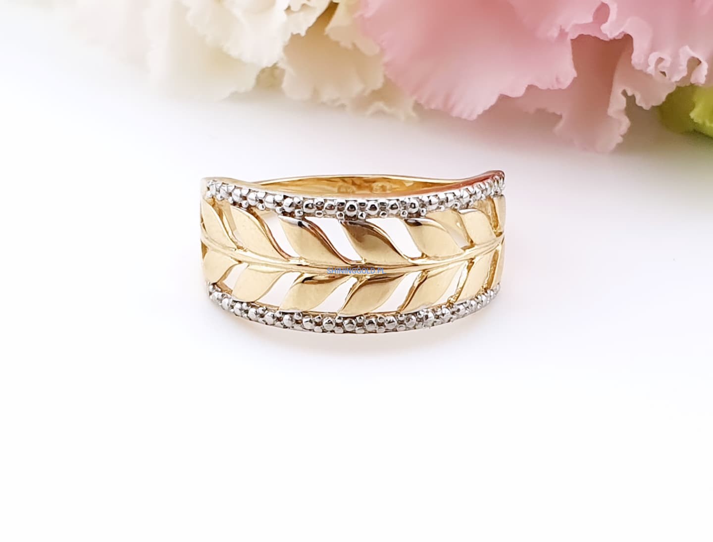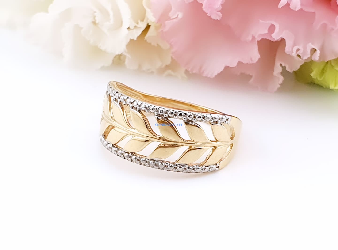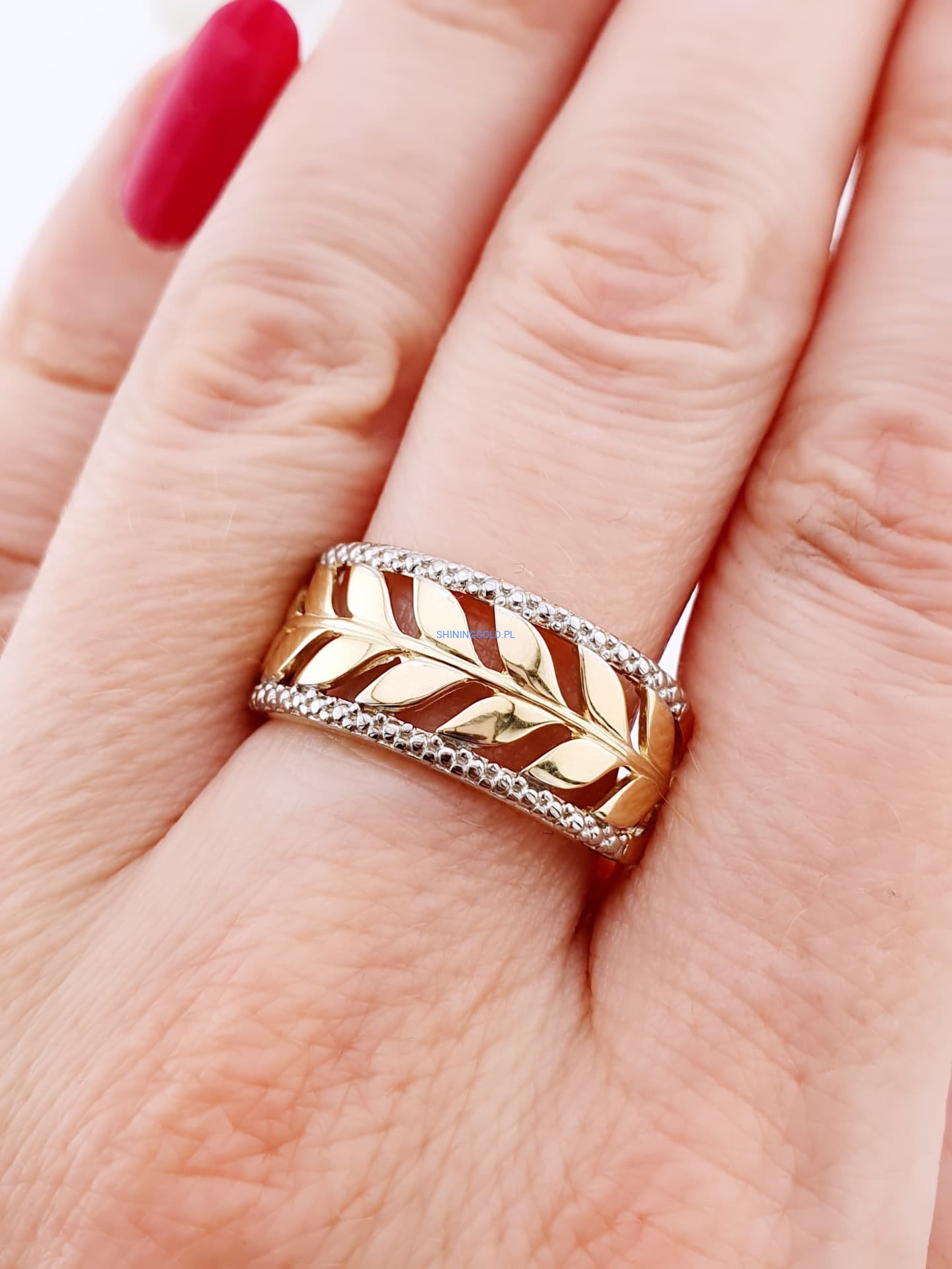 Złoty, nowy pierścionek „Liście” (058.ws)