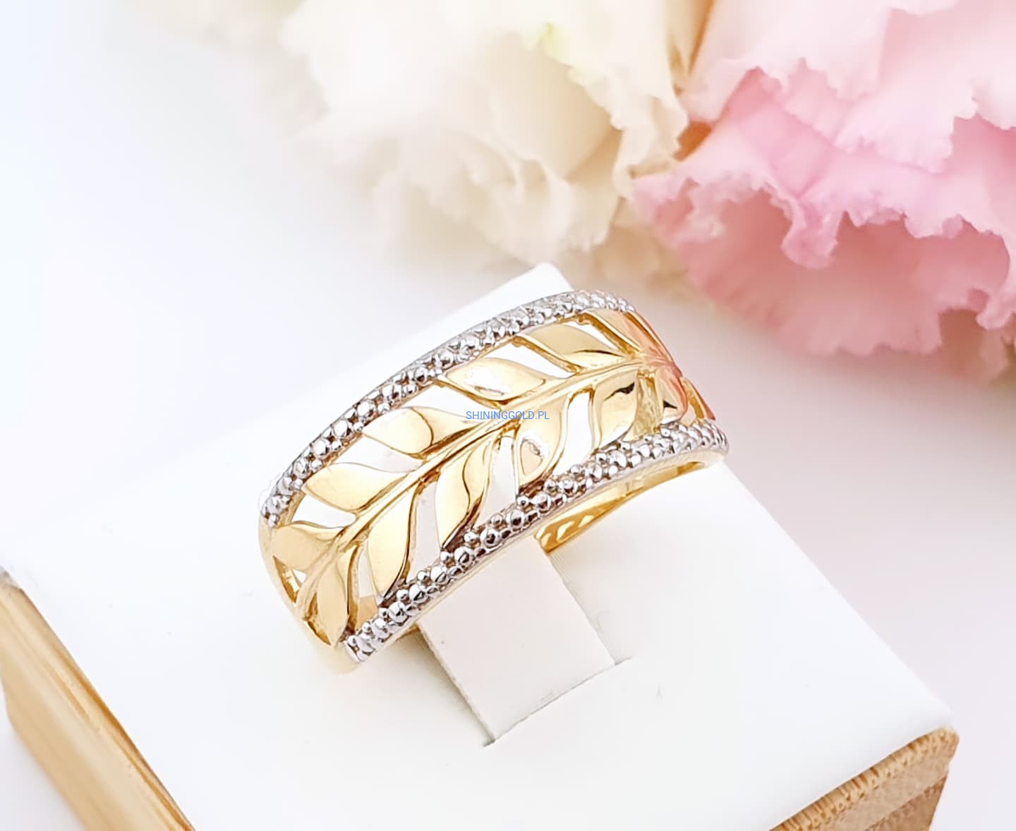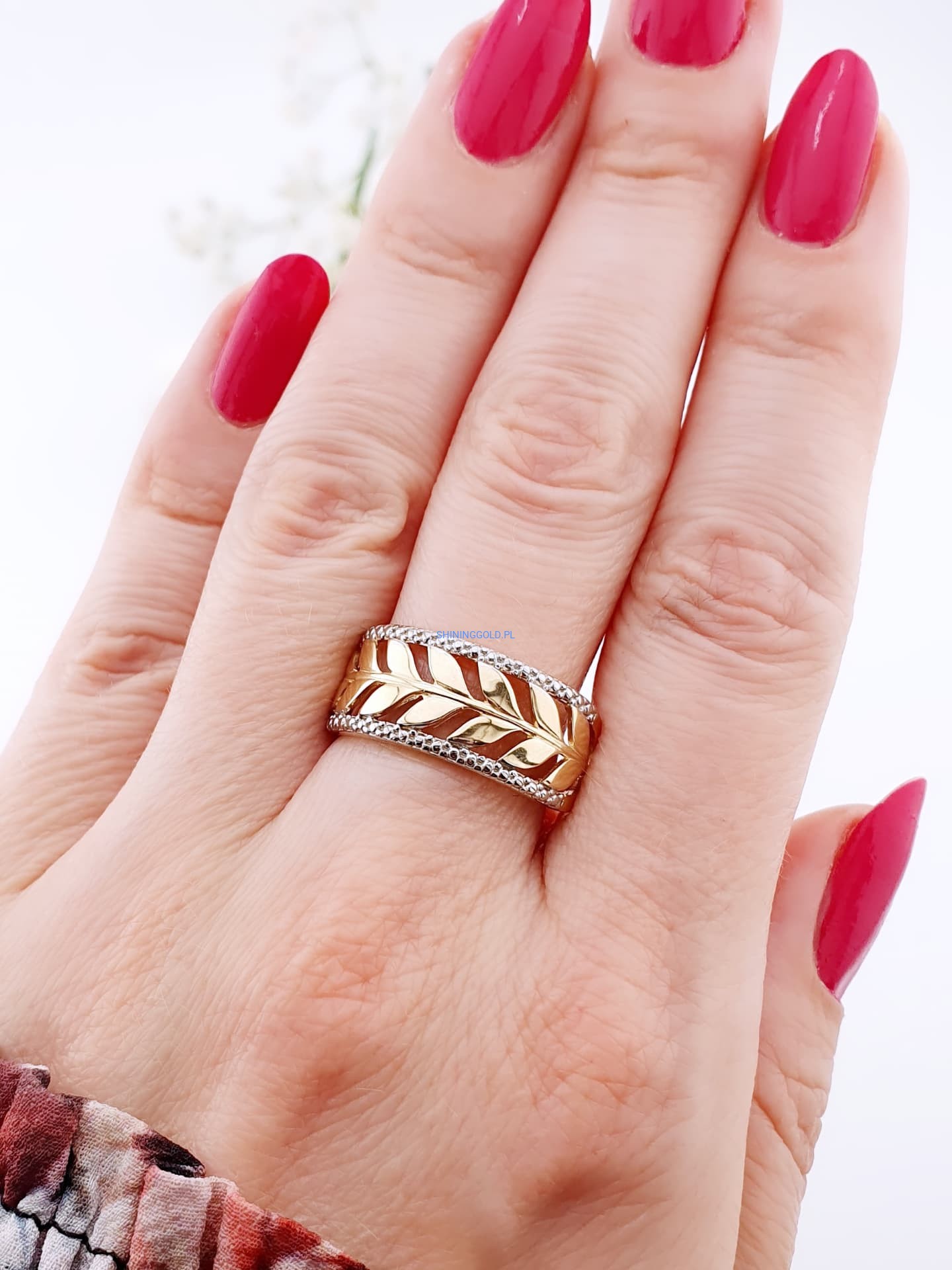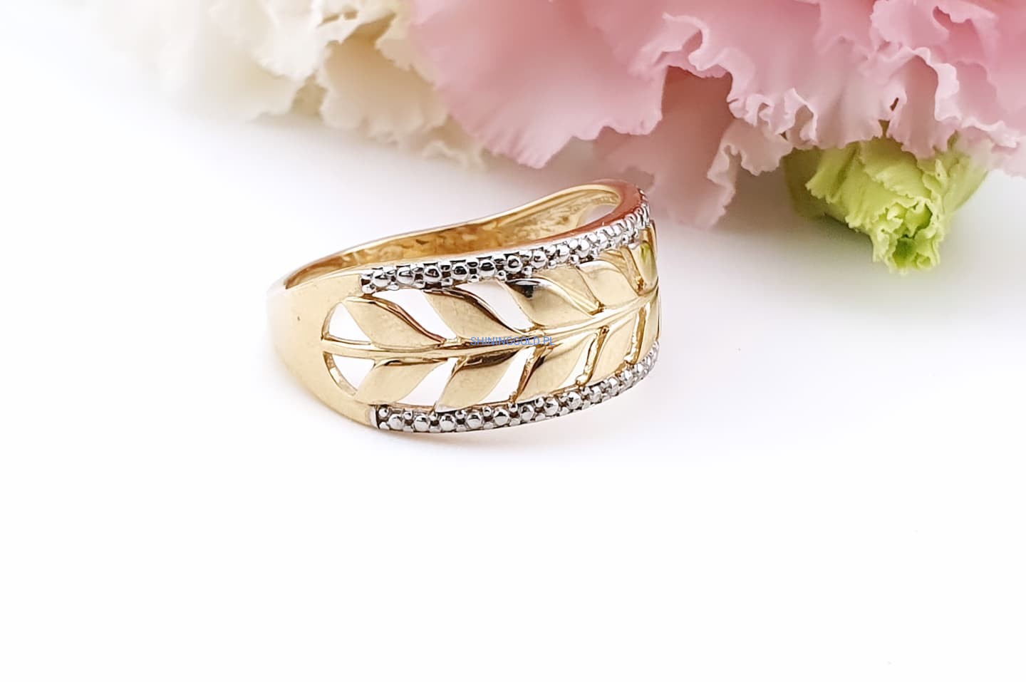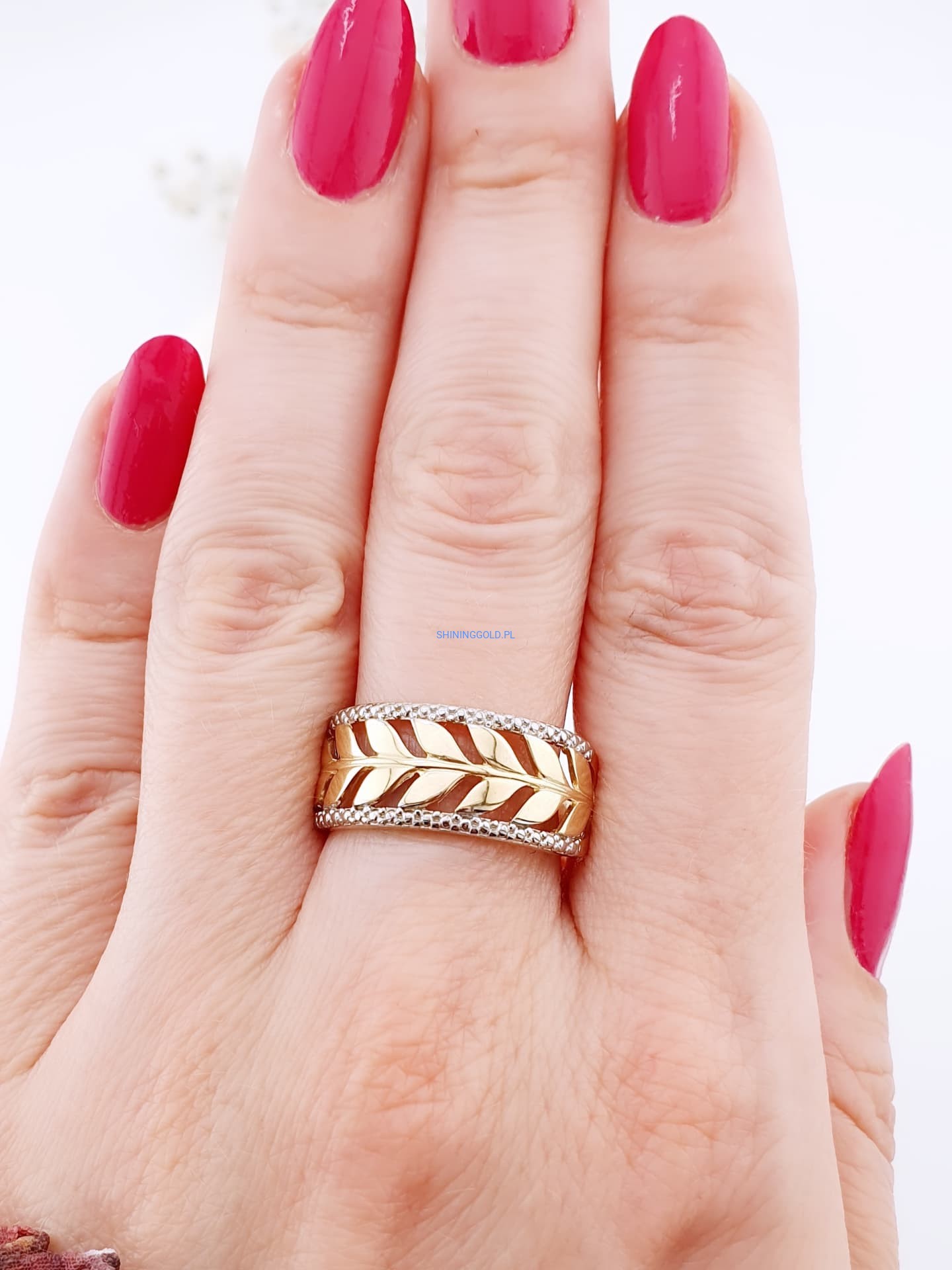 Złoty, nowy pierścionek „Liście” (058.ws)