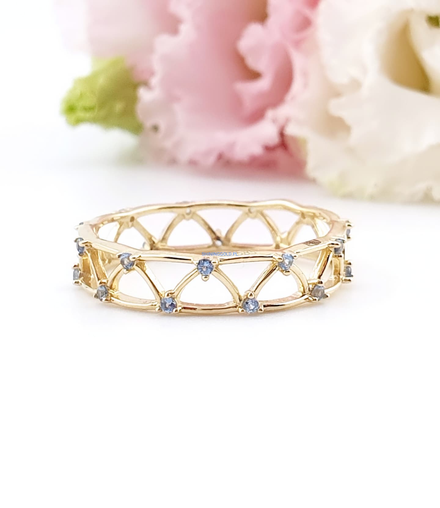 Ażurowy motyw sprawia, że pierścionek wygląda lekko i romantycznie, a jednocześnie nowocześnie. Delikatne cyrkonie osadzone w złocie dodają mu subtelnego blasku, który pięknie odbija światło i przyciąga spojrzenia. Doskonale komponuje się zarówno z codziennymi stylizacjami, jak i eleganckimi zestawami na wyjątkowe okazje.