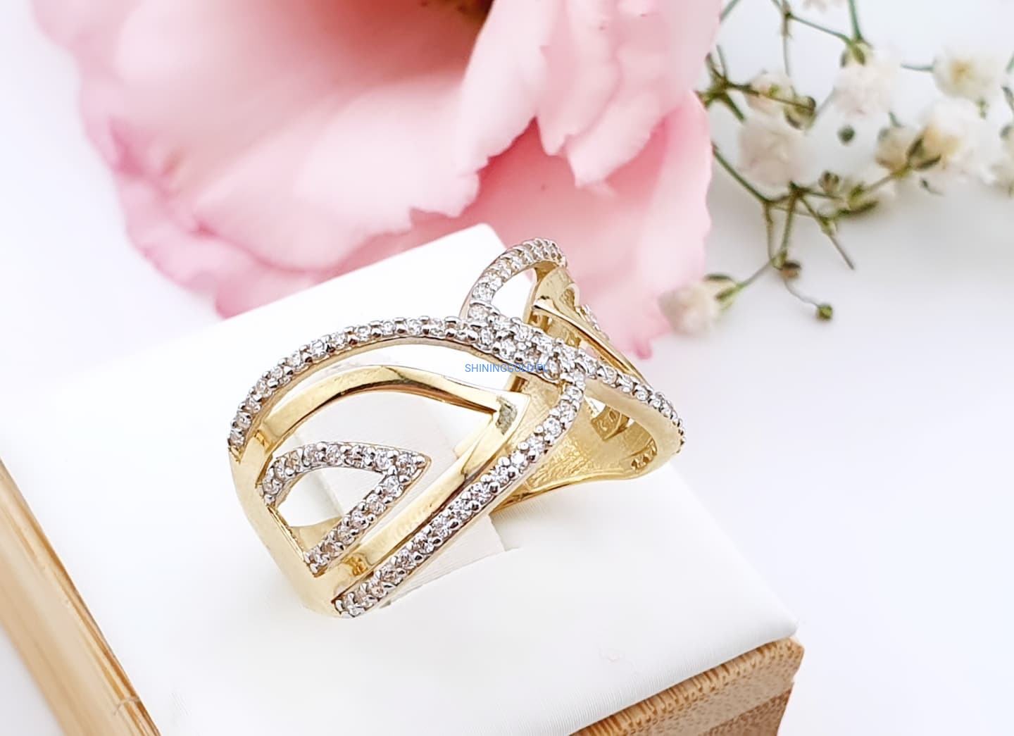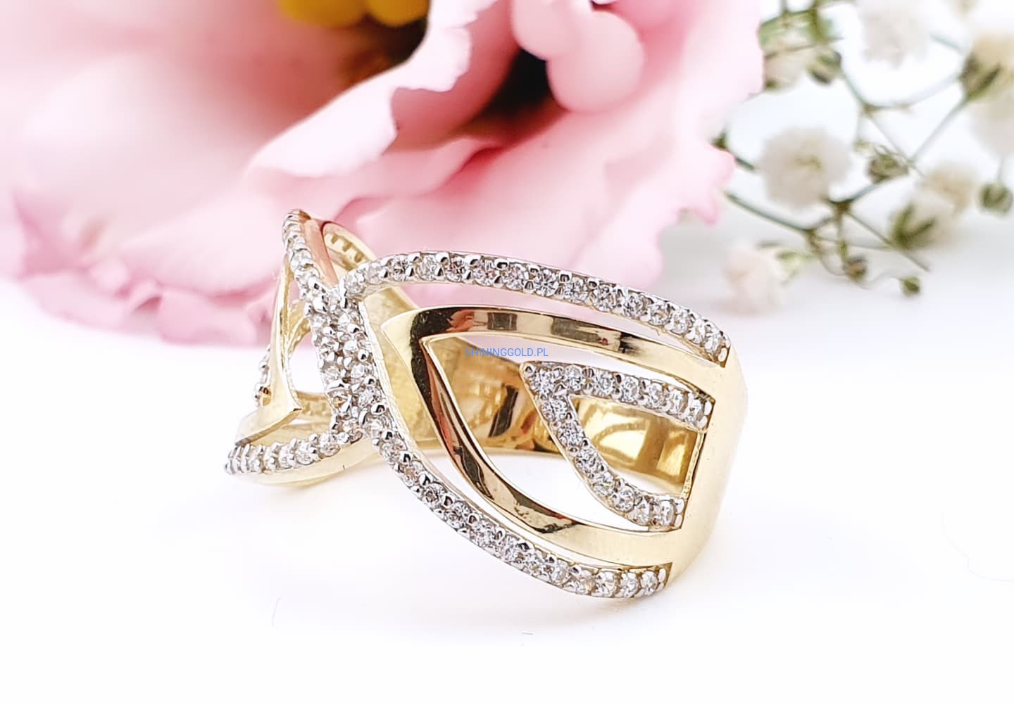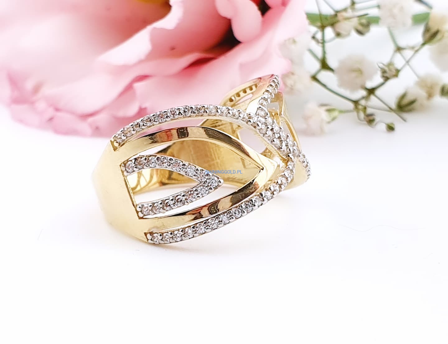 Elegancki pierścionek wykonany z wysokiej jakości żółtego złota próby 585, ozdobiony błyszczącymi cyrkoniami. Starannie zaprojektowany, by przyciągać wzrok i podkreślać styl noszącej go osoby. Idealny na wyjątkowe okazje lub jako luksusowy dodatek na co dzień.