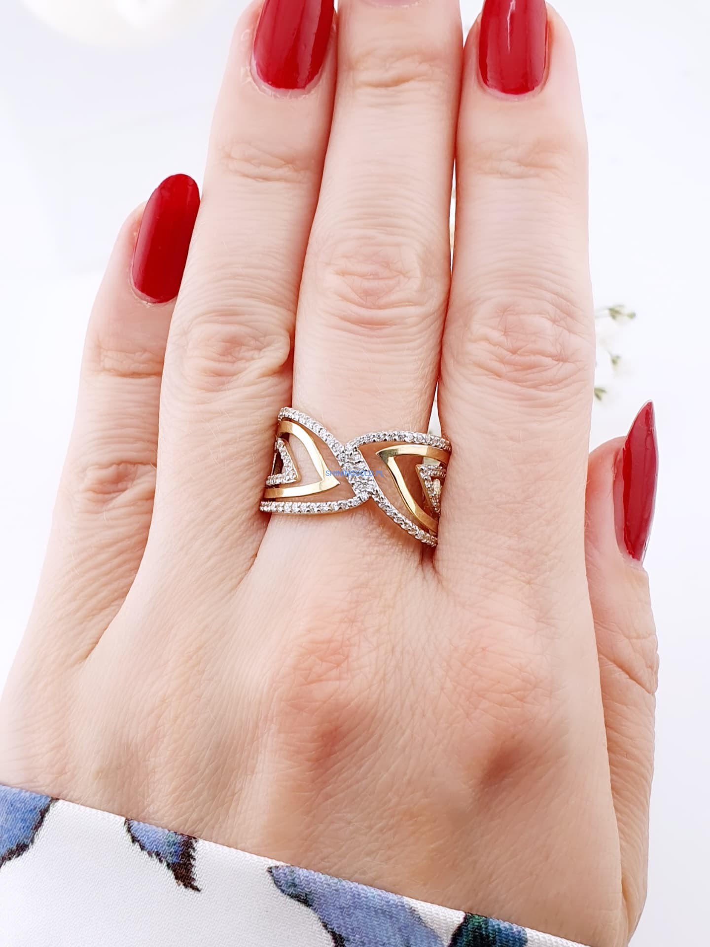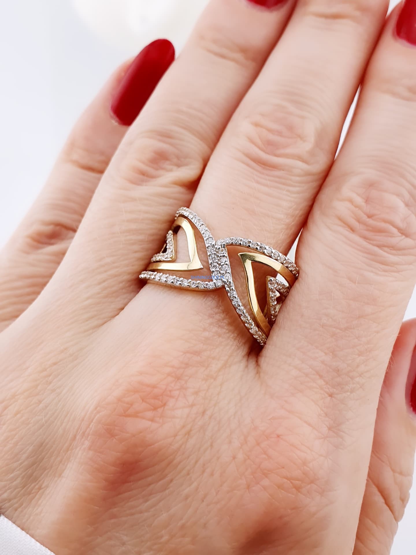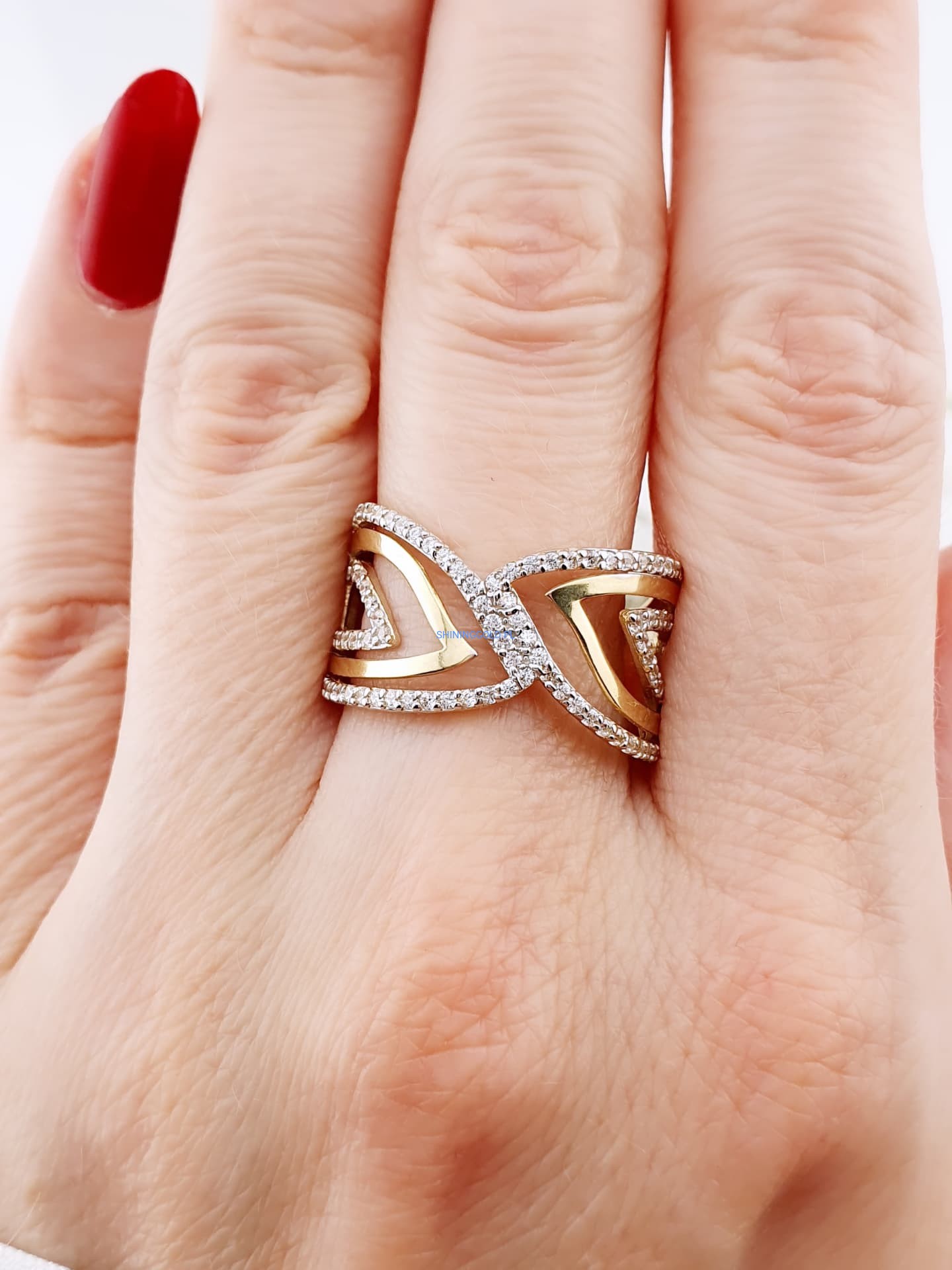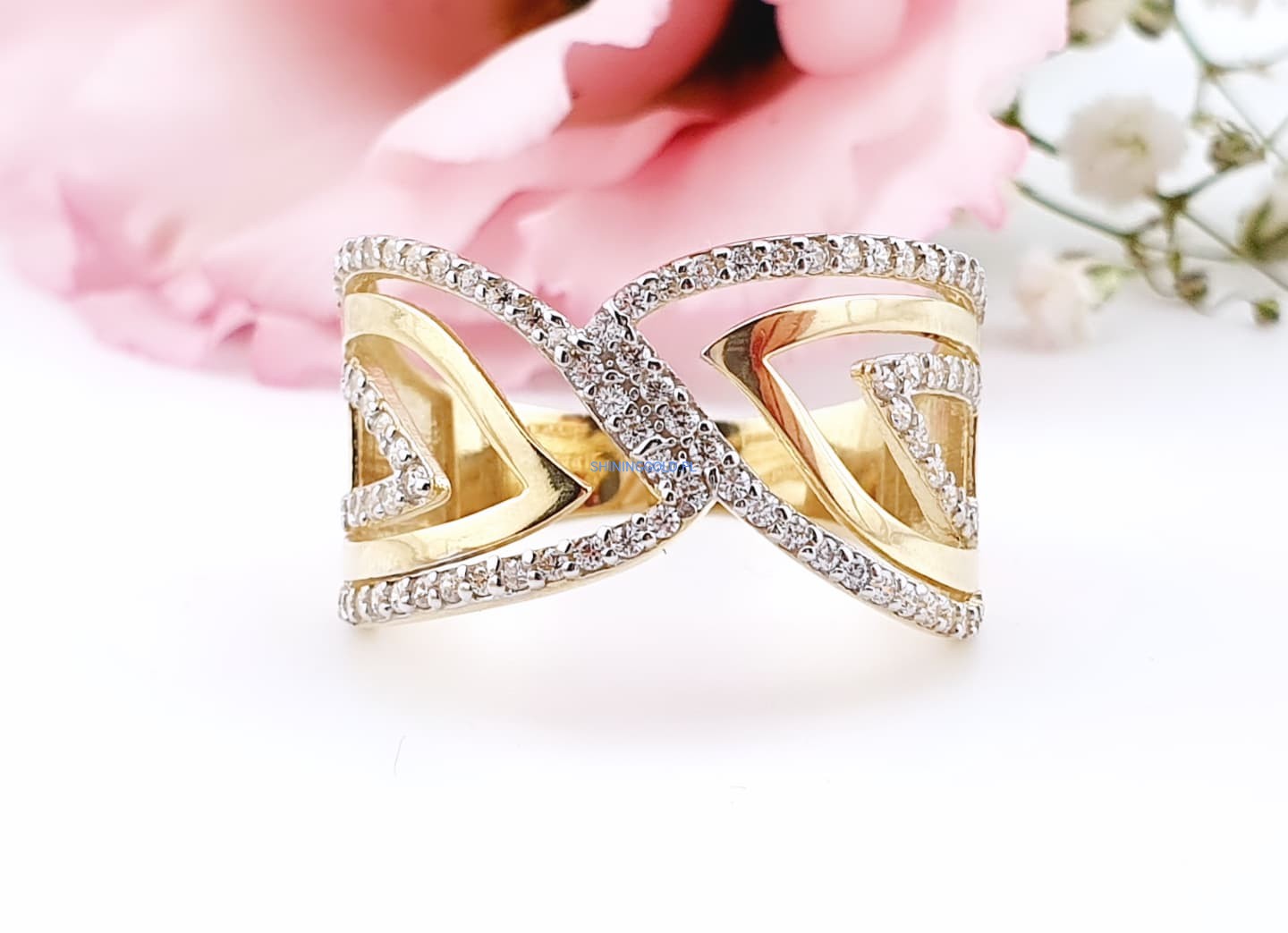 Elegancki pierścionek wykonany z wysokiej jakości żółtego złota próby 585, ozdobiony błyszczącymi cyrkoniami. Starannie zaprojektowany, by przyciągać wzrok i podkreślać styl noszącej go osoby. Idealny na wyjątkowe okazje lub jako luksusowy dodatek na co dzień.