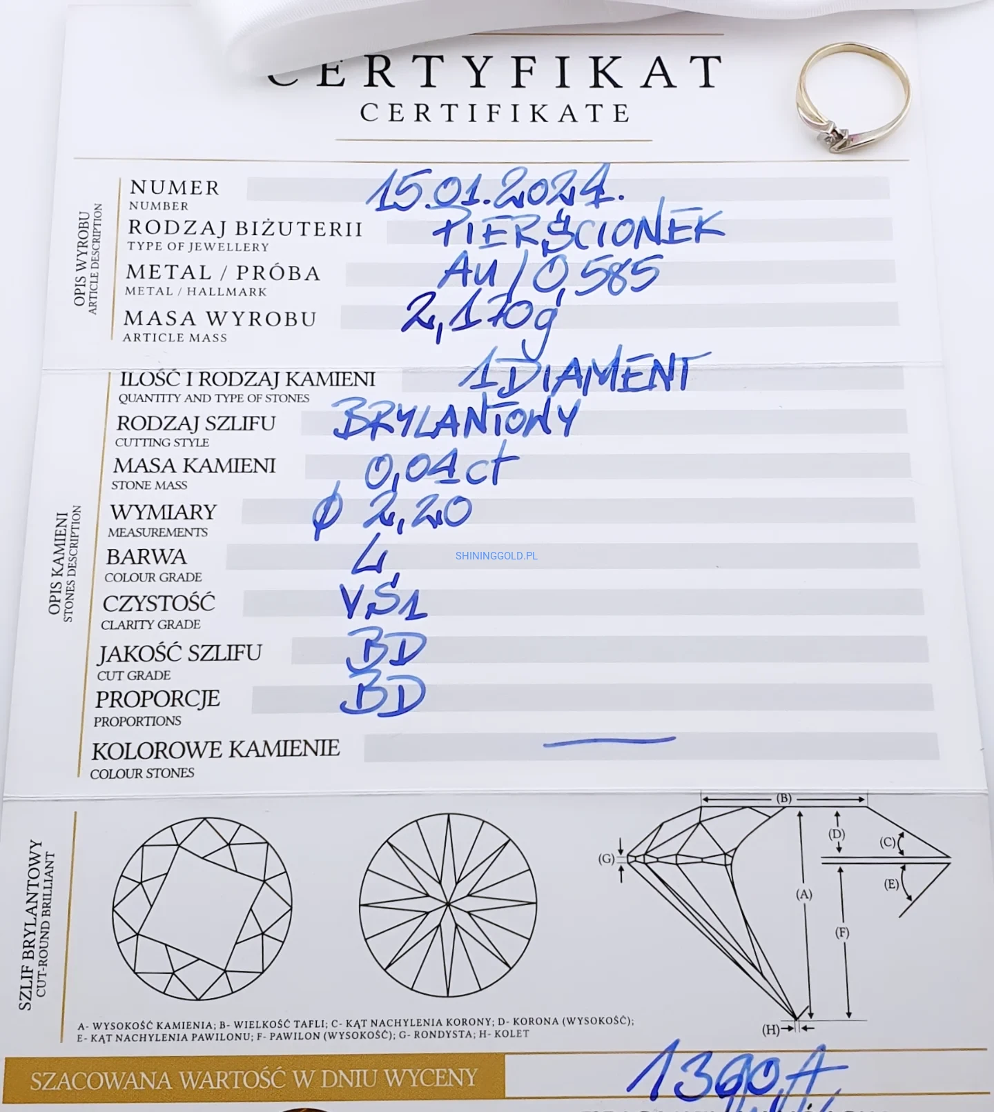 Złoty, nowy pierścionek z diamentem (1073.WS)